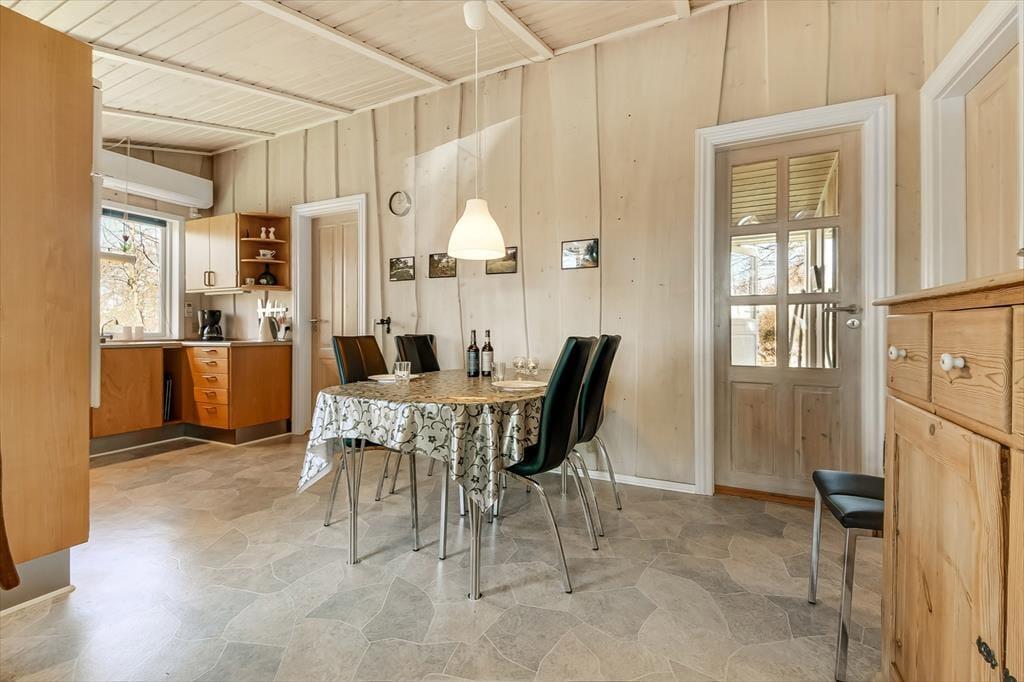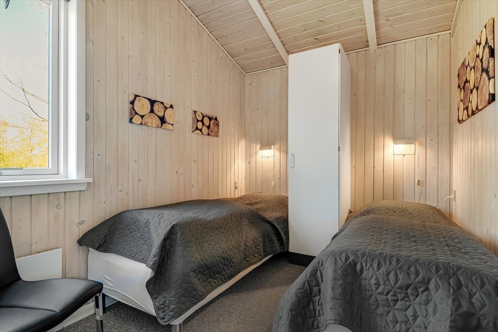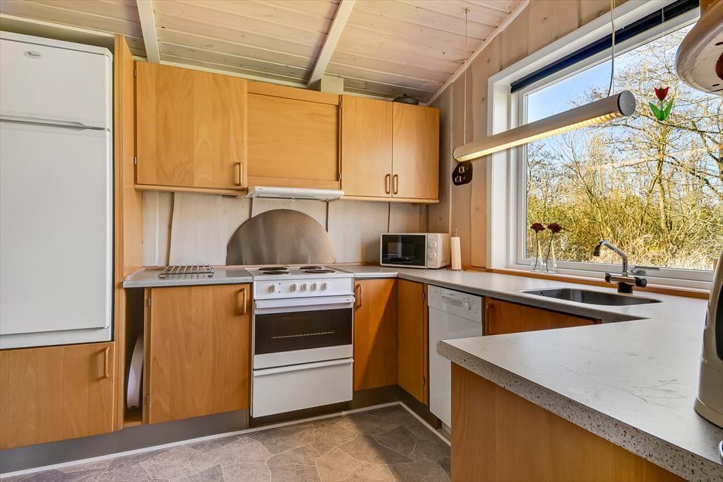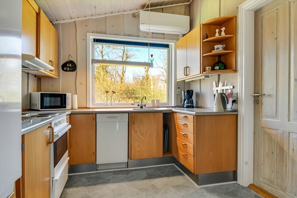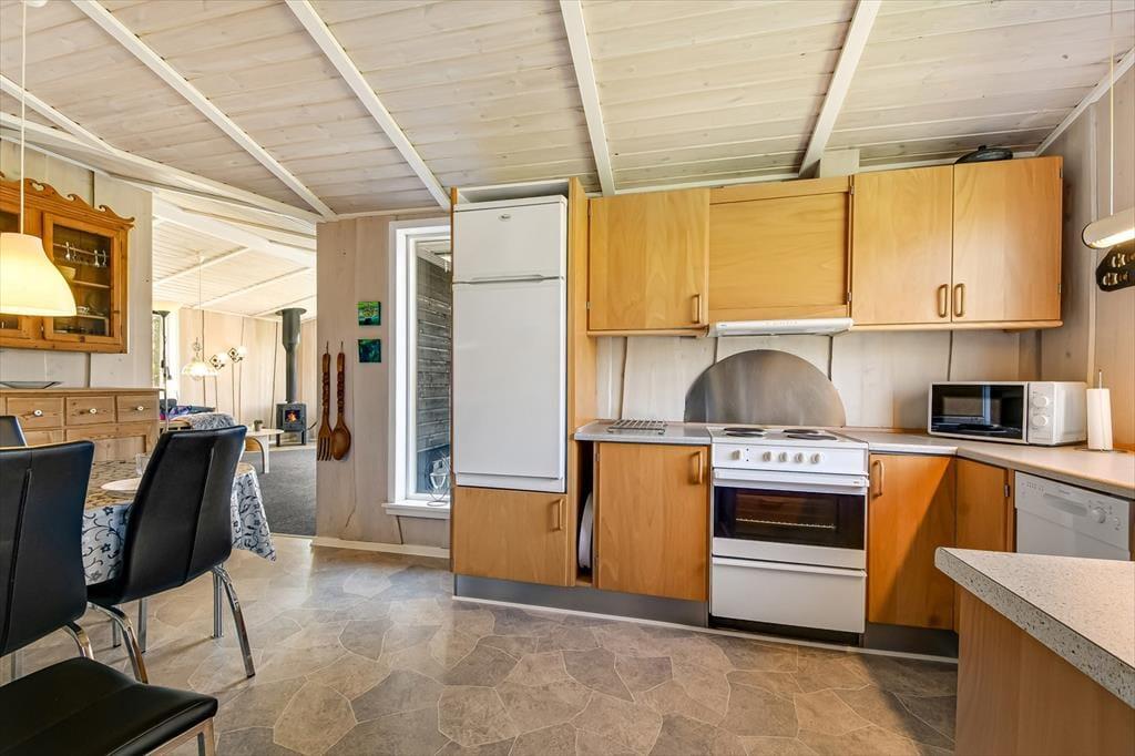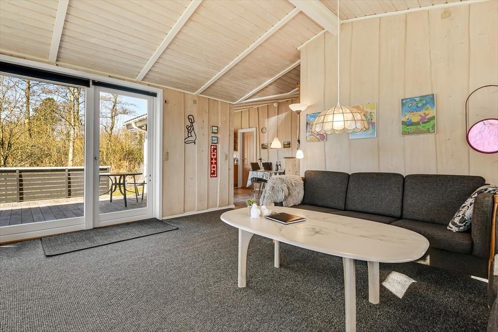 Det klassiske træsommerhus er senest blevet renoveret i 2018, så det præsenterer sig på pæn og velholdt vis. Inden døre er der lyse trælister på væggene og loft til kip, og lysindfaldet er godt – ikke mindst i stuen, hvor der er vinduer vendt mod både øst, syd og vest. Det betyder også, at I kan nyde udsigten til havens flotte løvtræer, når I slapper af i sofaen, hvilket er en dejlig påmindelse om, at I holder ferie i naturskønne og fredelige omgivelser. I stuen er der som før nævnt brændeovn, og i det åbne køkken-alrum er der varmepumpe, der både kan køle og varme alt efter behov. Badeværelsets sauna kan I tage i brug, hvis I trænger til at komme helt ned i tempo og langt væk fra hverdagen, mens tre soveværelser står klar, når det er sengetid.