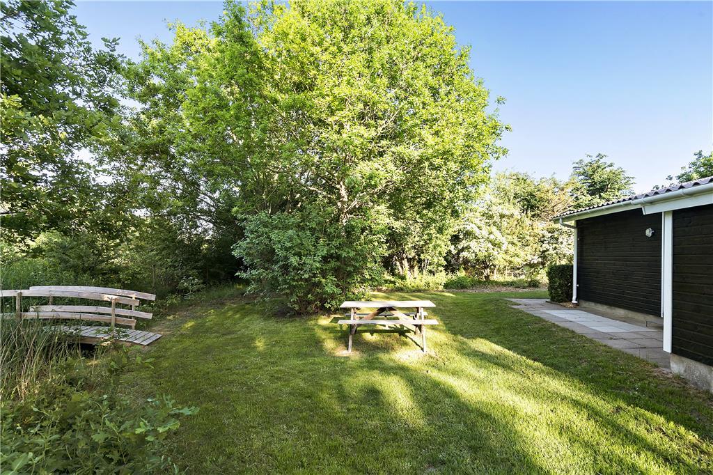 Sommerhusets træterrasse er vendt mod sydvest, så den er dejligt solrig en stor del af dagen. Trænger I til skygge, kan I slå parasollen ud, inden I sætter jer til bords ved frokosttid, og alternativt kan I finde en skyggefuld opholdsplads under træerne på havens græsplæne. I haven er der for øvrigt både sandkasse og gynger, så der er sørget for underholdning til de yngste familiemedlemmer.