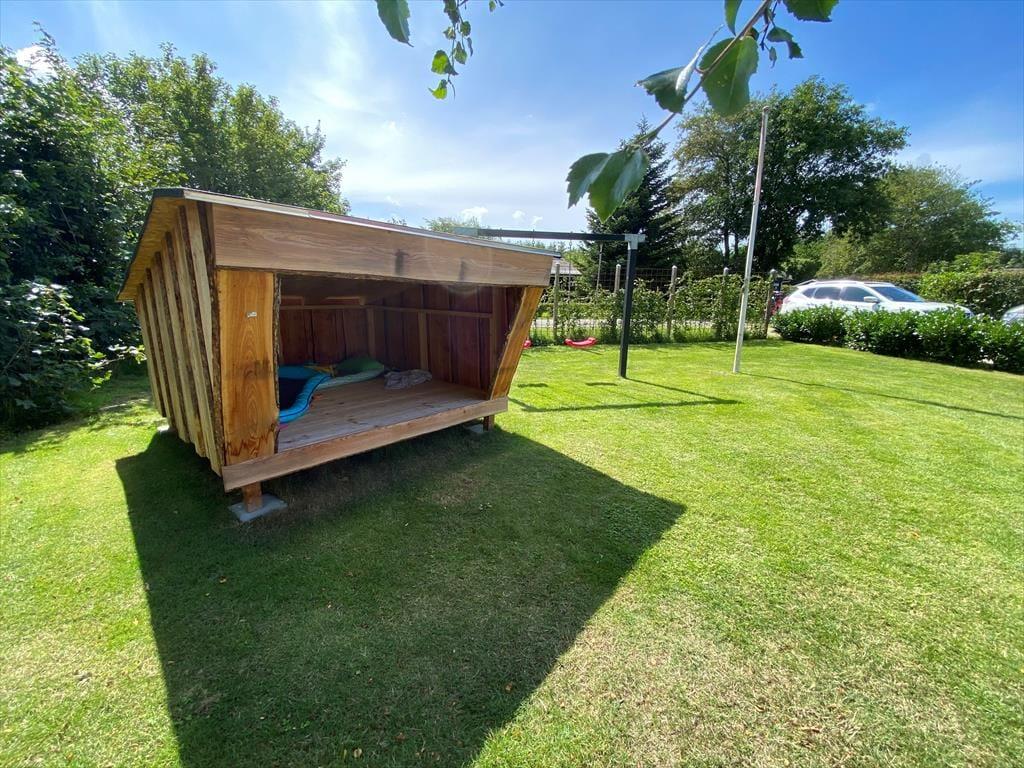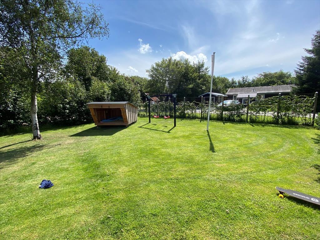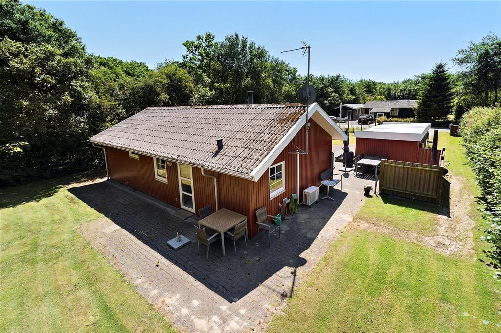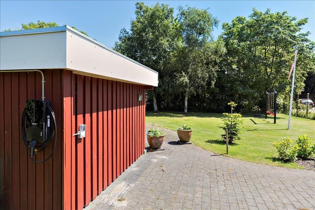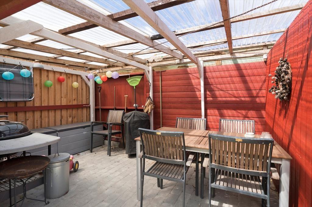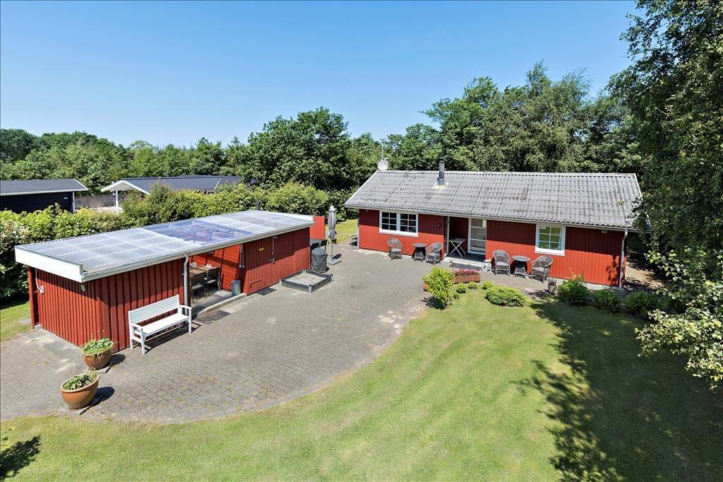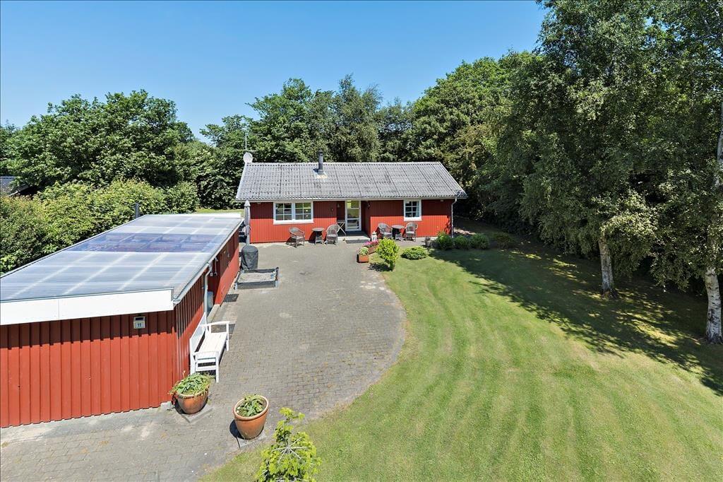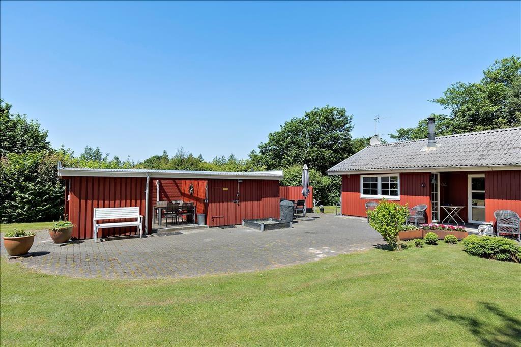 Hele vejen rundt om sommerhuset er der anlagt en dejlig terrasse, så I kan skifte opholdsplads i takt med solens placering på himlen. Faktisk breder flisebelægningen sig helt hen til carporten, hvor der også er anlagt et overdækket terrasseområde – og uanset hvor I sætter jer, kan I nyde grundens afslappede atmosfære, som både skyldes den afskærmende randbeplantning og den rolige beliggenhed for enden af en lukket sidevej.