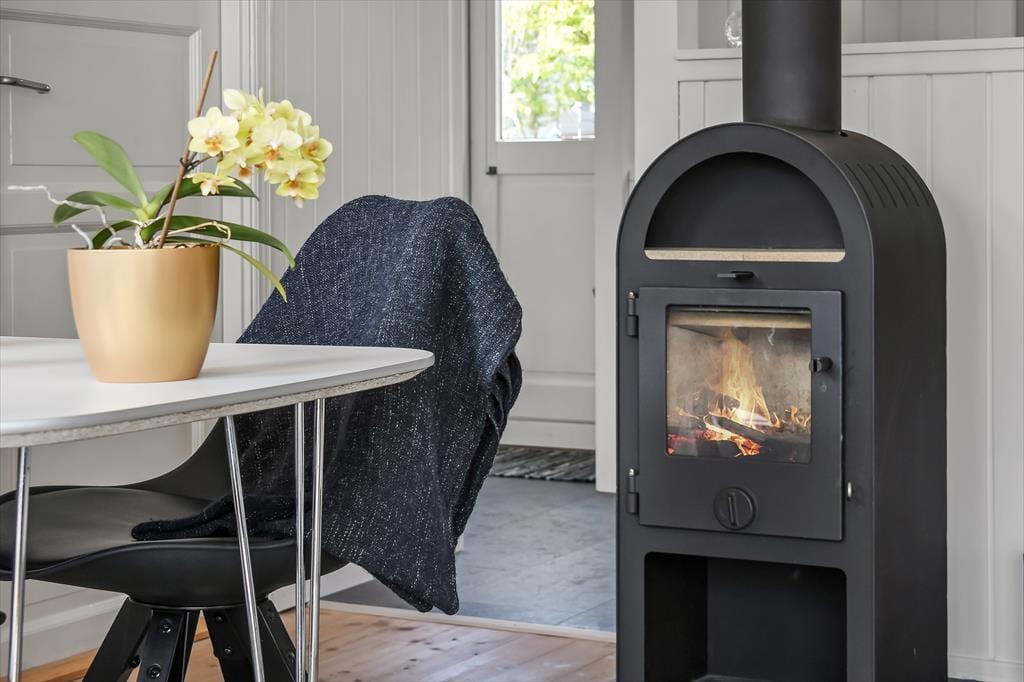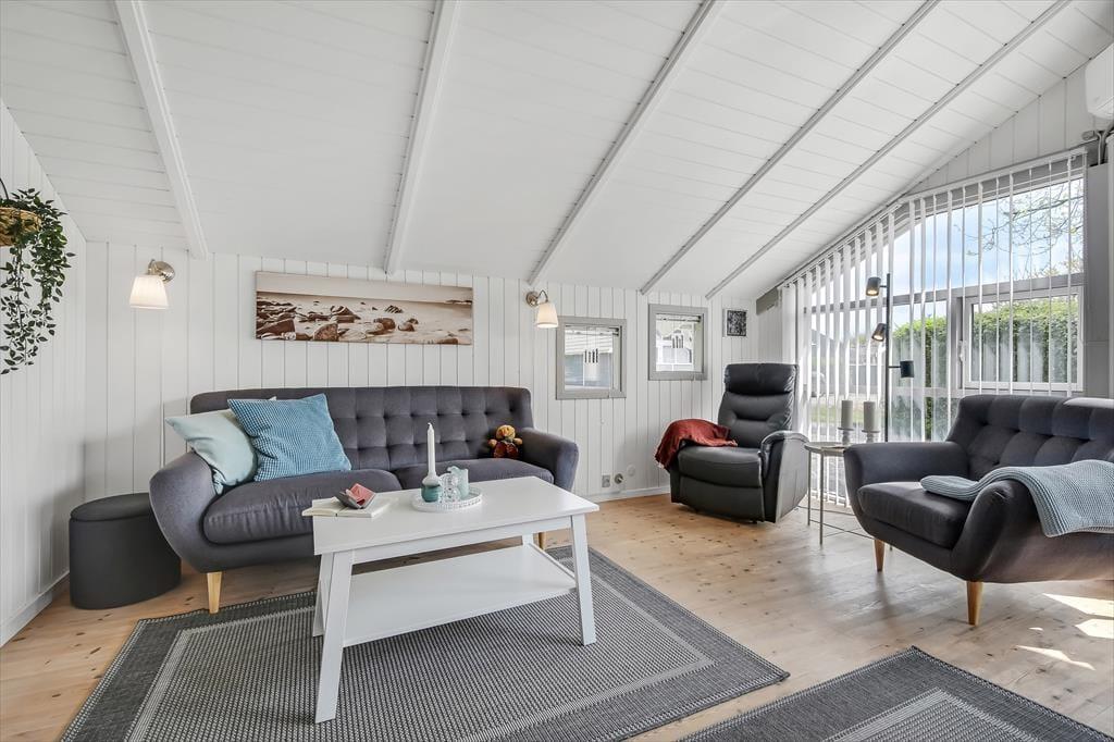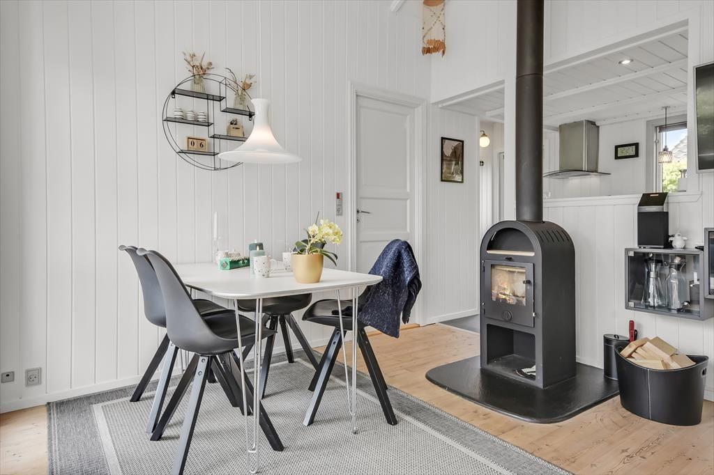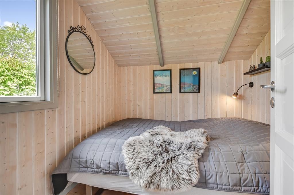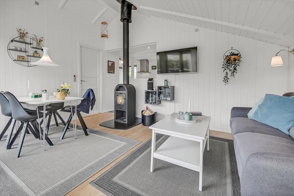 Feriehuset er ”bare” 50 m² stort – men takket være det gode lysindfald og den gennemtænkte indretning, føles pladsen ikke trang. Stuen har loft til kip, som sammen med den lyse nordiske stil og de store vinduespartier er med til at understøtte følelsen af lys og luft. Fra stuen er der direkte udgang til terrassen, som på de lune sommerdage bliver en naturlig udvidelse af opholdsarealet. Når aftenen falder på, kan I tænde op i brændeovnen, som tilfører ekstra varme og hygge. Stuen er indrettet med både spisebord, sofagruppe og læsekrog – og der er fint kig til alt det grønne udenfor. Der er to soverum i huset, og hertil kommer badeværelse med brus.