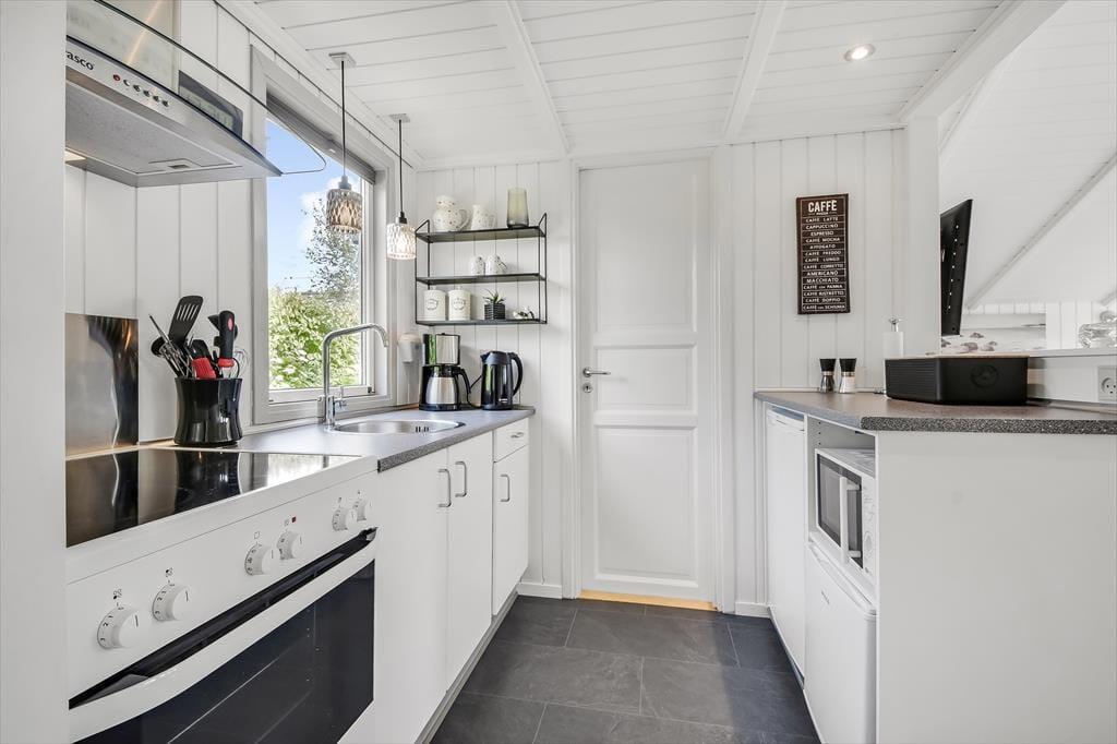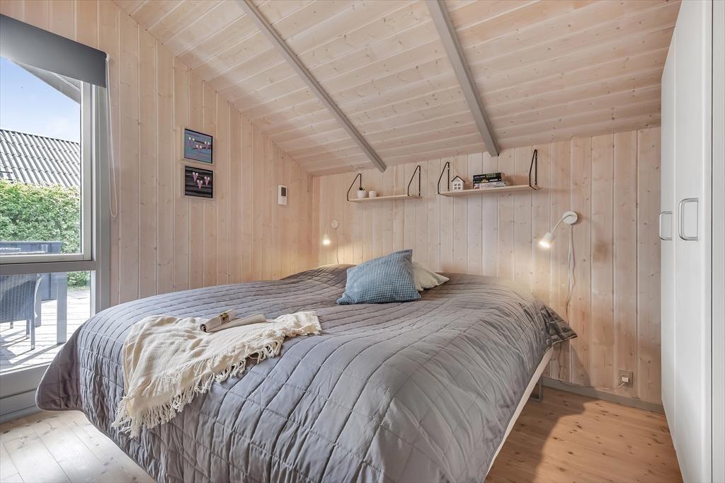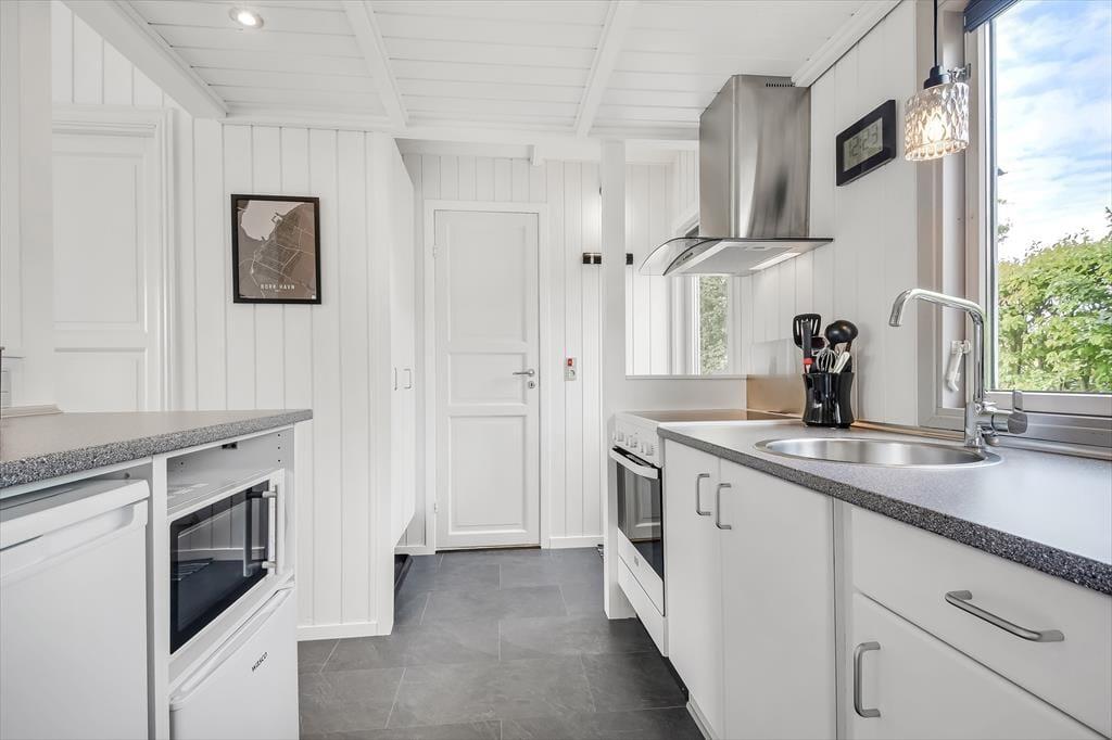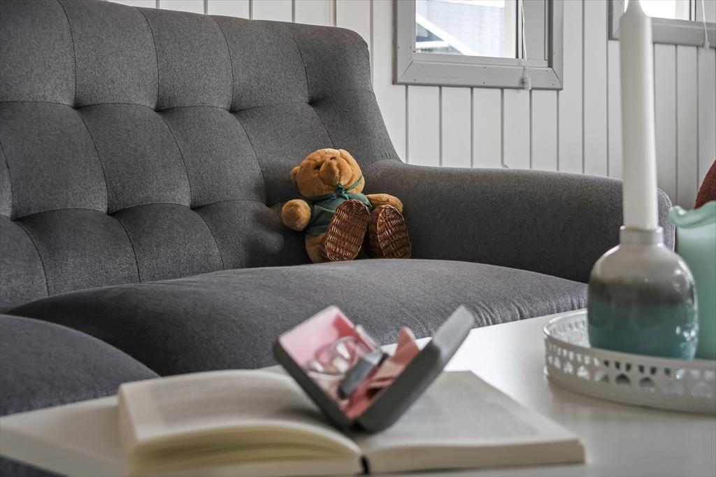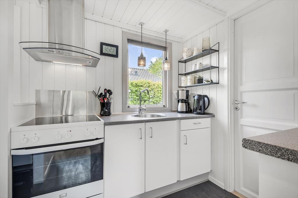 Feriehuset er ”bare” 50 m² stort – men takket være det gode lysindfald og den gennemtænkte indretning, føles pladsen ikke trang. Stuen har loft til kip, som sammen med den lyse nordiske stil og de store vinduespartier er med til at understøtte følelsen af lys og luft. Fra stuen er der direkte udgang til terrassen, som på de lune sommerdage bliver en naturlig udvidelse af opholdsarealet. Når aftenen falder på, kan I tænde op i brændeovnen, som tilfører ekstra varme og hygge. Stuen er indrettet med både spisebord, sofagruppe og læsekrog – og der er fint kig til alt det grønne udenfor. Der er to soverum i huset, og hertil kommer badeværelse med brus.
