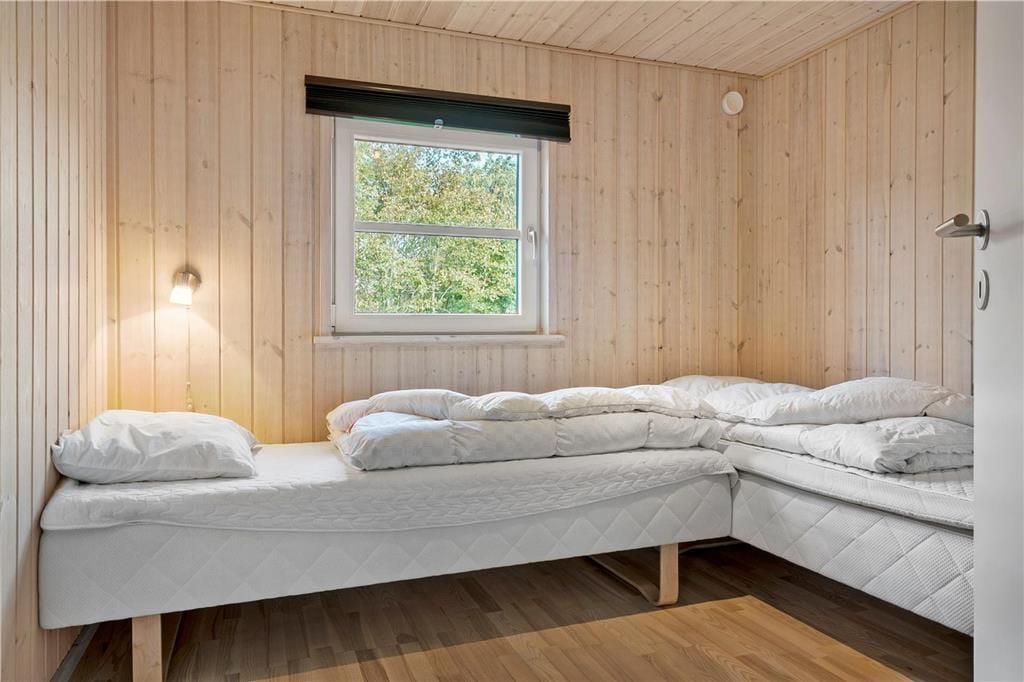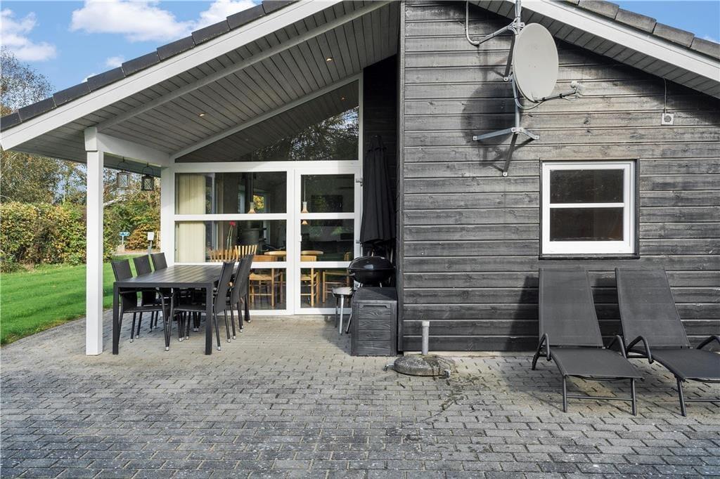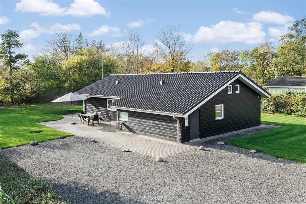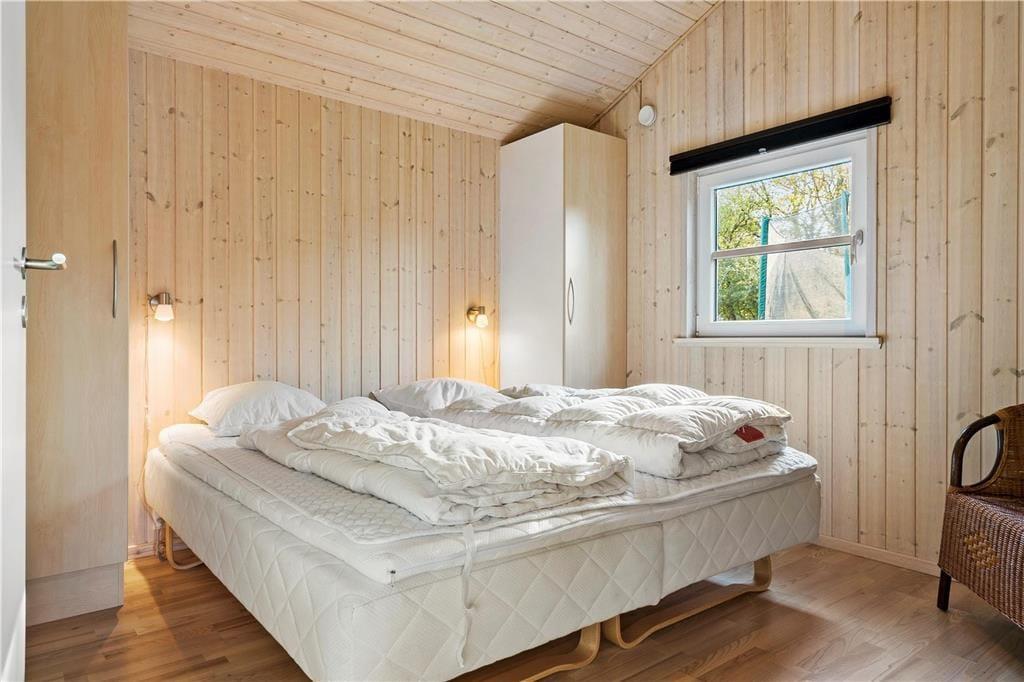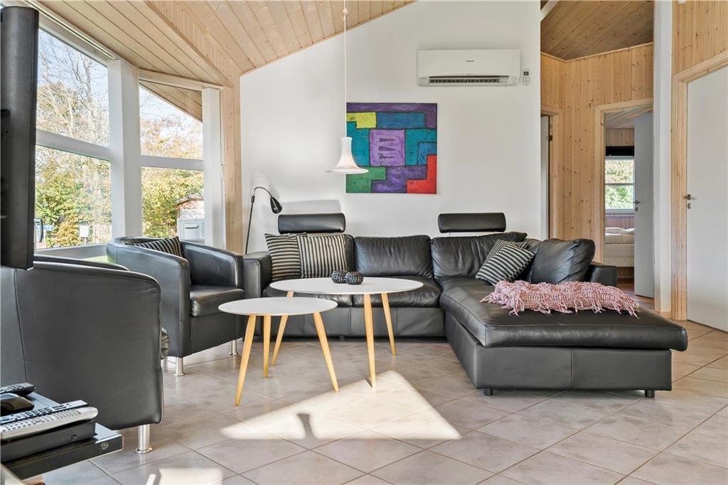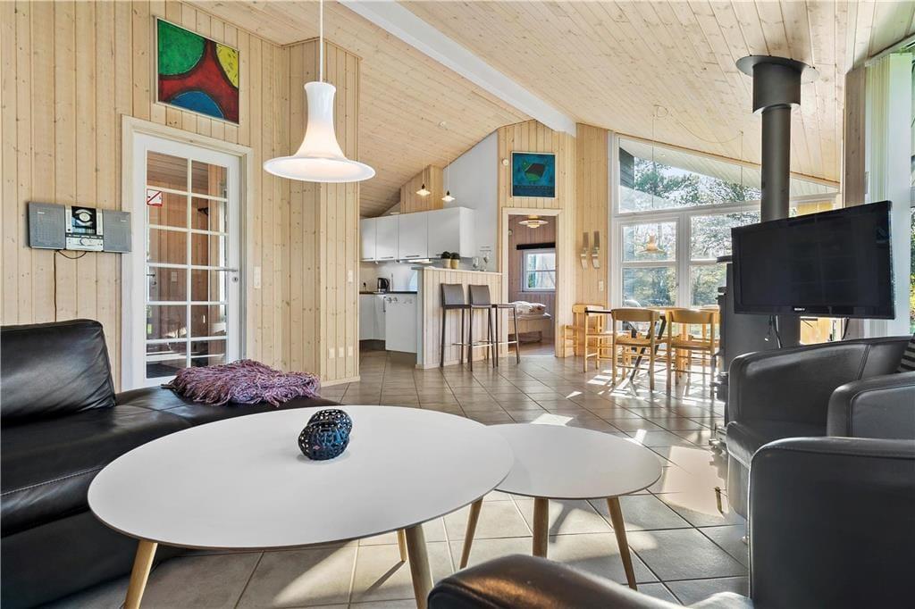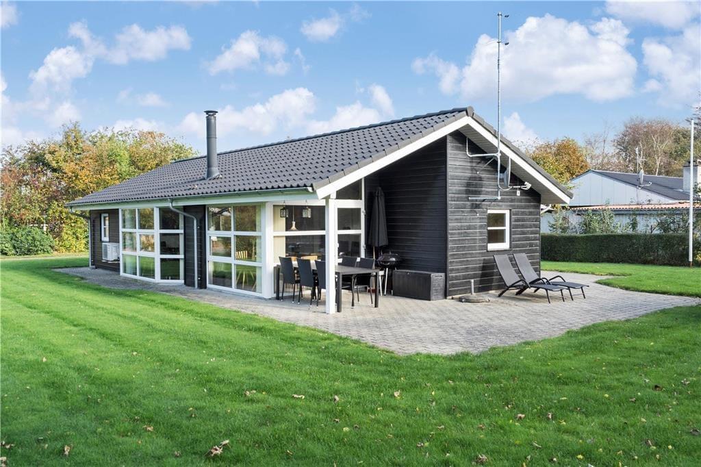 Sommerhuset er opført i 2014 og som man kan forvente af et moderne byggeri, er det lyst og indbydende inden døre. På klassisk sommerhusmanér er der brændeovn og en varmepumpe med aircondition. De store vinduespartier og den flotte loftshøjde bidrager til en behagelig atmosfære. Som en lækker detalje er der gulvvarme i hele huset. I det herlige opholdsrum er køkkenet integreret med stuen, så det er her, I kan hygge jer med madlavning, lækre måltider og efterfølgende sofaafslapning. For at gøre aftenen helt perfekt, kan I slutte af med et spabad på det flotte badeværelse, inden I går til ro på et af sommerhusets tre soveværelser.