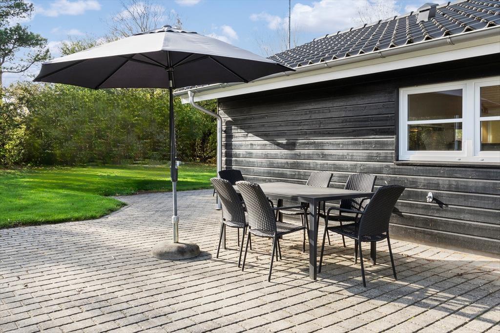 Indbyder vejret nærmere til solbadning frem for spabad, er der masser af plads til at nyde livet på den 1000 m2 store grønne grund. Leg og boldspil kan foregå på den store græsplæne, hvor der også står et gyngestativ til de yngste feriegæster. De mere tilbagelænede stunder kan udfolde sig på den flisebelagte terrasse, der er rundt omkring næsten hele huset. En del af terrassen er overdækket og der er både parasol, havemøbler og liggestole til rådighed.