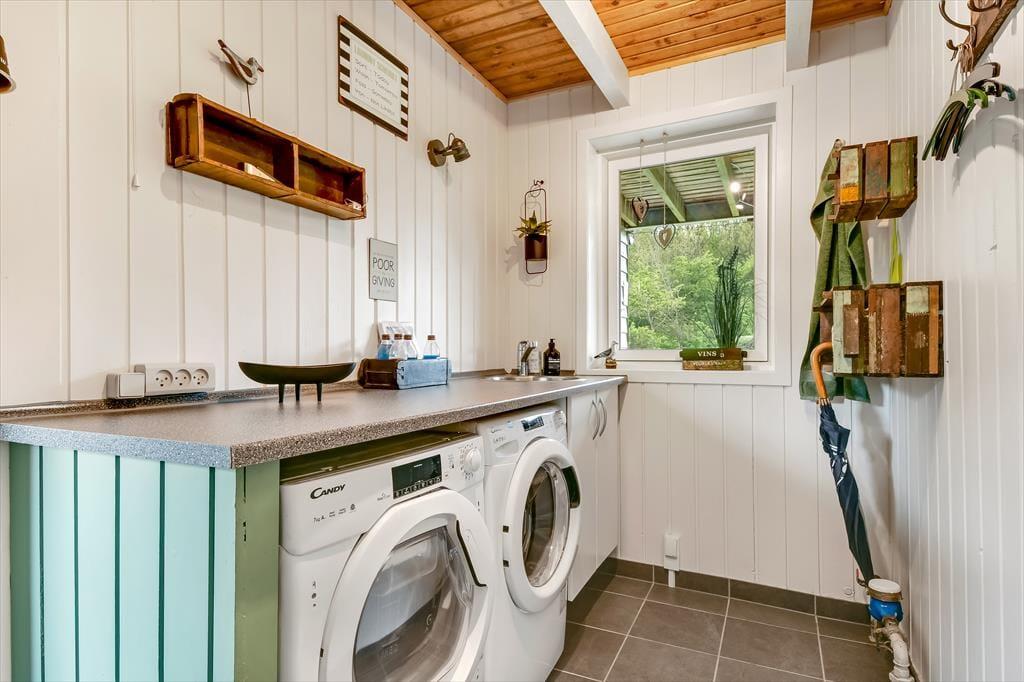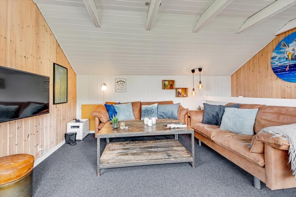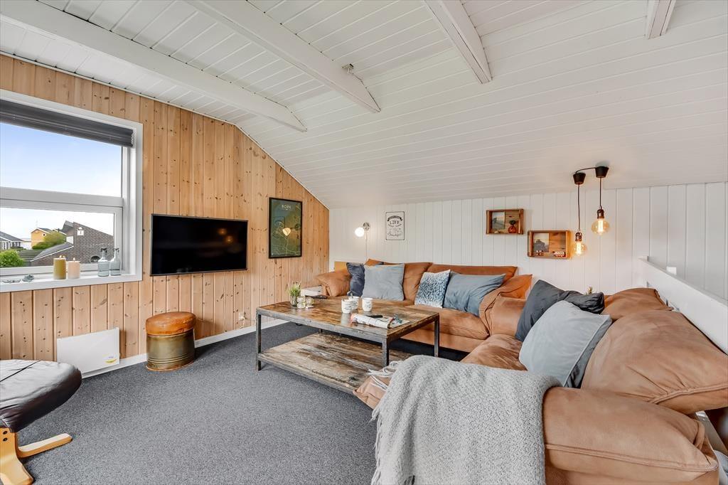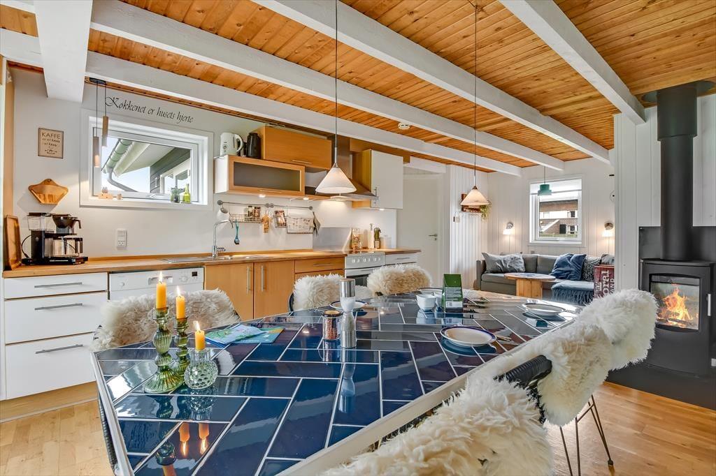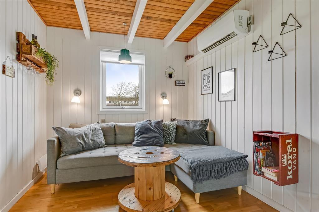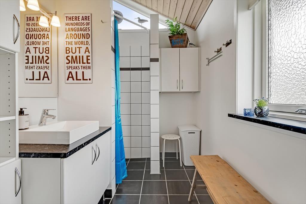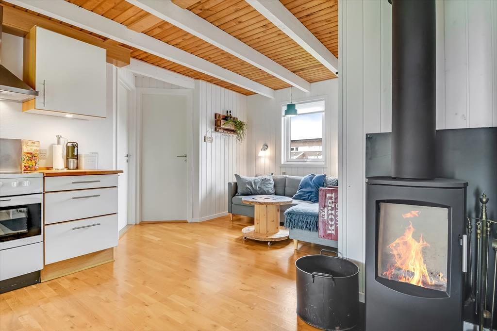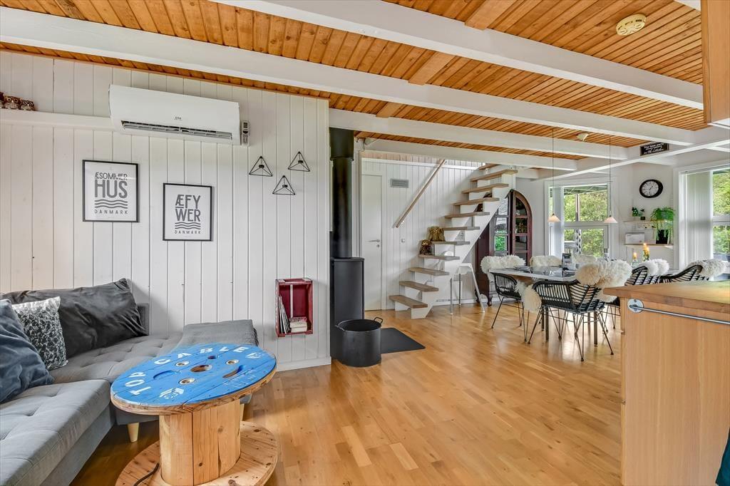 Sommerhuset er opført i to plan, som i alt byder på 84 veludnyttede kvadratmeter. Takket være seneste renovering i 2019 fremstår huset pænt og velholdt, og planløsningen er gennemtænkt, så op til seks feriegæster kan finde sig godt til rette inden døre. Stueplanets to soveværelser er begge indrettet med gode dobbeltsenge, og derudover venter der et ekstra værelse med alkove på førstesalen. Badeværelset har indlagt gulvvarme, så I ikke får kolde tæer, når I træder ud af brusebadet, og på praktisk vis er der for øvrigt et bryggers med vaskemaskine, tørretumbler og håndvask i huset. I stueplan ligger køkken og stue forenet som et stort og stemningsfuldt opholdsrum med brændeovn, spisebord og sofaafdeling. Går I op på førstesalen, har I endnu en stue at slænge jer i med bløde siddemøbler og TV.
