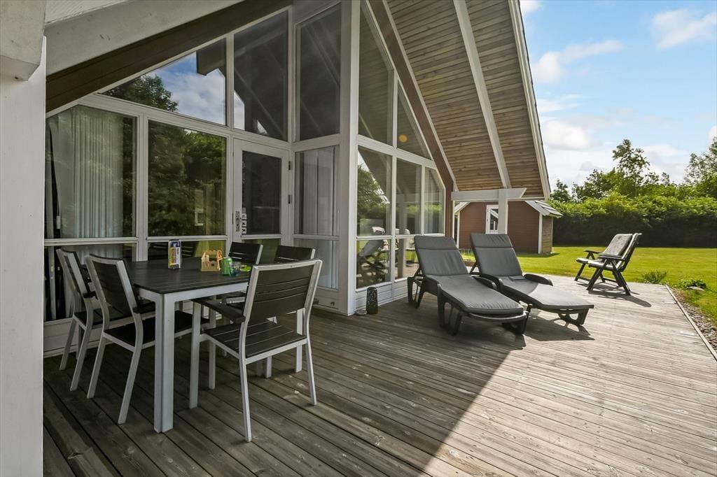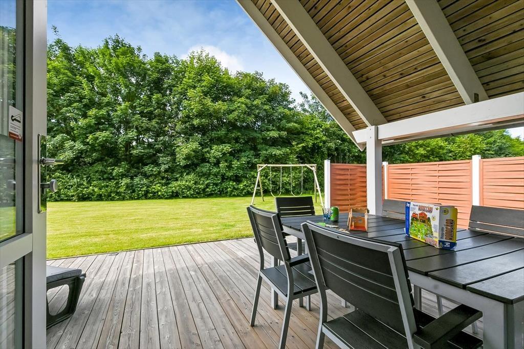 På en solrig dag er det oplagt at flytte ferietilværelsen ud på den store og delvist overdækkede træterrasse, der smyger sig om tre af sommerhusets sider. Grunden er på 1200 m2, så der er god plads til at lege og spille bold på græsplænen, og der står også et gyngestativ til de yngste feriegæster.
