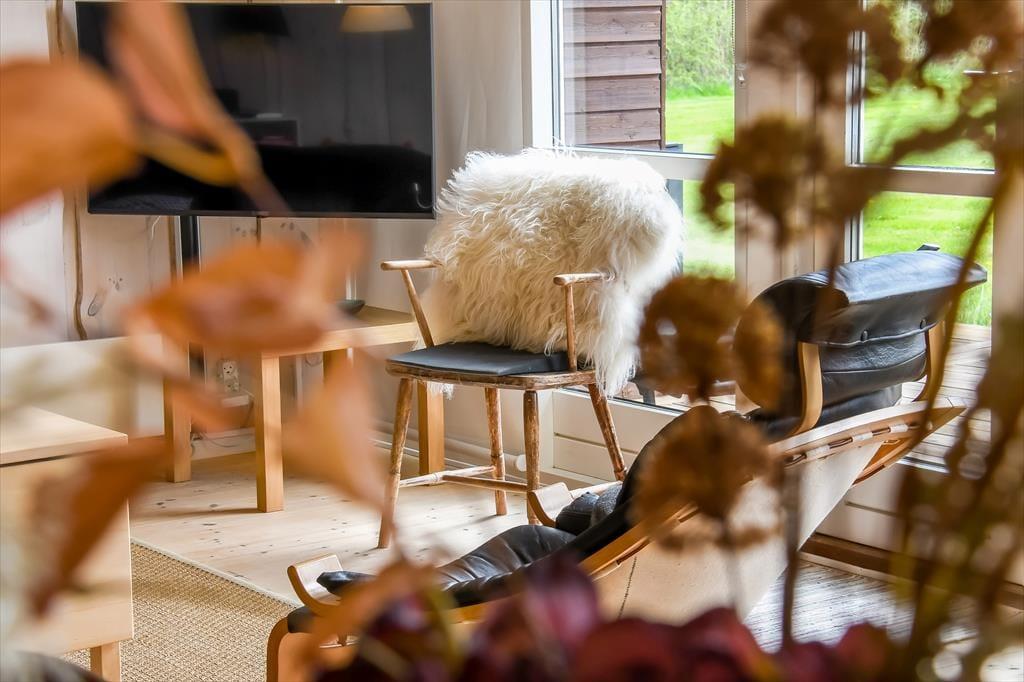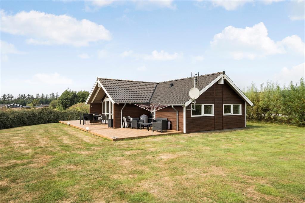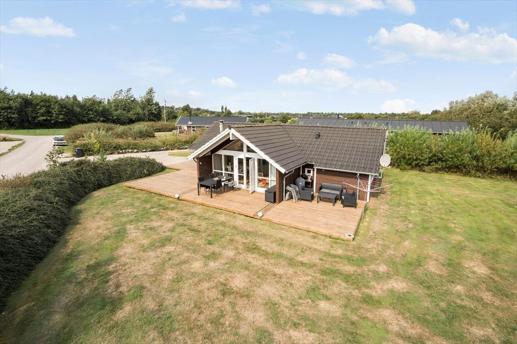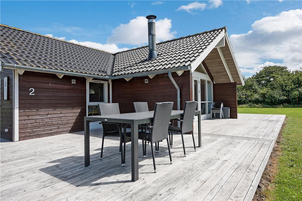 Fra stuen kan I træde lige ud på træterrassen, som er en stor og skøn model, der breder sig om tre af sommerhusets sider. En del af terrassen er overdækket og resten er åben, så der er flere valgmuligheder, når I vil nyde livet i havemøblerne eller liggestolene.