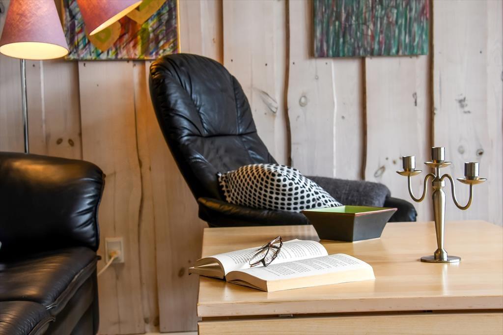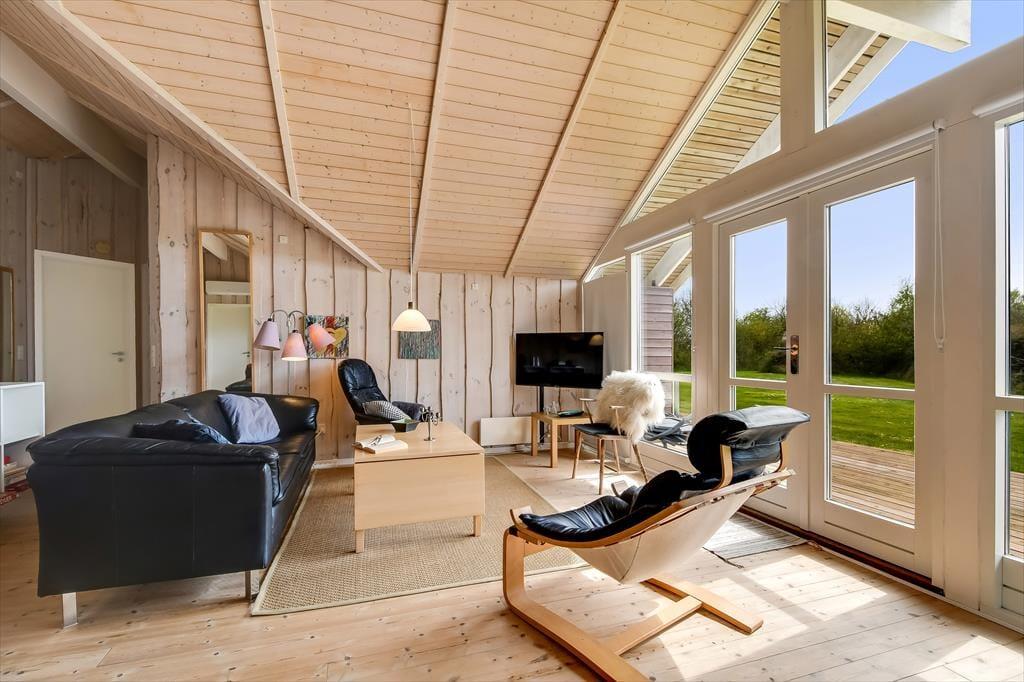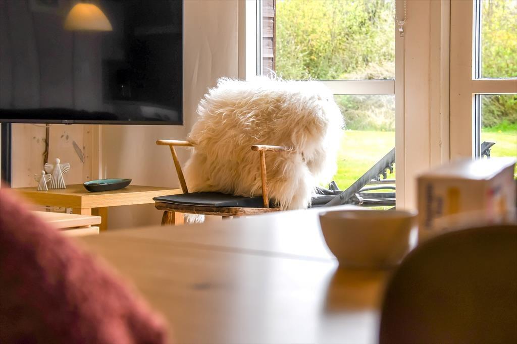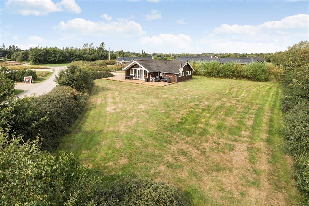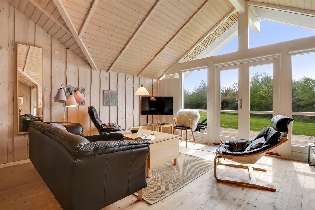 Fra stuen kan I træde lige ud på træterrassen, som er en stor og skøn model, der breder sig om tre af sommerhusets sider. En del af terrassen er overdækket og resten er åben, så der er flere valgmuligheder, når I vil nyde livet i havemøblerne eller liggestolene.