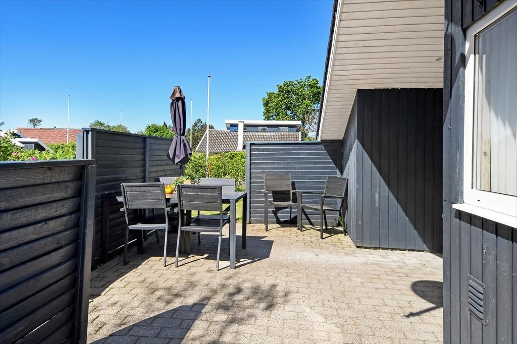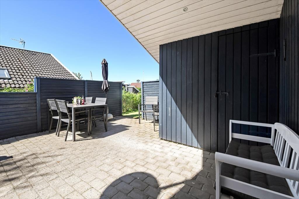 Afslapningsstunderne kan også foregå ude i det fri på den lille, men velanlagte grund. Her er der både en græsplæne at lege på og flisebelægning til bilen, mens den sydvendte, ugenerede terrasse er det helt rette sted til solbadning og sommerfrokoster.