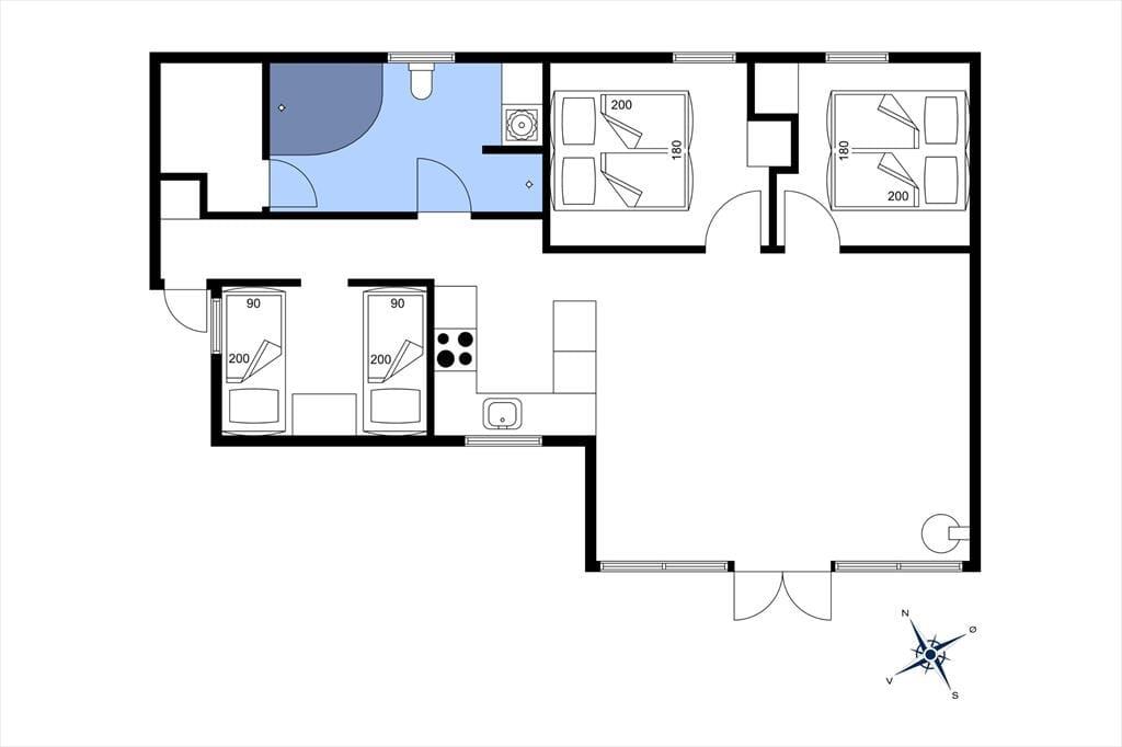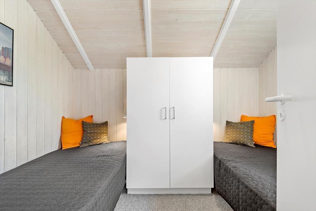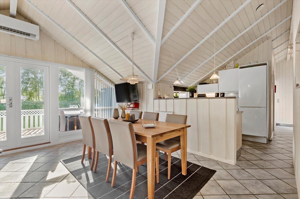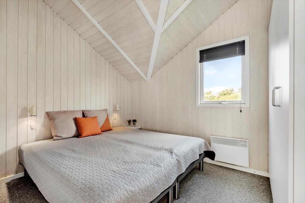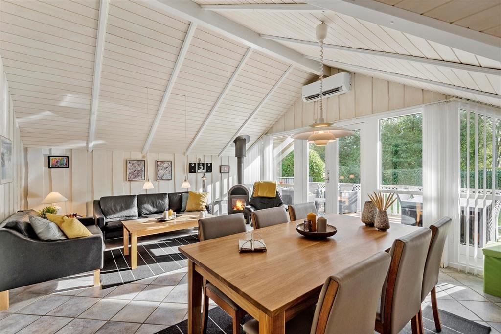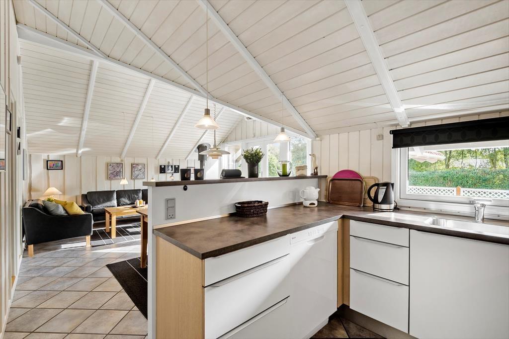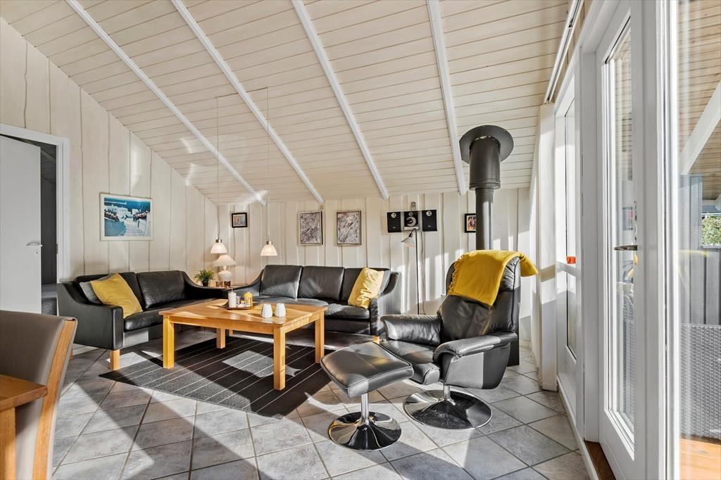 Sommerhusets 73 m² præsenterer sig på pæn og velholdt vis, og de lyse trævægge og de skrå lofter er med til at skabe en hyggelig og afslappet feriestemning i alle rum. Samlingspunktet i huset er stuen, der er udstyret med brændeovn, varmepumpe og havedør til terrassen. Et veludstyret køkken er også integreret i opholdsrummet – så I kan hurtigt smutte hen for at finde lidt lækkert i køkkenskabene, hvis I får lyst til en snack, når I ser film i sofaen. Trænger I til at slappe fuldstændigt af, kan I gå en tur i saunaen og tage et spabad på badeværelset, der desuden er indrettet med bruseniche og vaskemaskine. På de tre soveværelser er der i alt seks sengepladser, og så er der for øvrigt både barnestol og barneseng til rådighed til småbørnsfamilier.