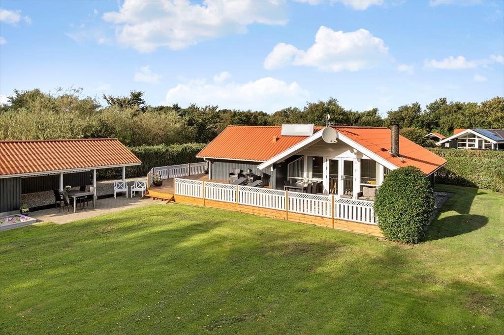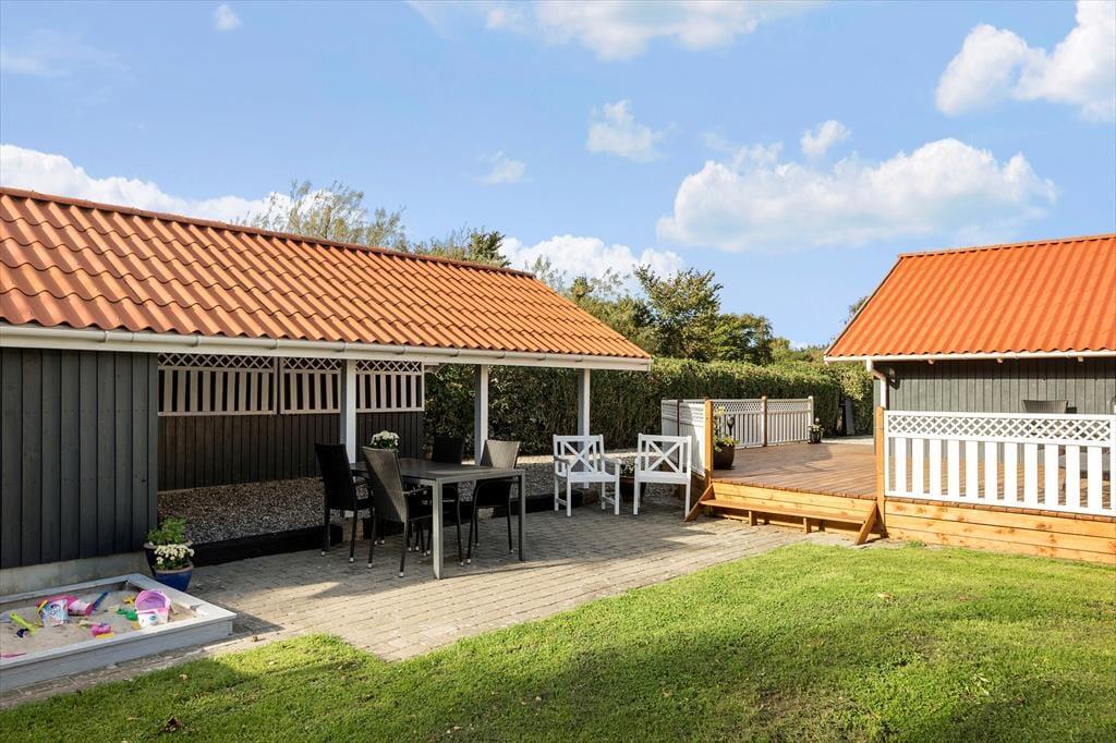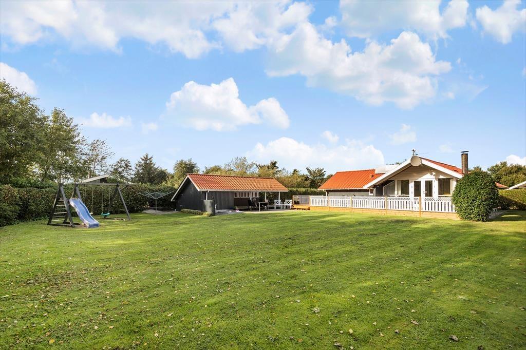 Der er også tænkt på de yngste familiemedlemmer ude i det fri, for udover en stor græsplæne er der sandkasse og gynger i haven. En tæt hæk omkranser grunden, så I kan nyde ferielivet på ugeneret vis, uanset om I spiller havespil eller slapper af på den store, sydvendte terrasse.