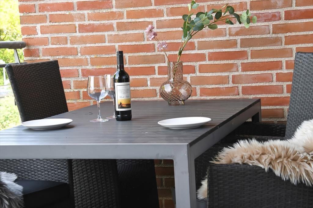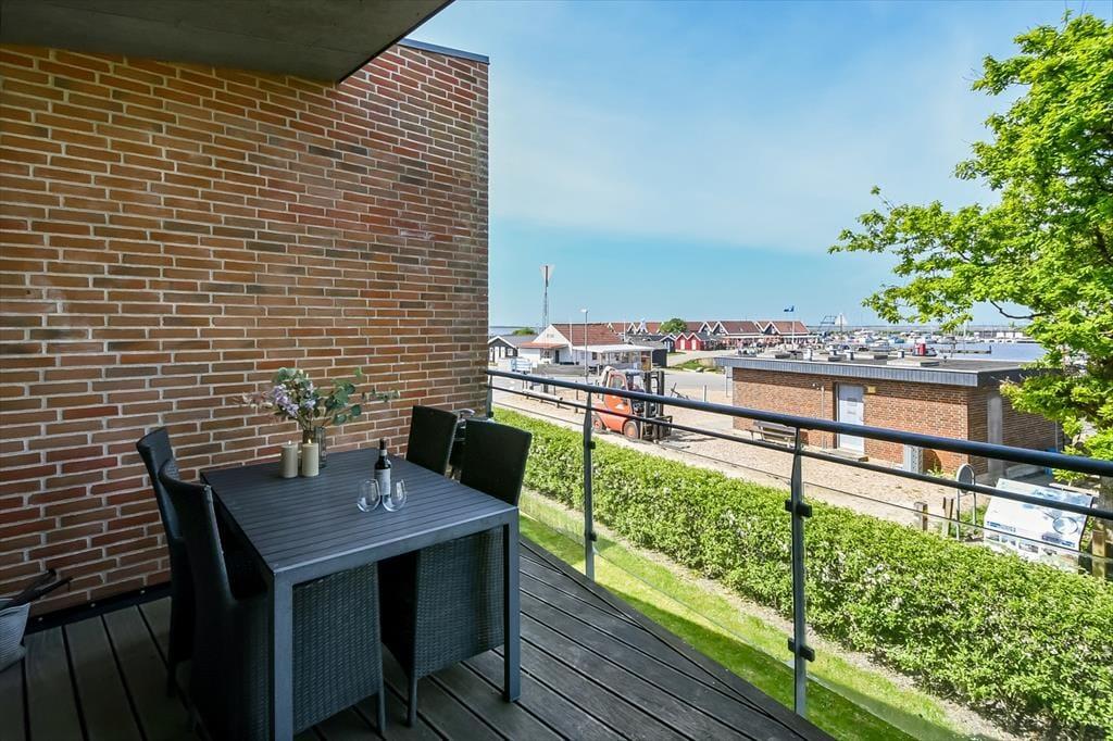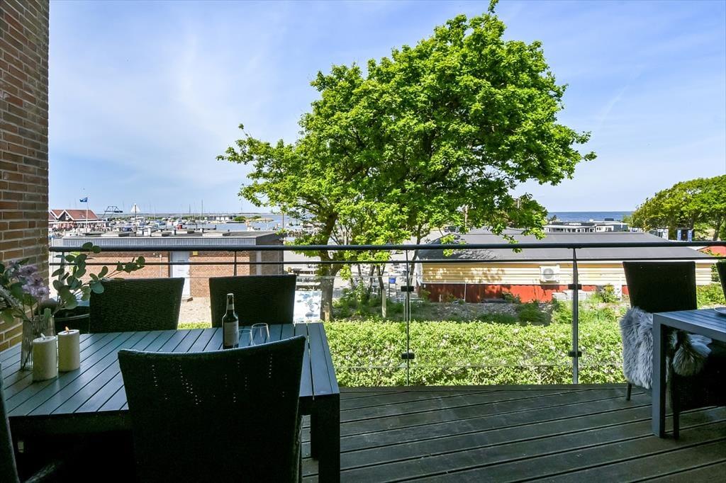 Fra førstesalens stue kan I træde direkte ud på en stor overdækket altan. Her kan I sidde og følge med i livet på og i havnen, mens I nyder det gode vejr og den afslappende feriestemning. Vil I hellere sidde i jordhøjde til en forandring, kan I rykke ned på lejlighedens to terrasser, der ligger henholdsvis mod vest og øst og derfor er solrige på forskellige tider af dagen.