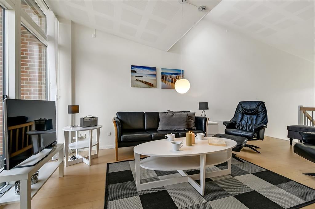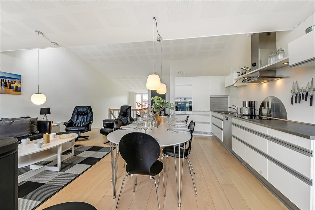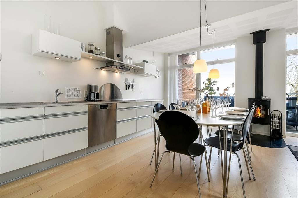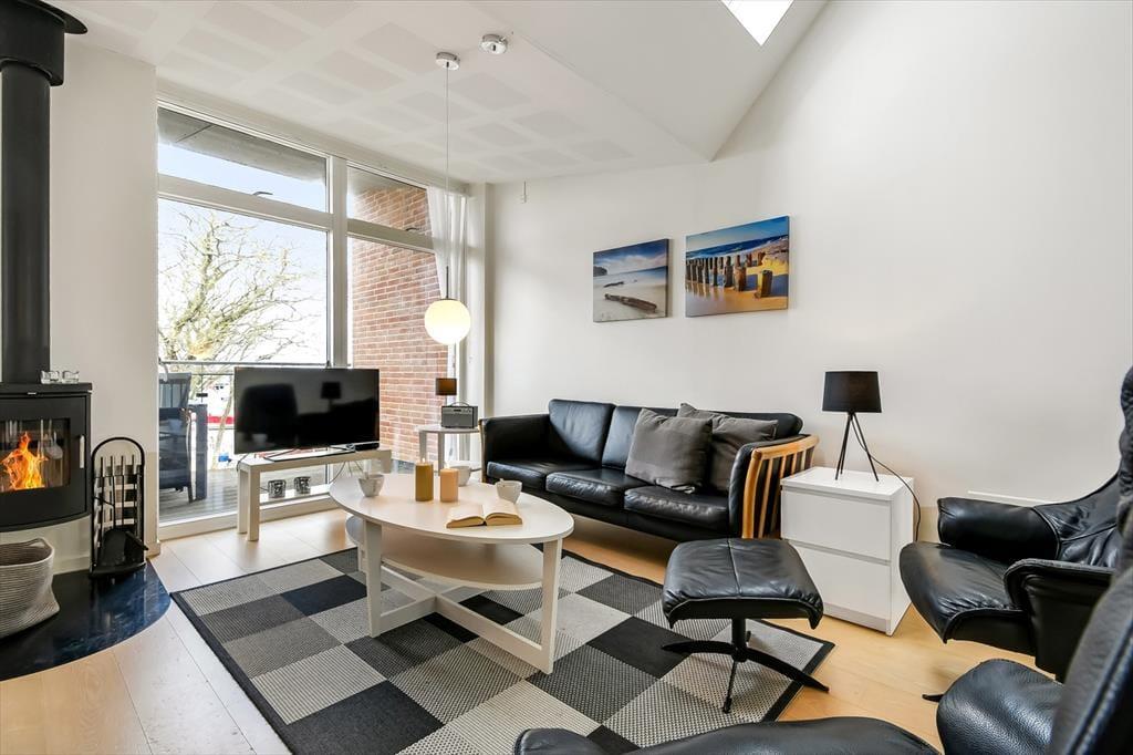 Den attraktive beliggenhed i første parket til vandet er kun en af mange kvaliteter, for lejligheden er nemlig et rummeligt og særdeles velindrettet eksemplar på hele 132 m2. Både i stueplan og på førstesalen er lysindfaldet gennem de store vinduespartier særdeles godt – men det er selvfølgelig på førstesalen, at udsigten er mest forrygende. Her ligger et stort opholdsrum med stue og køkken i åben forbindelse, og ligesom de øvrige rum er det smagfuldt indrettet med moderne og komfortabelt møblement, inklusiv en flot brændeovn. De fire soveværelser har i alt plads til otte personer, og hvis I er mange samlet, er det rart, at der er to badeværelser til rådighed i lejligheden. Det største badeværelse er endda udstyret med et spabad, så I kan forkæle jer selv med en rigtig wellness-stund i ny og næ.