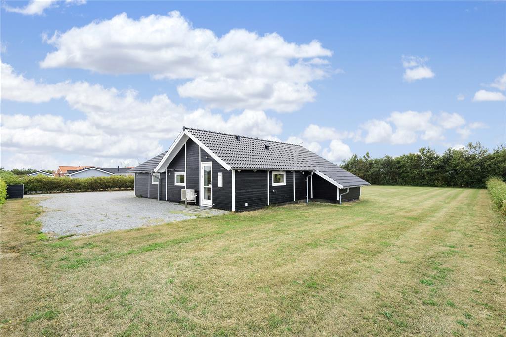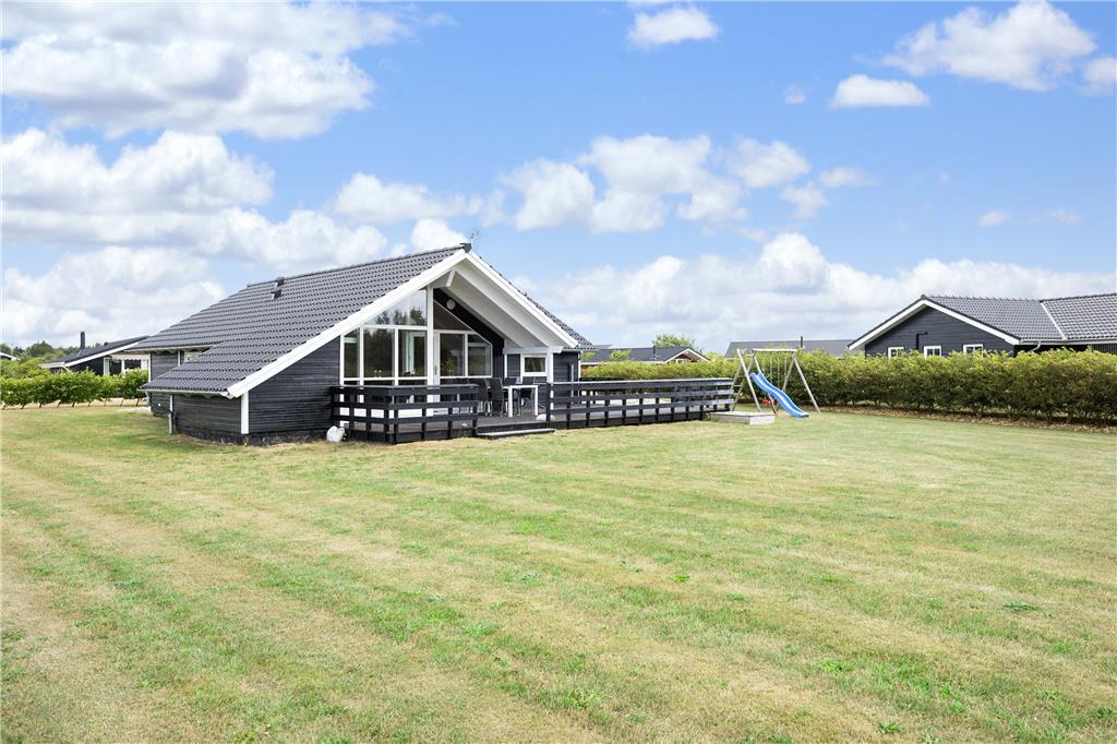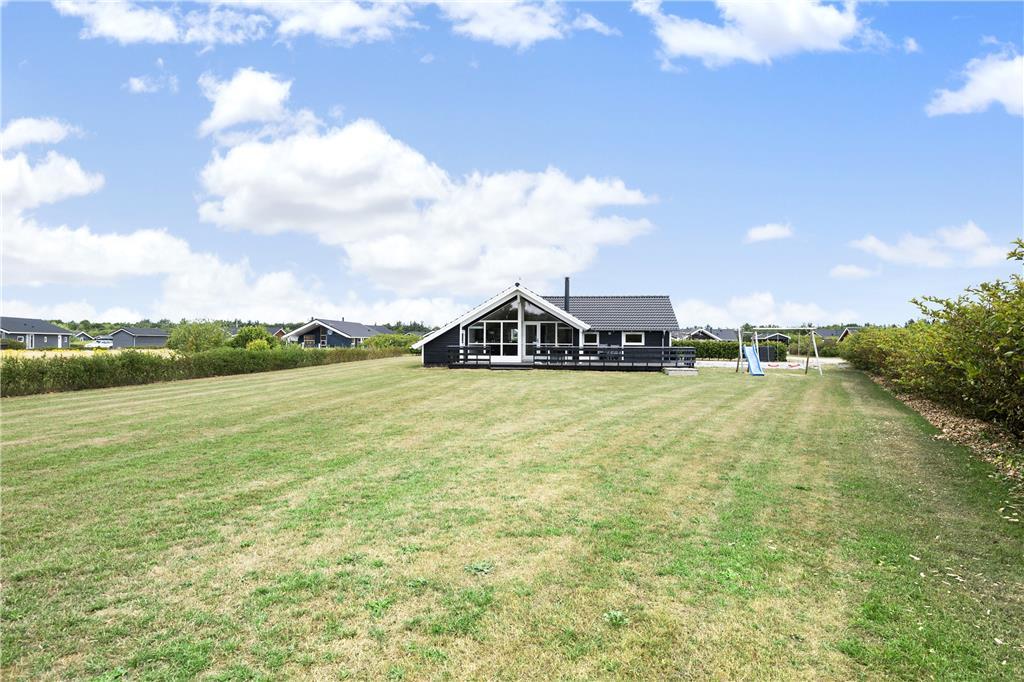 Sommerhuset ligger for enden af en lille sidevej på et lukket vænge. Grunden er med sine 1200 m2 ganske stor, og mod sydvest grænser den endda op til åbne marker, så det er med andre ord et fredeligt og roligt sted at bo. Solskinstimerne kan familien for eksempel bruge på at gynge, lege i sandkasse eller spille bold på græsplænen – når I altså ikke bare slapper af i en havestol på den store, sydvendte terrasse.