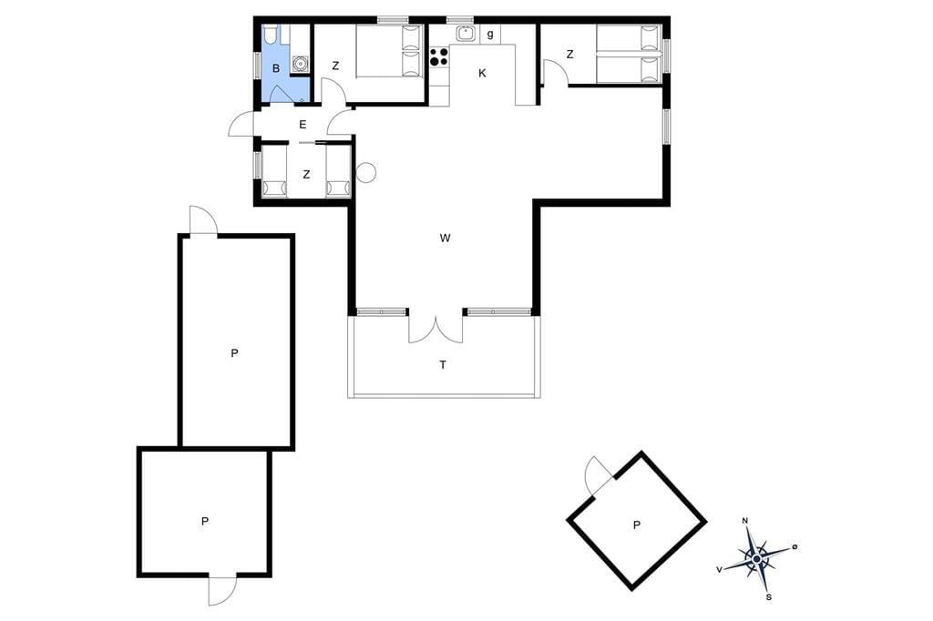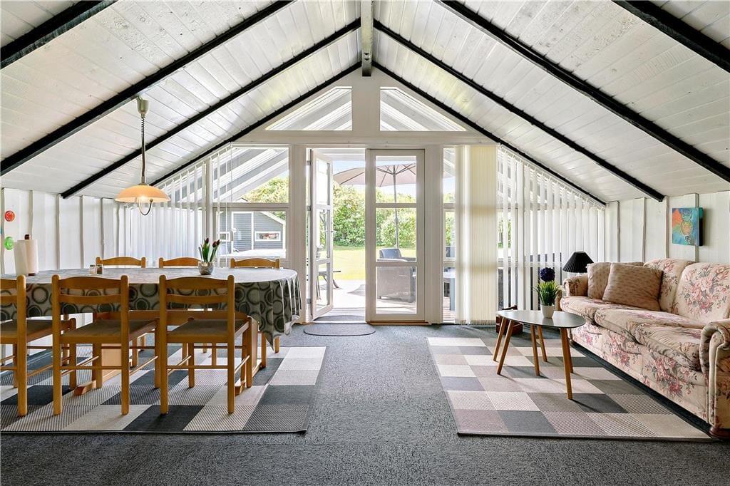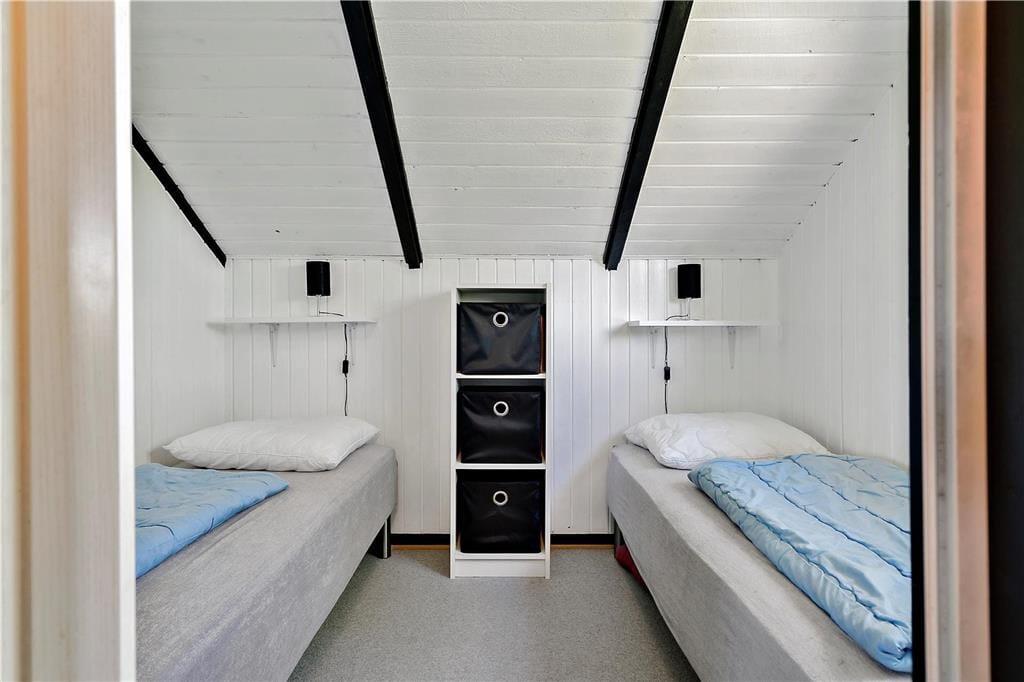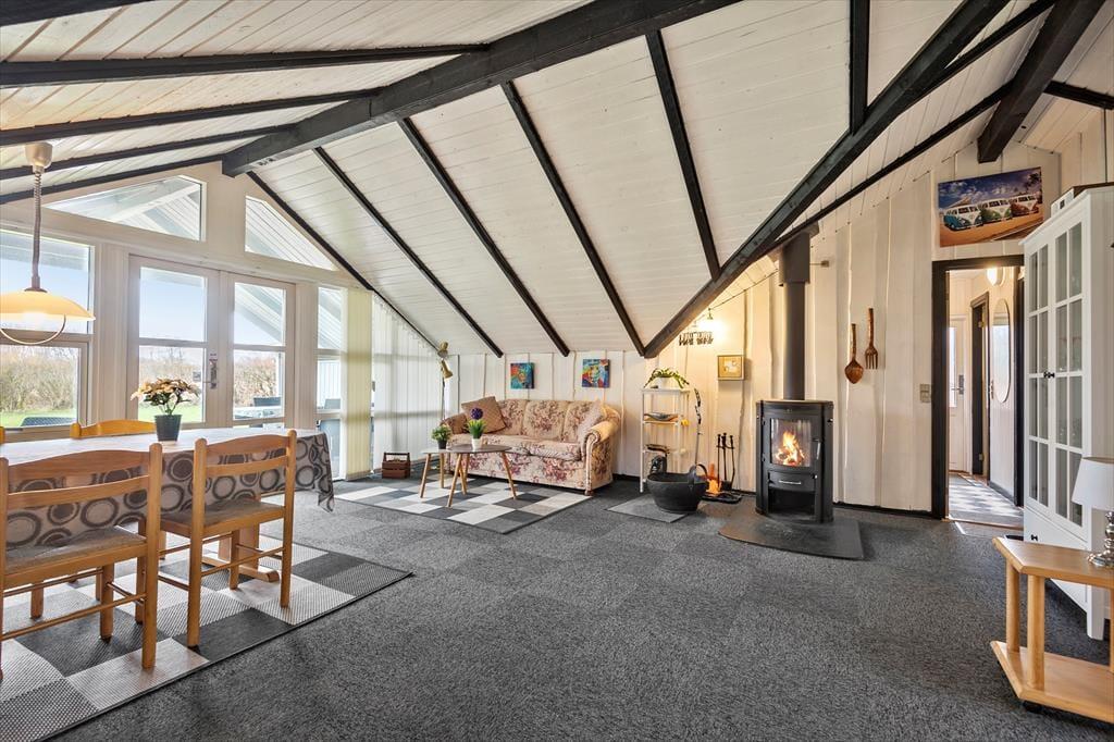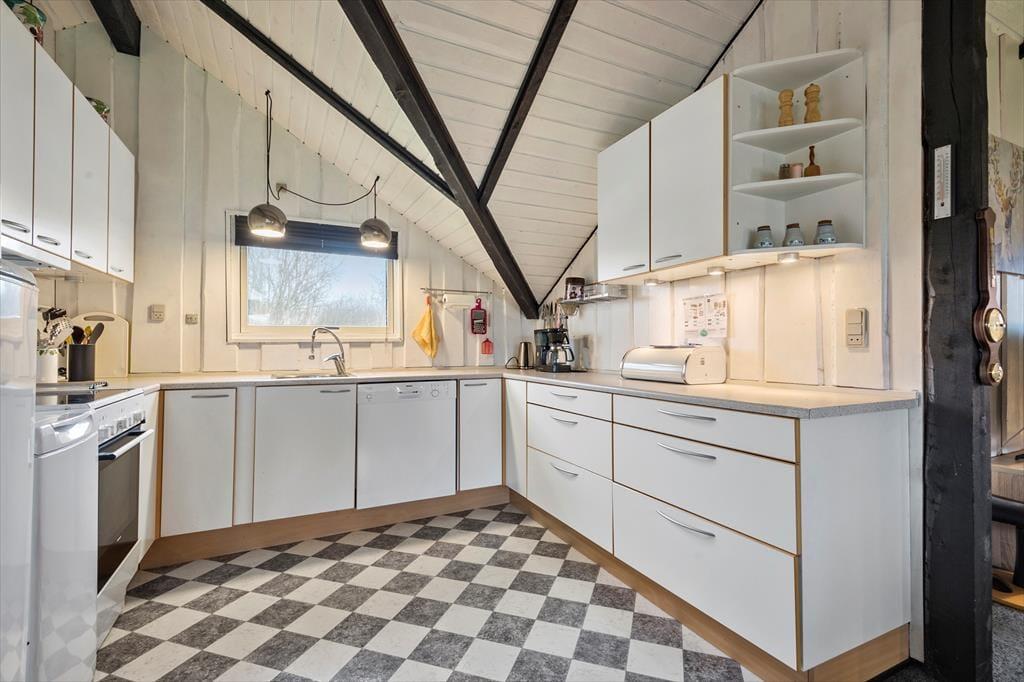 Sommerhuset har en både praktisk og hyggelig indretning, og planløsningen er fornuftigt udformet, så I kan være op til seks personer inden døre. Feriegæsterne kan fordele sig to og to på de tre soveværelser, og på badeværelset kan I både vaske tøj og tage et brusebad, for det er nemlig udstyret med både vaskemaskine og bruseniche. Når det er ved at være spisetid, kan I begynde at finde lækkerier frem i køkkenet, der ligger som en integreret del af stuen. Den åbne forbindelse betyder, at I nemt kan fortsætte hyggesnakken og tage del i det gode selskab, selvom I skal røre i gryderne eller kigge til lasagnen i ny og næ.