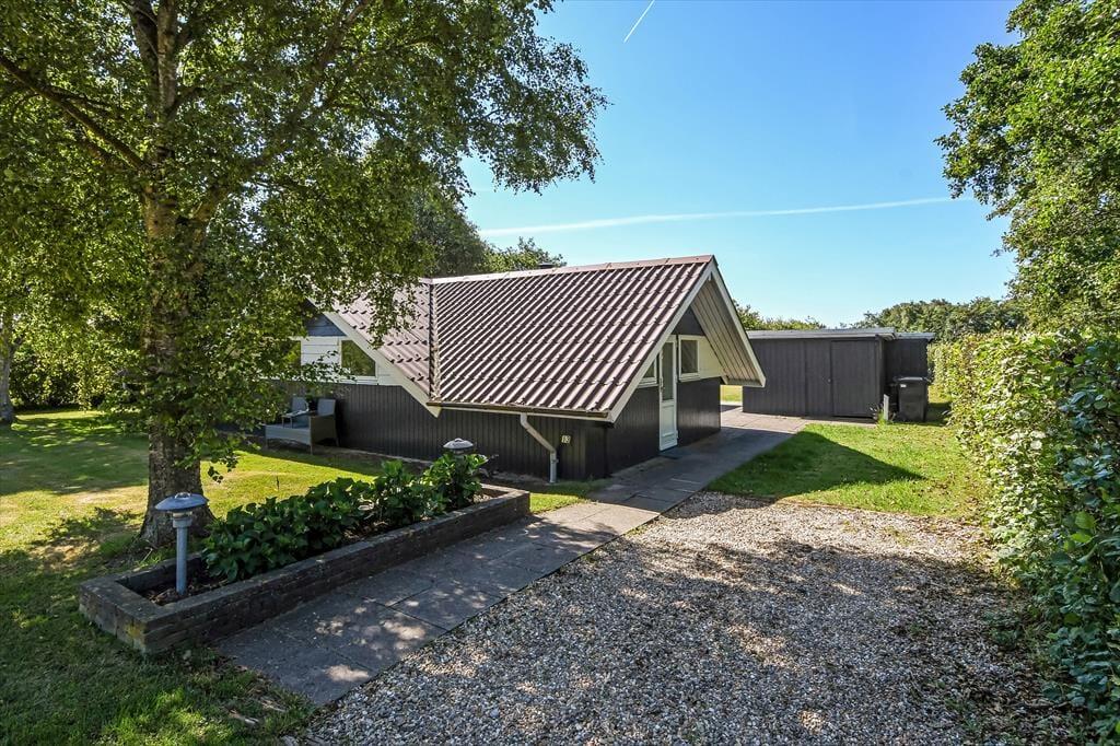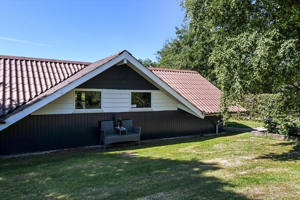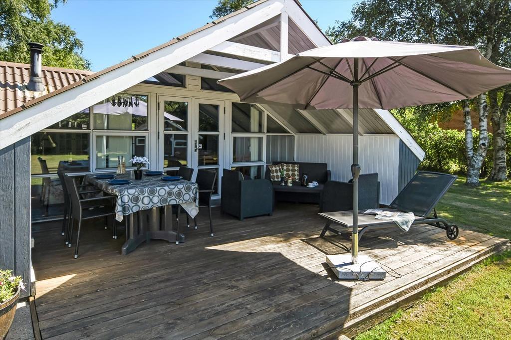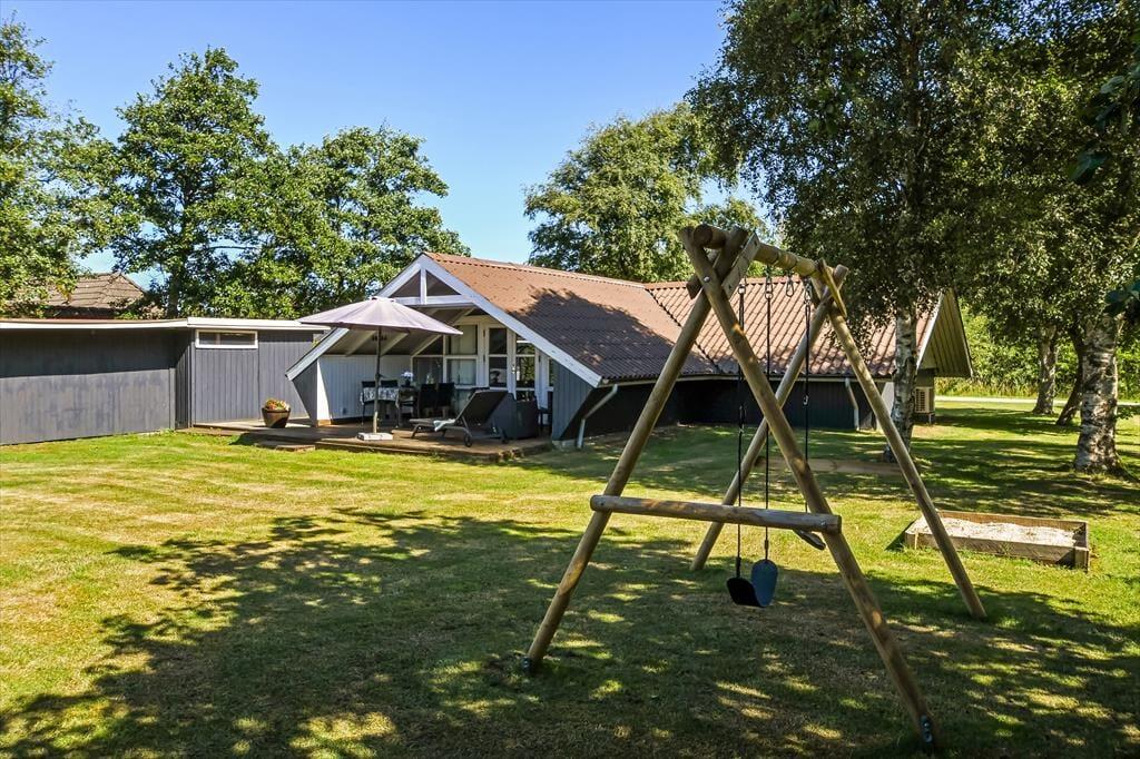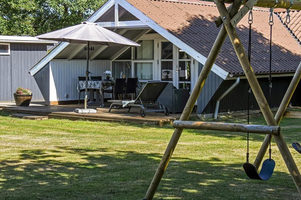 Beliggenheden på en lille, blind vej betyder, at der er fred og ro på adressen – og mod syd grænser sommerhusgrunden endda også op til et grønt, åbent område. I den hyggelige have er der gynger og sandkasse til de yngste familiemedlemmer, og græsplænen er stor nok til, at I kan spille vikingespil eller lave andre hyggelige haveaktiviteter. I kan selvfølgelig også bare slappe af på terrassen, der er sydvendt, delvist overdækket og udstyret med havemøbler, liggestole og parasol.