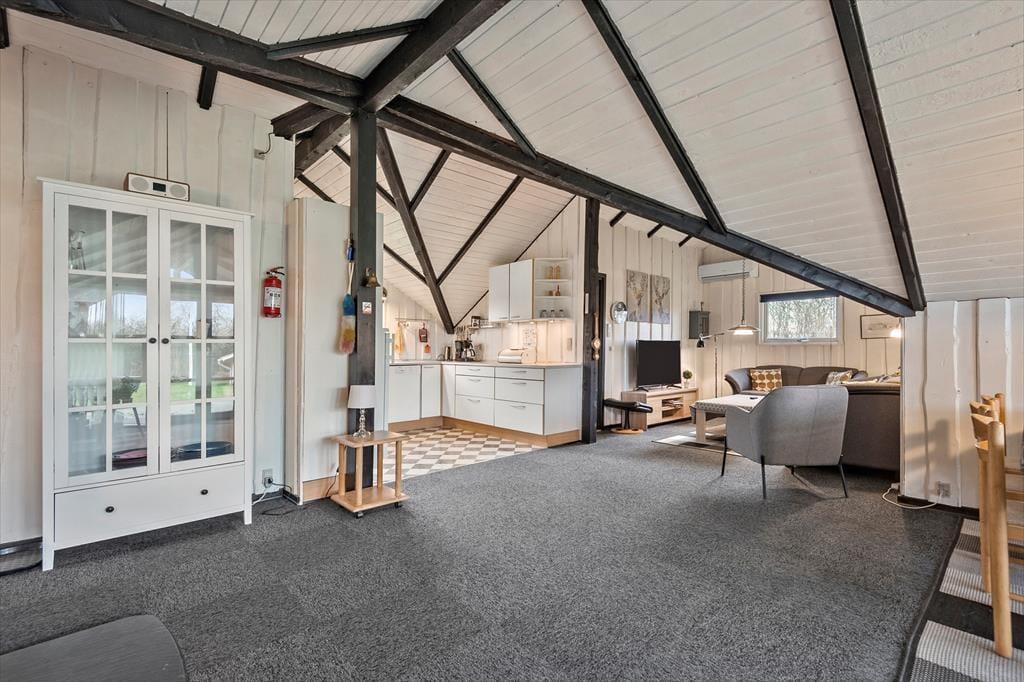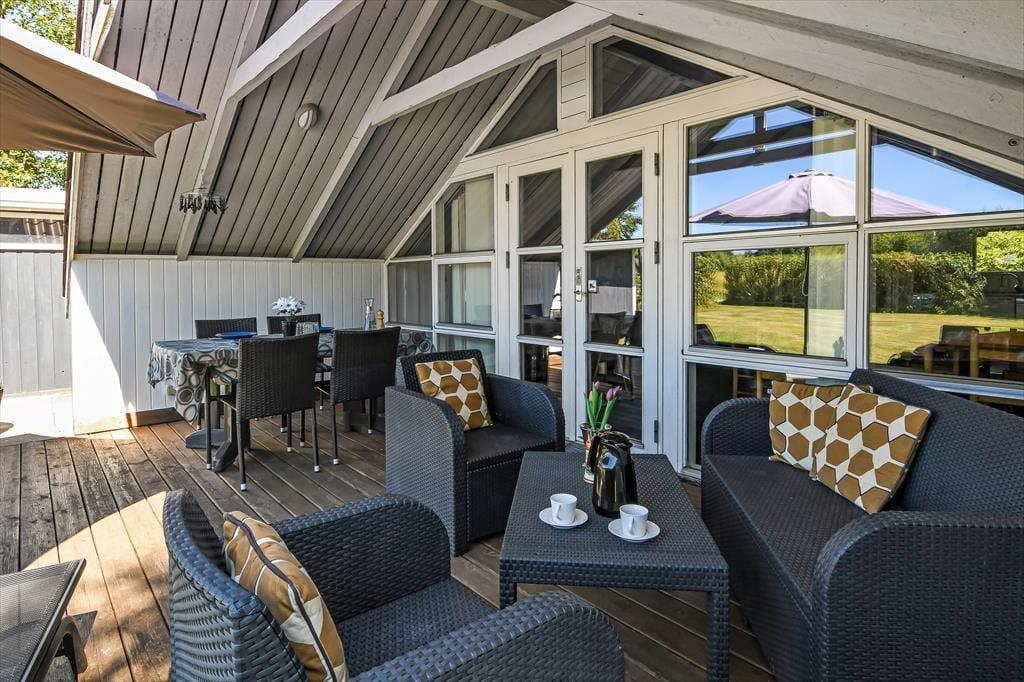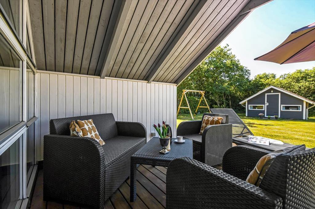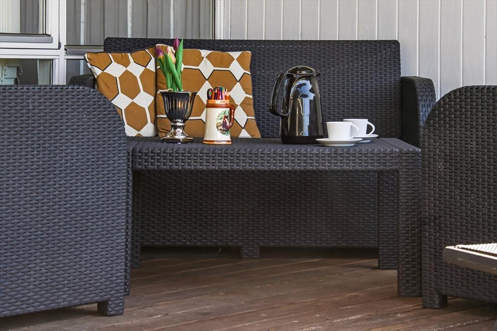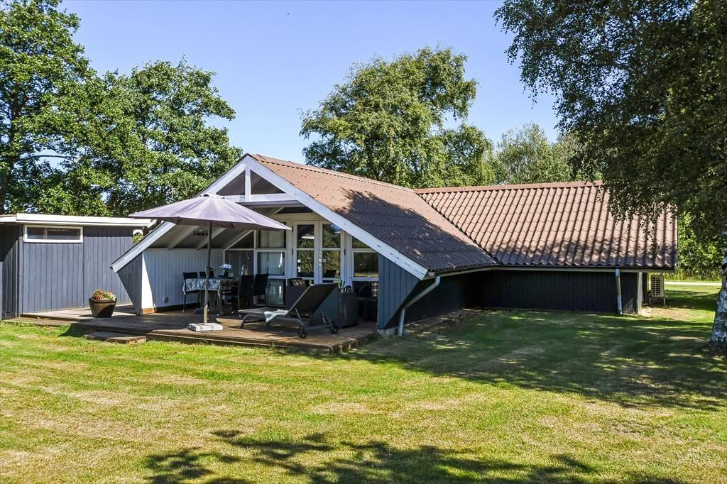 Beliggenheden på en lille, blind vej betyder, at der er fred og ro på adressen – og mod syd grænser sommerhusgrunden endda også op til et grønt, åbent område. I den hyggelige have er der gynger og sandkasse til de yngste familiemedlemmer, og græsplænen er stor nok til, at I kan spille vikingespil eller lave andre hyggelige haveaktiviteter. I kan selvfølgelig også bare slappe af på terrassen, der er sydvendt, delvist overdækket og udstyret med havemøbler, liggestole og parasol.