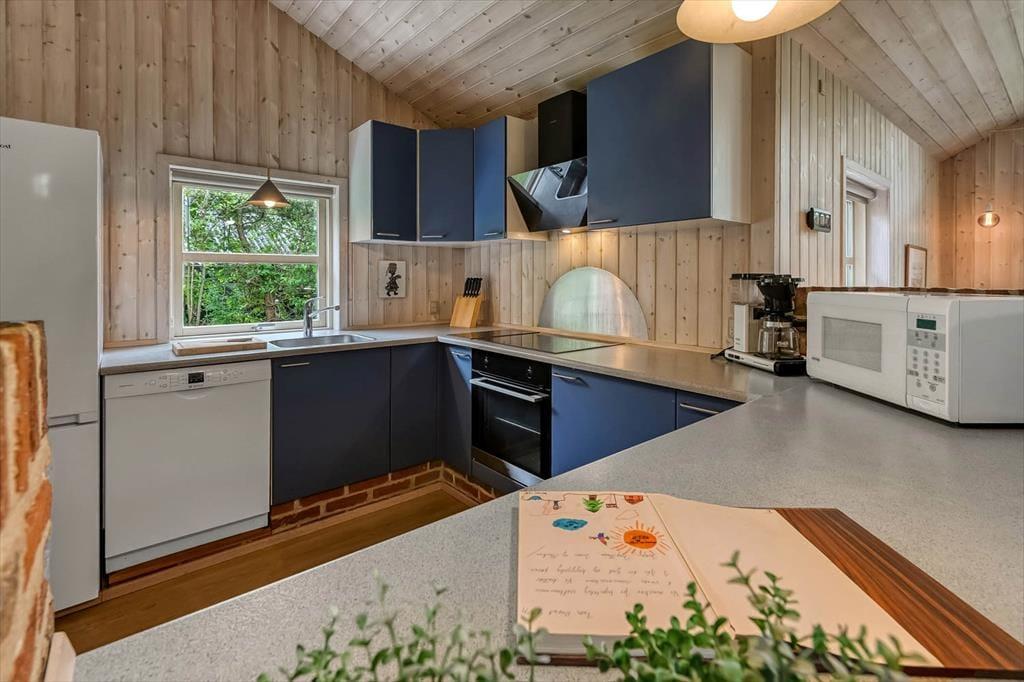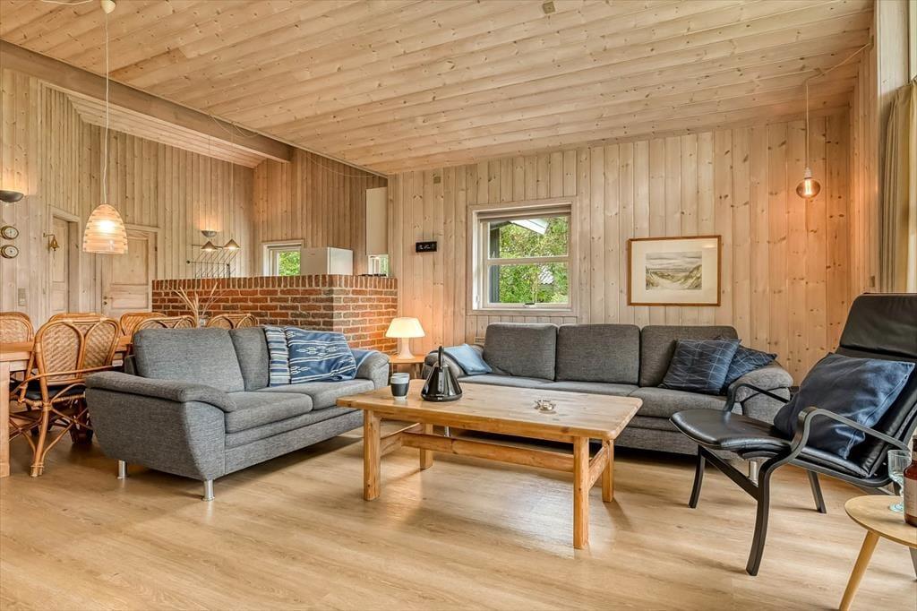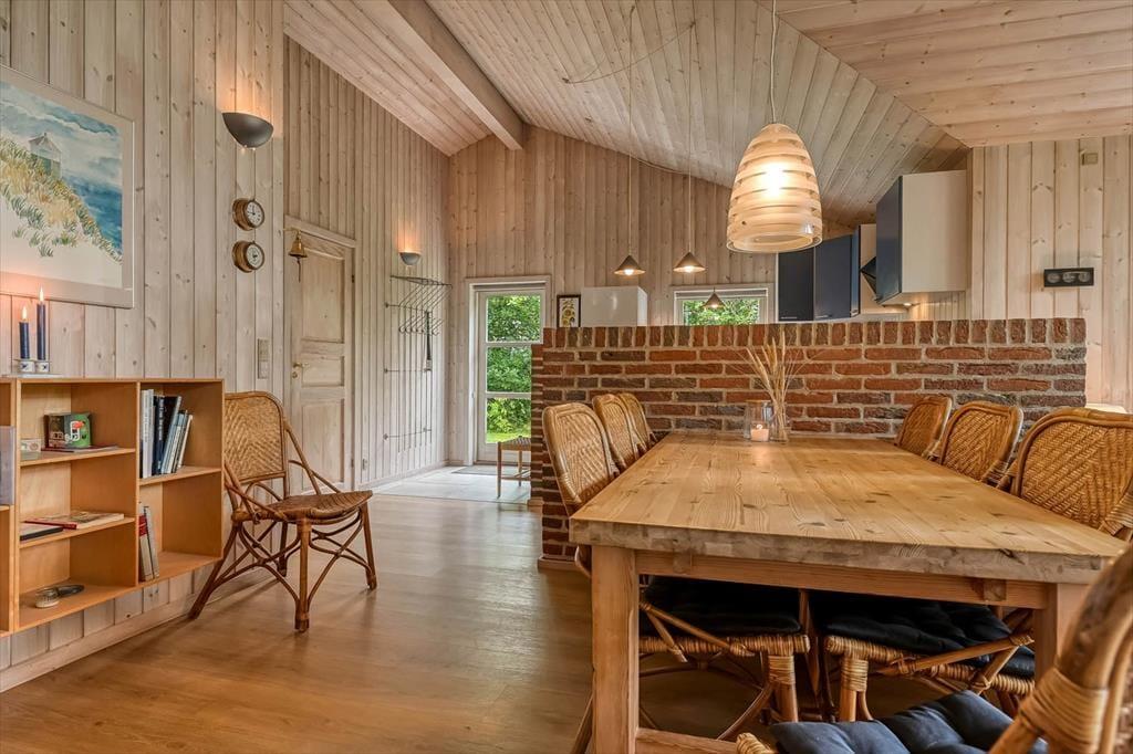 Lyst, pænt og velholdt – det er ord, der passende beskriver huset, som er opført i 1998 og senest renoveret i 2019. Væggenes træbeklædning, brændeovnen og loftet, der går helt til kip, er noget af det, der giver et klassisk og hyggeligt sommerhuspræg, mens det store sydvendte gavlvindue lukker ekstra meget lys ind i opholdsafdelingen. Her ligger stue og køkken i åben forbindelse, så I kan sagtens nyde familiesamværet, selvom der er gang i madlavning, brætspil og sofaafslapning på samme tid. Trænger I til en rolig stund, er det helt perfekt at tage en tilbagelænet pause i spabadet og saunaen, der begge er installeret på det største af husets to badeværelser. Og når klokken bliver mange, og I ikke har mere på ferieprogrammet, kan I se frem til en god nats søvn på de tre soveværelser og på hemsen, der er udstyret med ekstra madrasser.