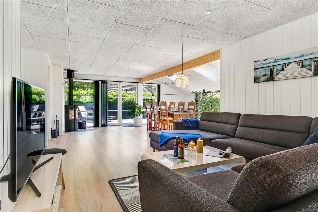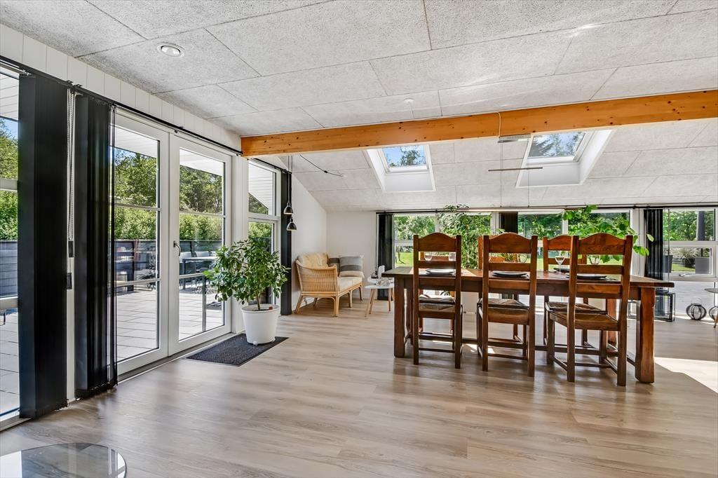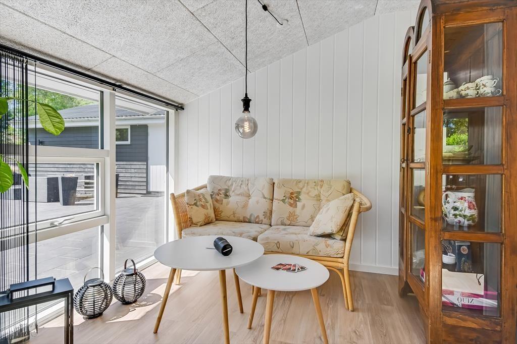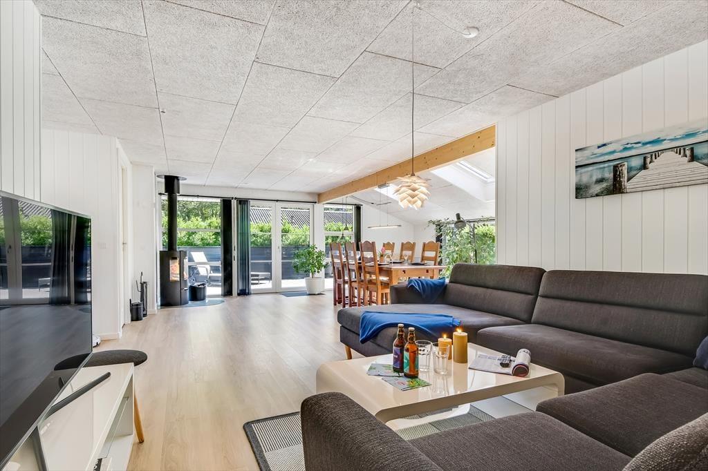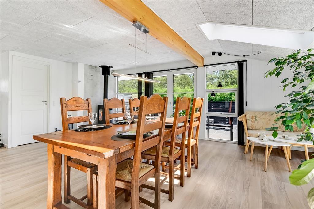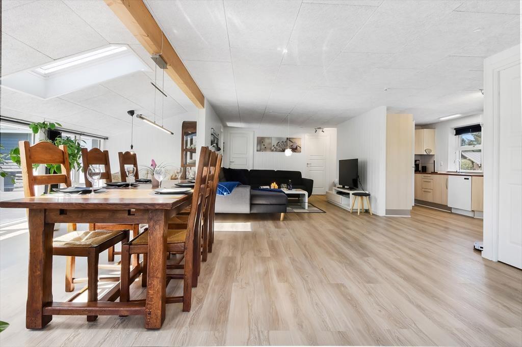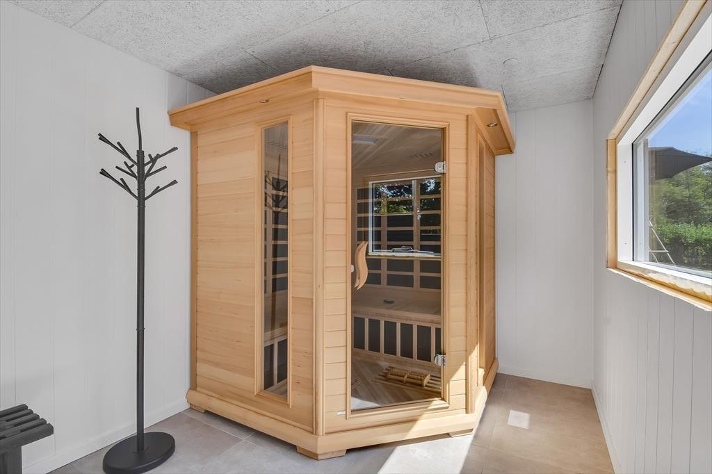 Når du træder indenfor i sommerhuset, bliver du straks mødt af en lys og indbydende atmosfære. Den hyggelige stue med loft til kip er husets naturlige samlingspunkt, hvor du kan slænge dig i sofaen foran brændeovnen eller nyde en hjemmelavet middag ved spisebordet. Fra køkkenet kan du følge med i snakken og samtidig nyde duften af friskbagt brød eller aftenens simreret. Efter en aktiv dag i den friske luft kan du se frem til afslapning i den infrarøde sauna, der byder på en skøn varme og velvære. Når trætheden melder sig, kan du trække dig tilbage til et af de hyggelige soveværelser, hvor du kan få en god nats søvn.