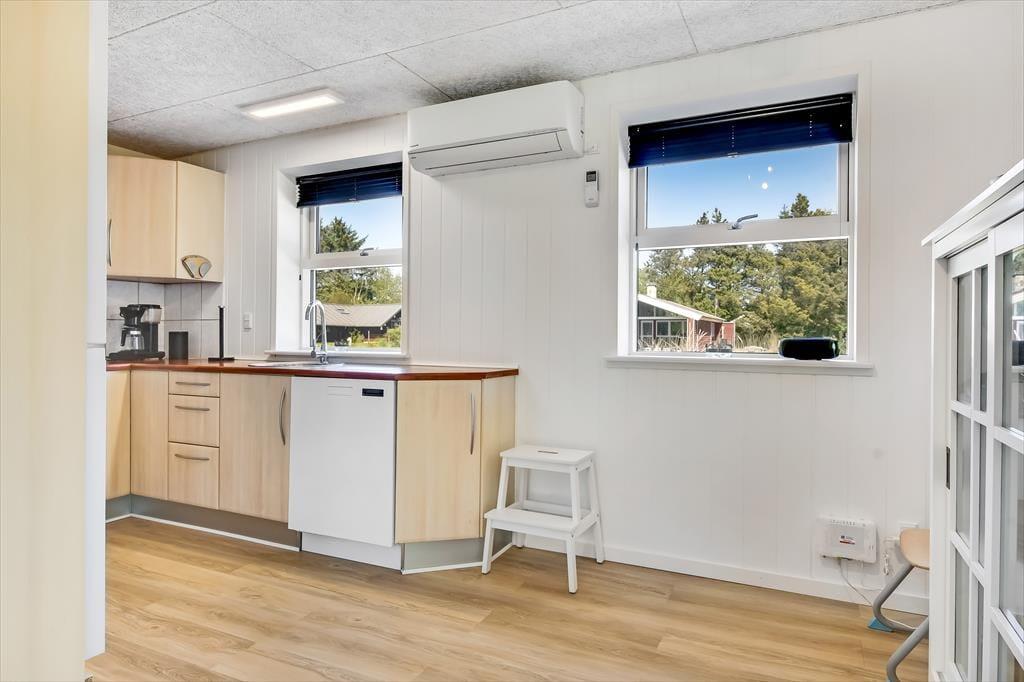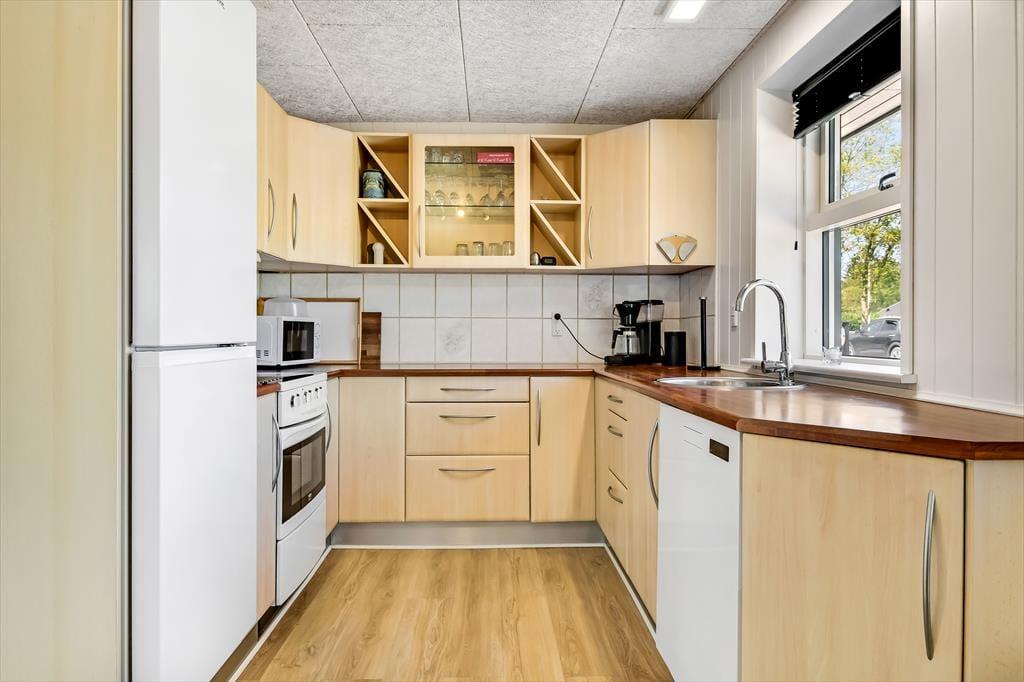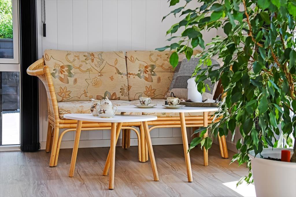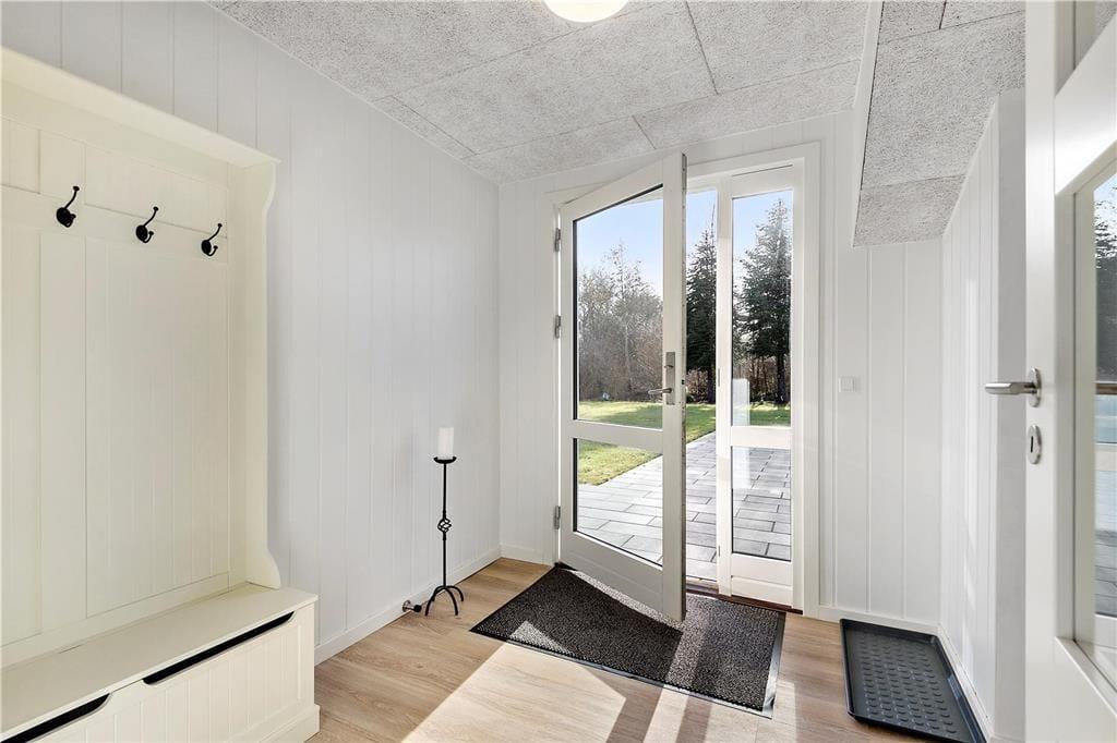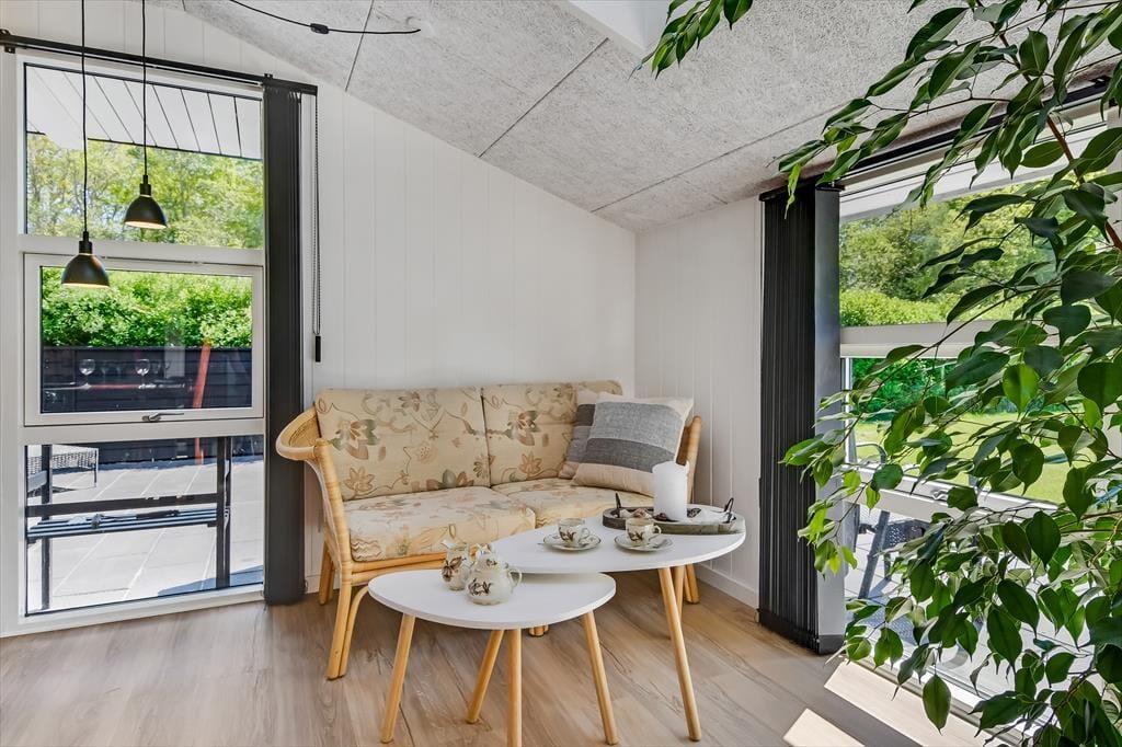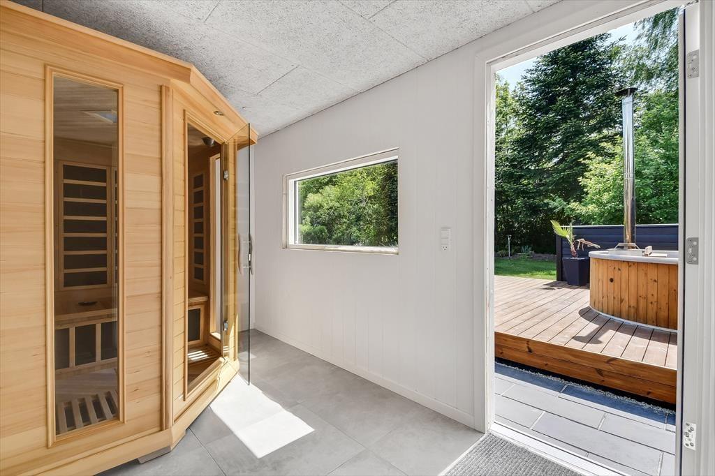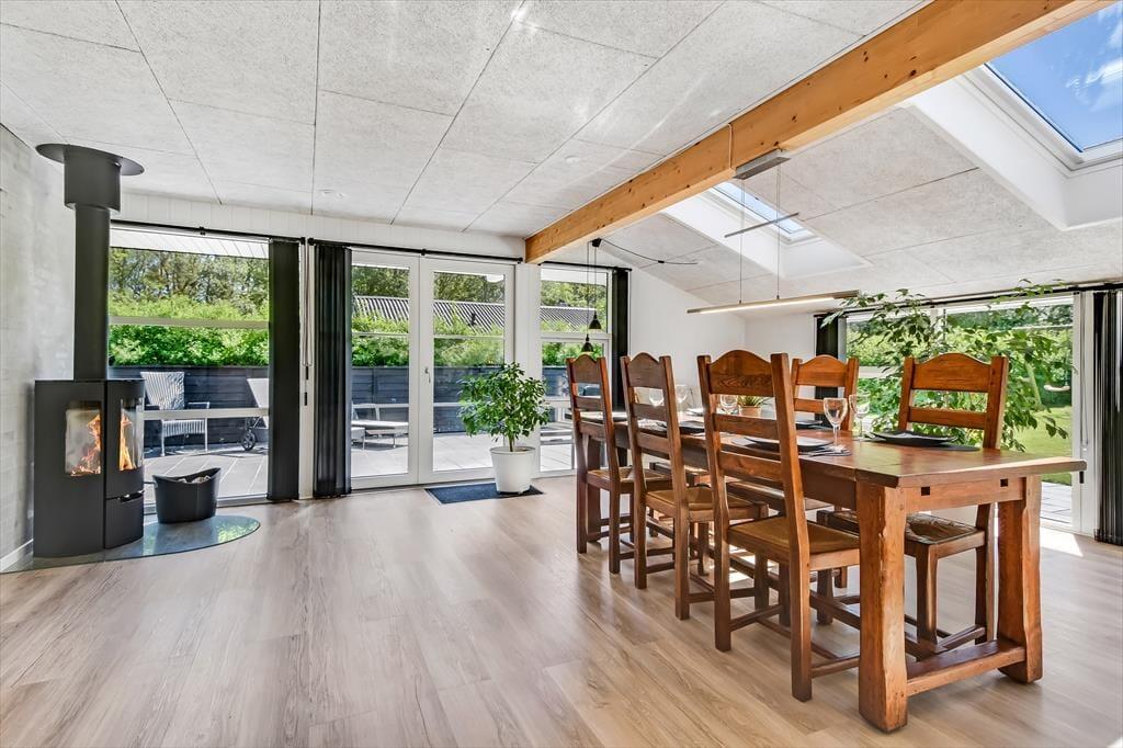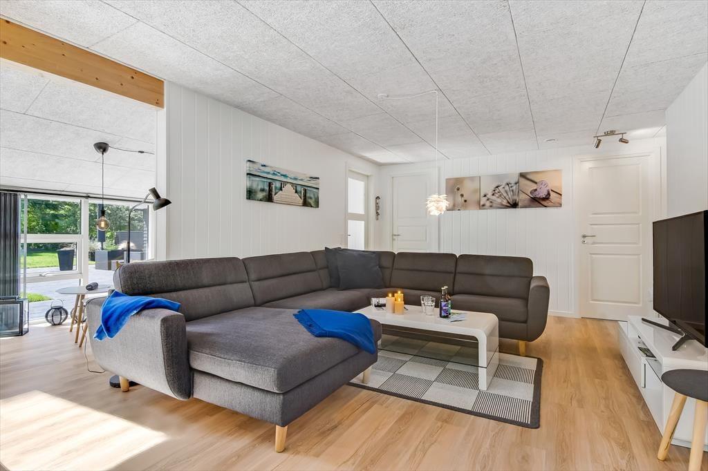 Når du træder indenfor i sommerhuset, bliver du straks mødt af en lys og indbydende atmosfære. Den hyggelige stue med loft til kip er husets naturlige samlingspunkt, hvor du kan slænge dig i sofaen foran brændeovnen eller nyde en hjemmelavet middag ved spisebordet. Fra køkkenet kan du følge med i snakken og samtidig nyde duften af friskbagt brød eller aftenens simreret. Efter en aktiv dag i den friske luft kan du se frem til afslapning i den infrarøde sauna, der byder på en skøn varme og velvære. Når trætheden melder sig, kan du trække dig tilbage til et af de hyggelige soveværelser, hvor du kan få en god nats søvn.