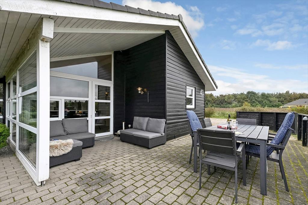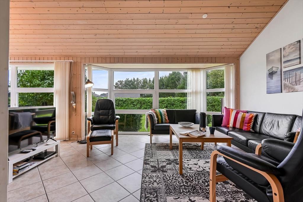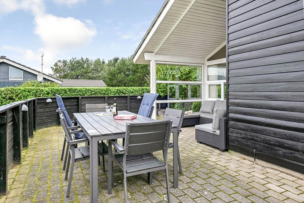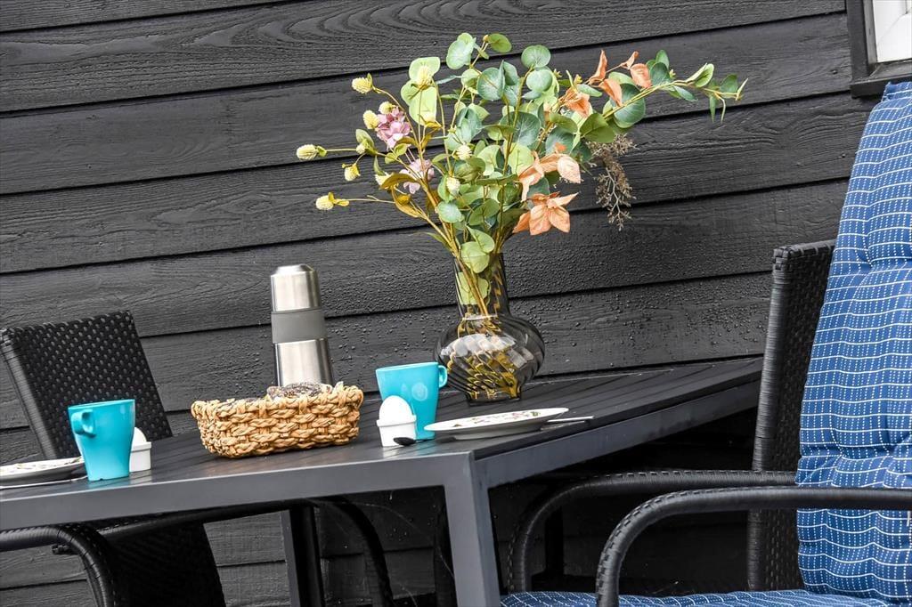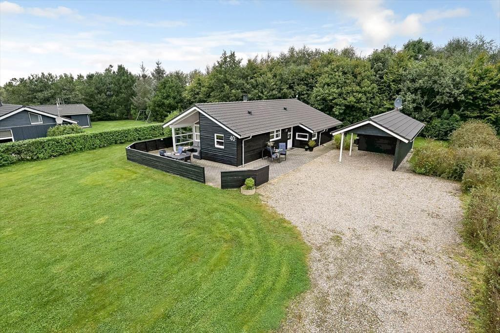 Fra stuen har I direkte adgang til et overdækket terrasseområde, og derfra kan I træde videre ud på det åbne terrassemiljø, der breder sig rundt om huset. Mellem sommerhuset og carporten finder I en lille, læfyldt lomme, hvor I også kan sætte jer i havestolene, medmindre I er mere i humør til at lege og spille bold på grundens store græsplæne.