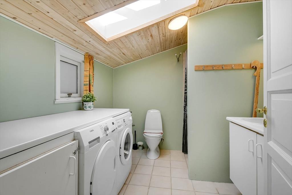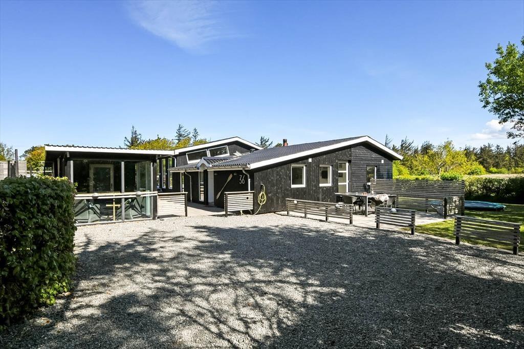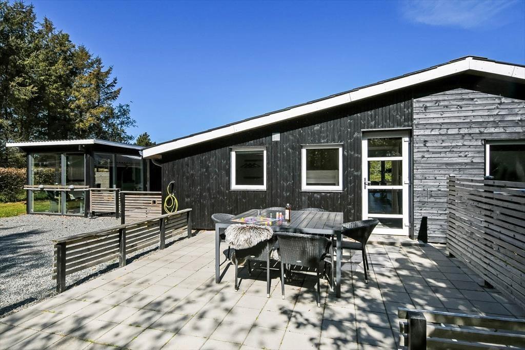 På terrassen står et dejligt vildmarksbad, så det er ikke kun om sommeren, at livsnydertilværelsen kan foregå i det fri. Det er skønt at sidde her og mærke feriefreden sænke sig– måske med fuglekvidder som behageligt lydtæppe. Livsnydertilværelsen kan desuden foregå i en god liggestol på terrassen eller på det overdækkede areal med grill og havebord, der skaber en skøn ramme om de lyse sommeraftener. På den store naturgrund er der god plads til at boltre sig, og så er der endda gode legefaciliteter til børnene i form af legehus, sandkasse, gynger og trampolin.