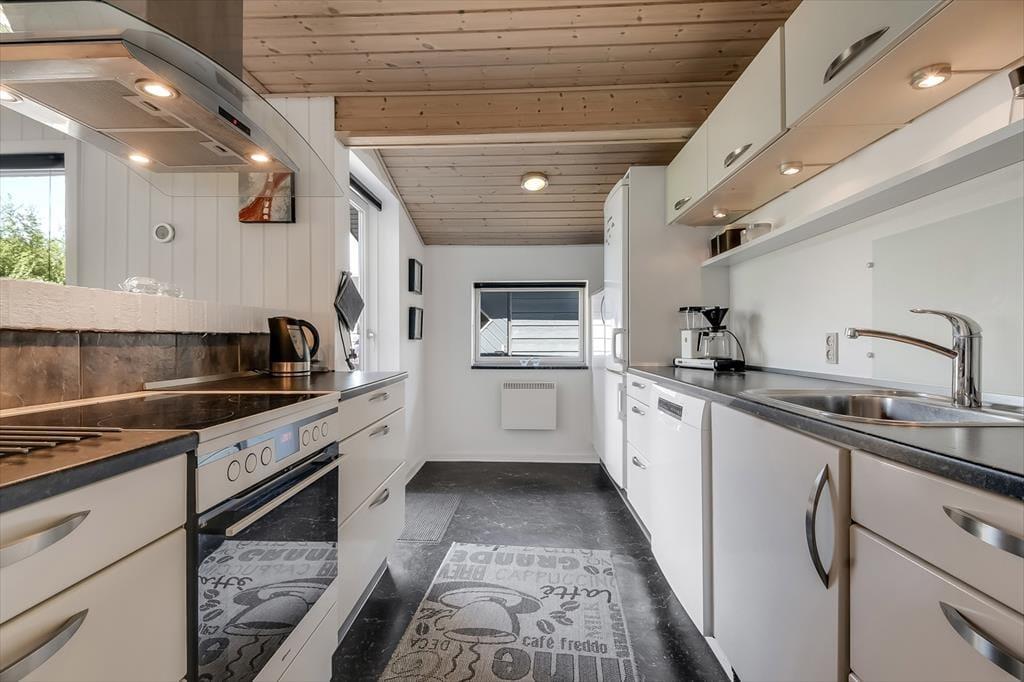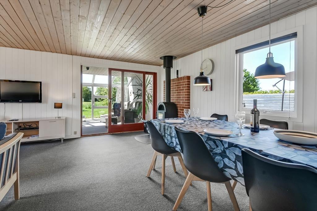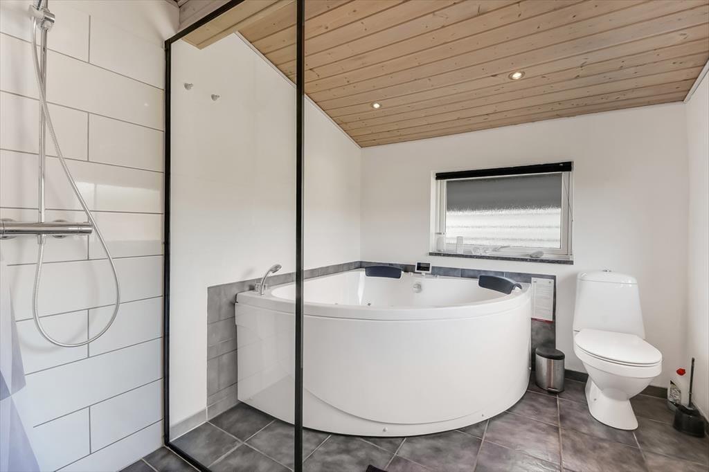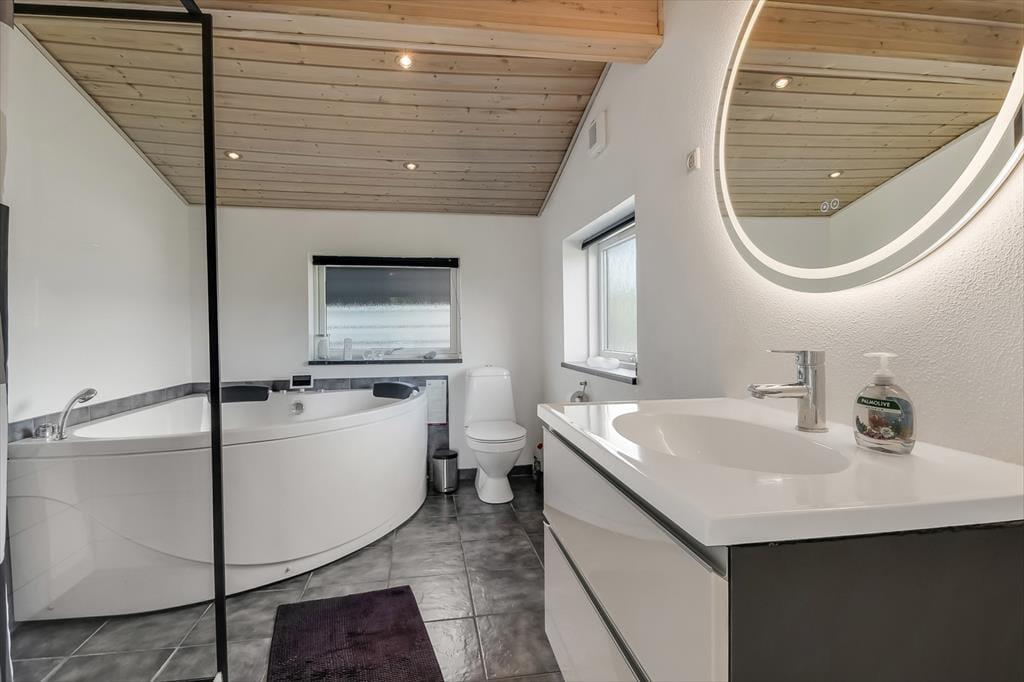 Et spabad, en brændeovn og en udestue er nogle af de lækre detaljer, der gør ferielivet særdeles behageligt her i huset. Spabadet er ikke overraskende placeret på badeværelset, så hvis I trænger til wellness og total afslapning, er det her, det foregår. Brændeovnen står i det hyggelige opholdsrum, hvor stue og køkken er forenet på velfungerende vis. Går I ud gennem glasdøren, kommer I til udestuen, der er et velindrettet og dejligt lyst rum med et stort, sydvendt vinduesparti. Soveværelser er der tre af, og de er alle indrettet med dobbeltseng, så der er sovepladser til op til seks personer.