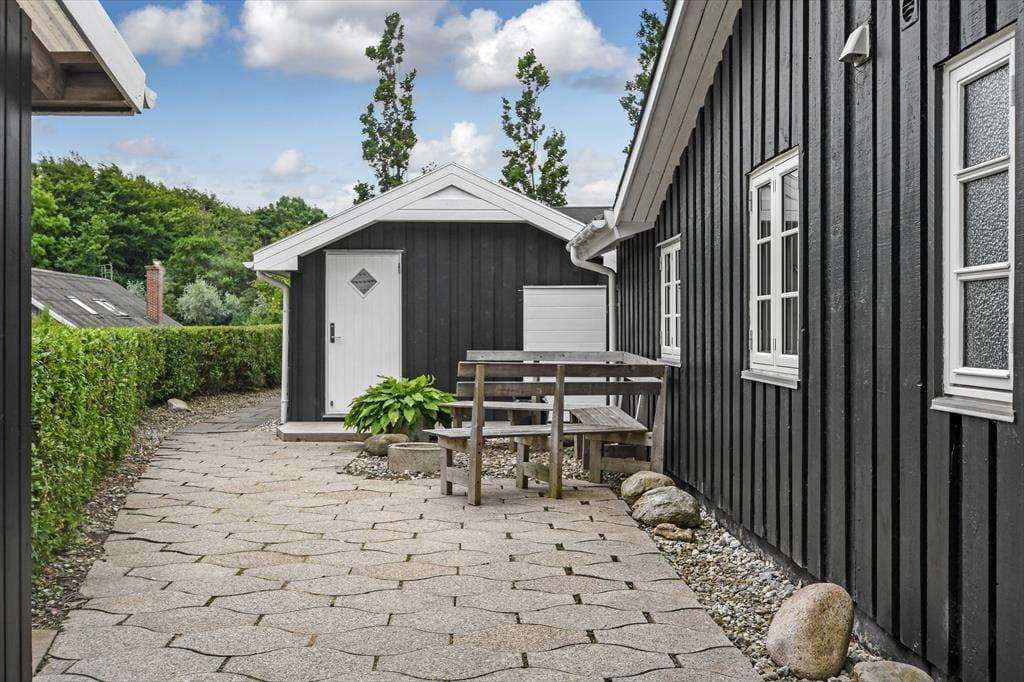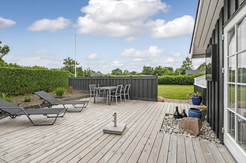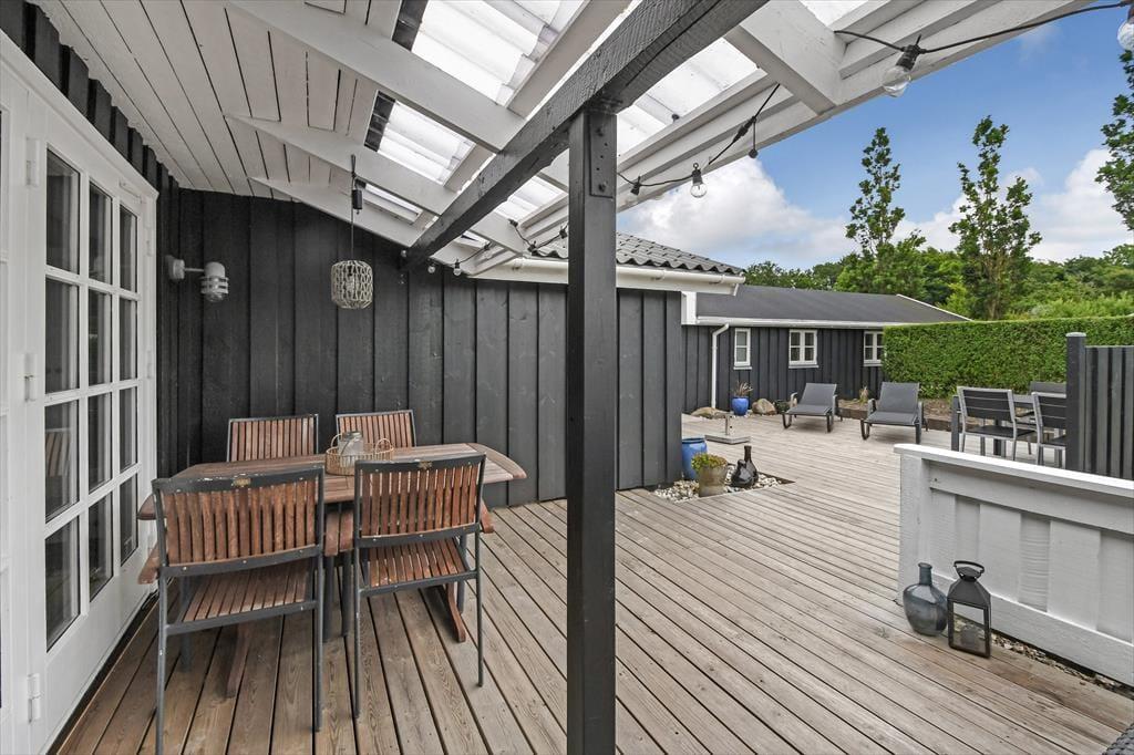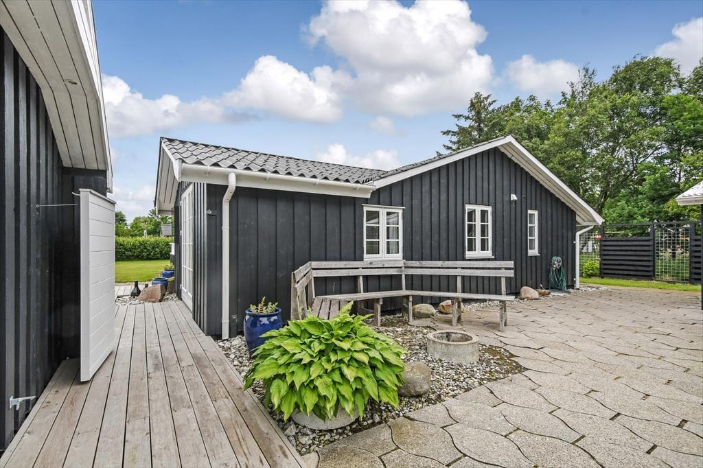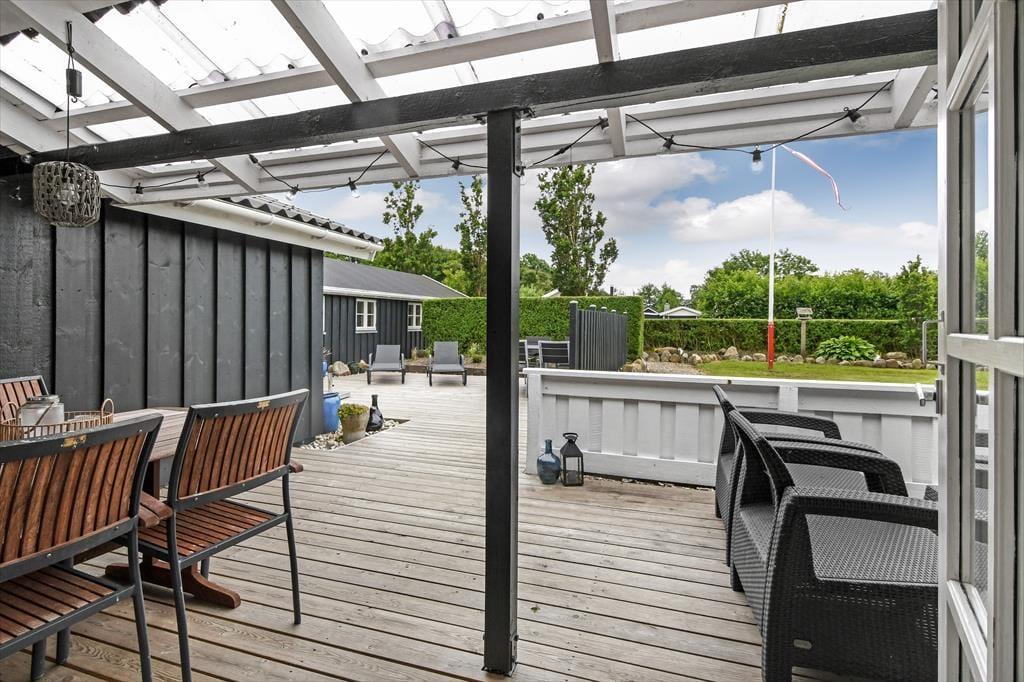 Ude i det fri har I også plads til at boltre jer på den 1.024 m2 store grund, som skærmes af grøn randbeplantning og en tæt hæk. Den velholdte græsplæne kan oplagt danne rammen om diverse havespil, og trænger I til en stille stund, er der etableret flere hyggelige opholdspladser rundt om huset og annekset. Allermest tillokkende er formentlig det store, delvist overdækkede og afskærmede terrassemiljø, som er perfekt til udendørs feriemåltider, tilbagelænet afslapning og hyggestunder med familien.