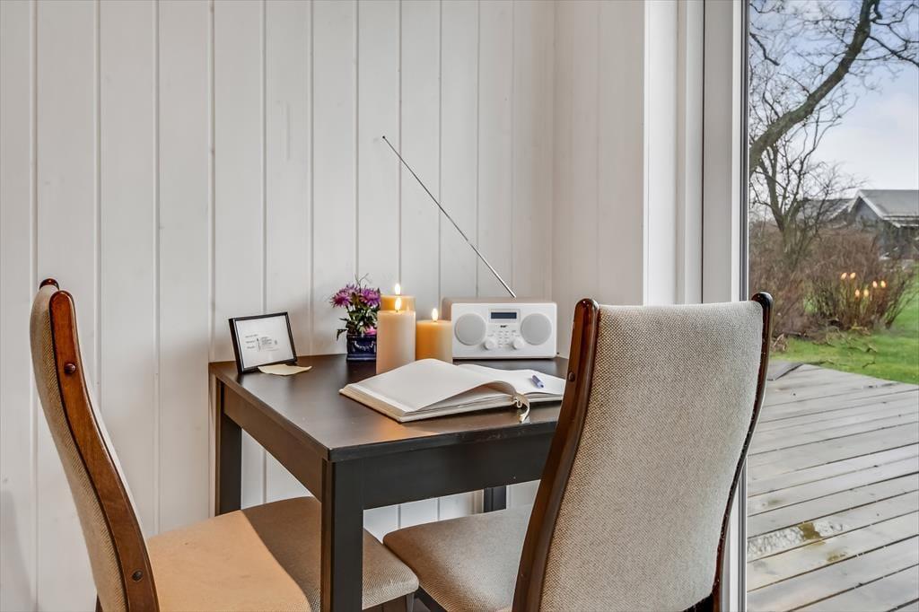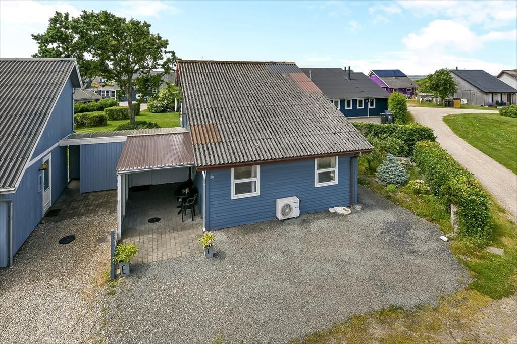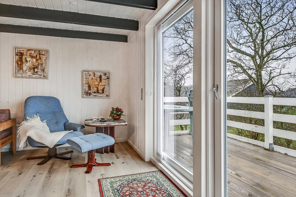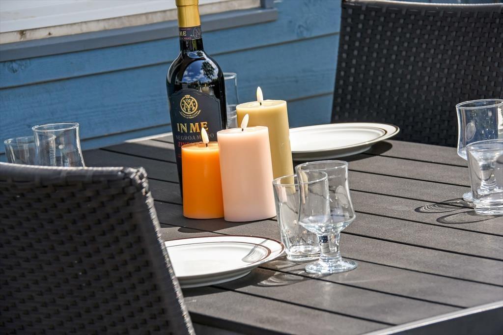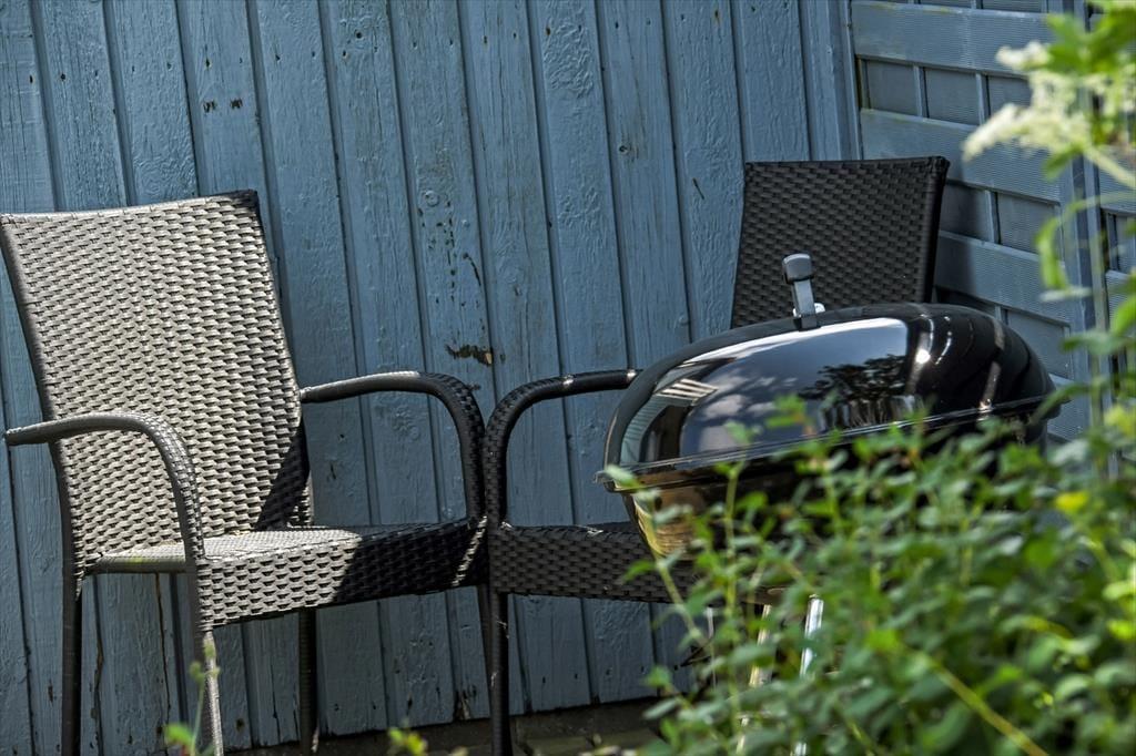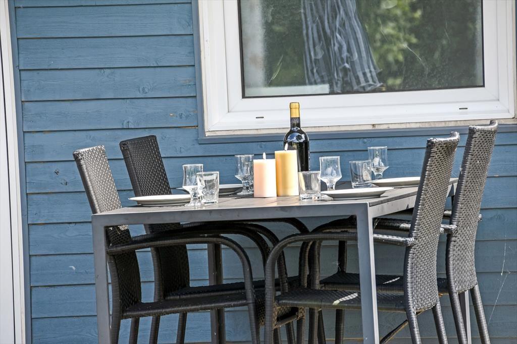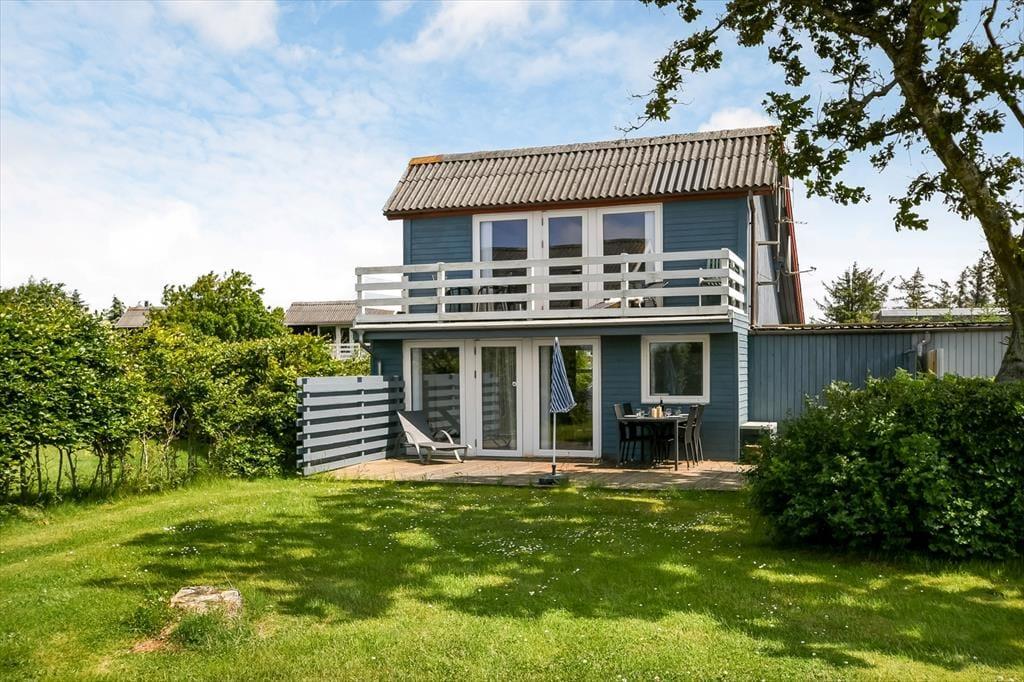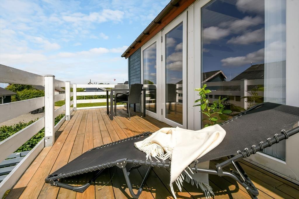 På sommerhusgrunden er der carport til bilen og en græsplæne til leg og boldspil. Afslapningsstunderne kan oplagt foregå på den 20 m2 store træterrasse, der er udstyret med havemøbler, liggestole og grill. I kan også sætte jer på førstesalens dejlige altan: Ligesom terrassen ligger den godt i forhold til solen, og så kan I samtidig nyde, at der er kig til fjorden.