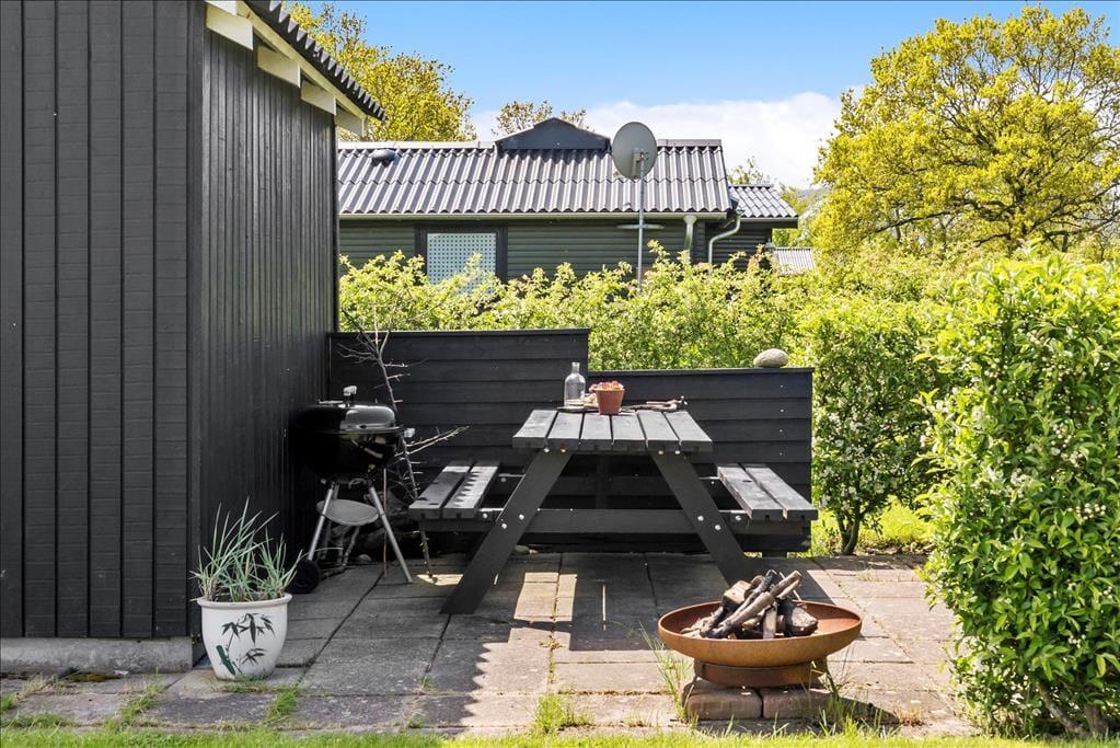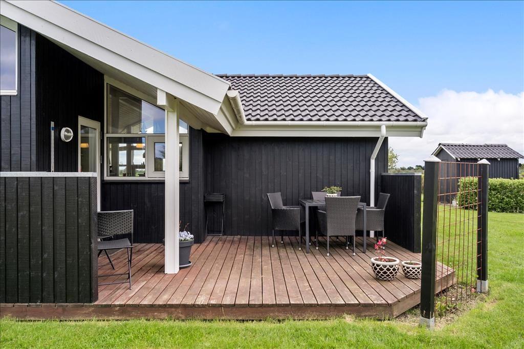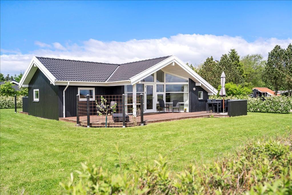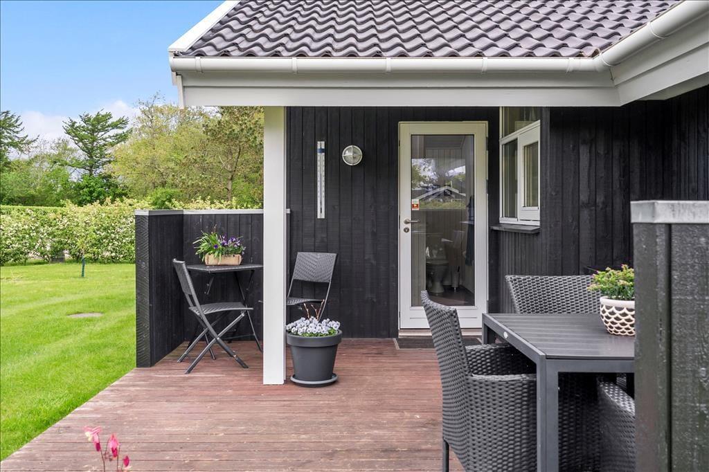 Afslapningsstunderne kan også foregå ude i det fri, når vejret er lunt og sommerligt. En stor og delvist overdækket terrasse breder sig syd for sommerhuset, så her er der sol det meste af dagen – men I kan selvfølgelig også vælge at slænge jer på grundens store græsplæne.