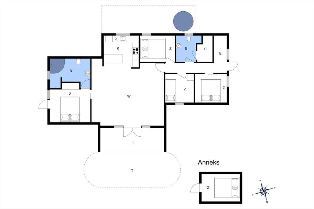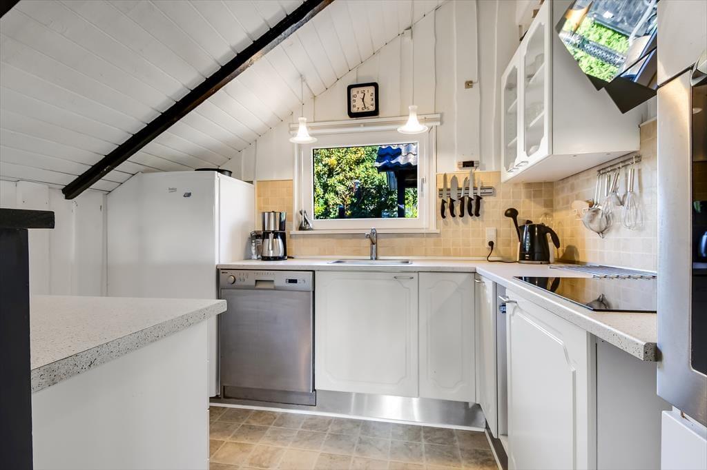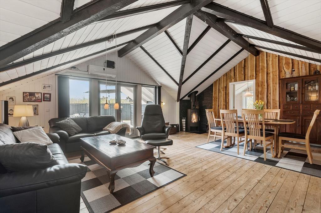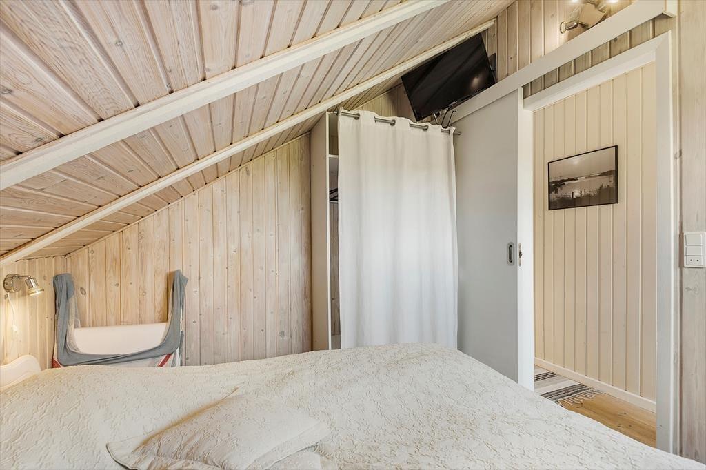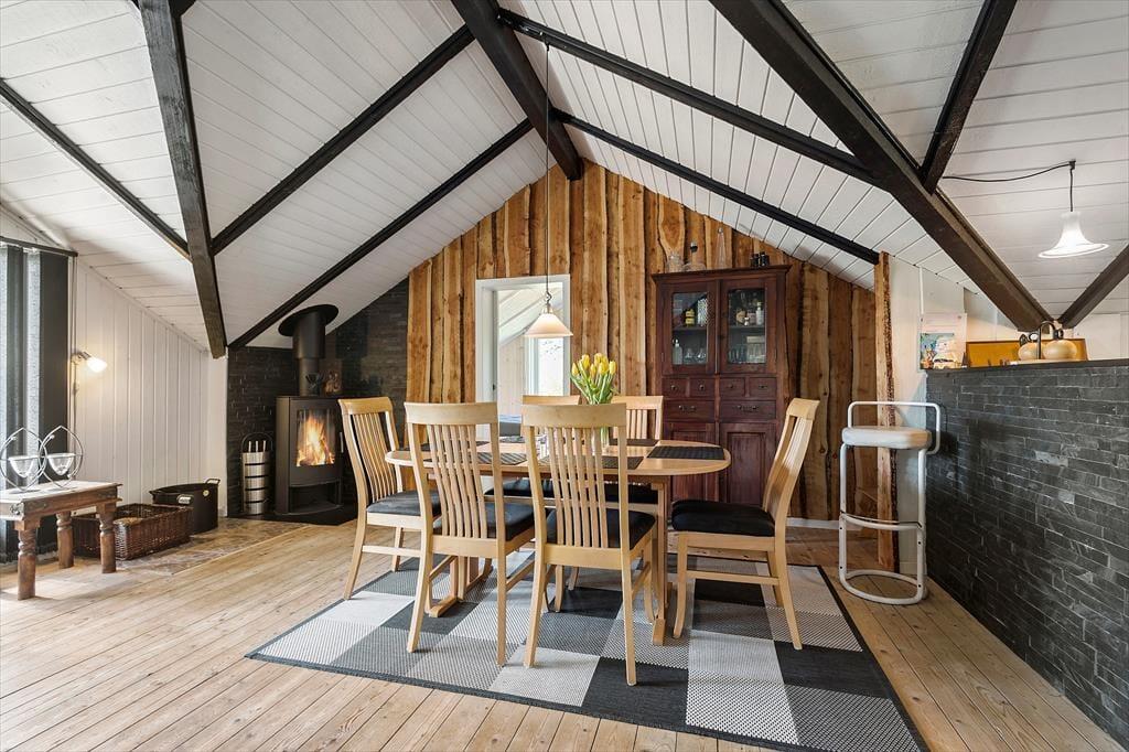 Kvadratmeterne er godt udnyttet, så det er muligt at samles syv personer her på adressen. Selve huset byder på tre gode soveværelser med dobbeltseng, som alle har et lille tv. Der er også et fjerde soveværelse med en enkeltseng inden døre, og derudover står der et anneks på grunden, så I har flere fordelingsmuligheder, når I skal finde jer til rette. I begge ender af sommerhuset ligger et badeværelse, og mens det ene er udstyret med spabad, er det andet med sauna. Midt i huset ligger opholdsrummet, hvor køkken og stue er forenet. Her er der både varmepumpe og brændeovn, og det hyggelige møblement samt det flotte loft, der går helt til kip, er med til at gøre det til et stemningsfuldt og indbydende rum at nyde ferielivet i.