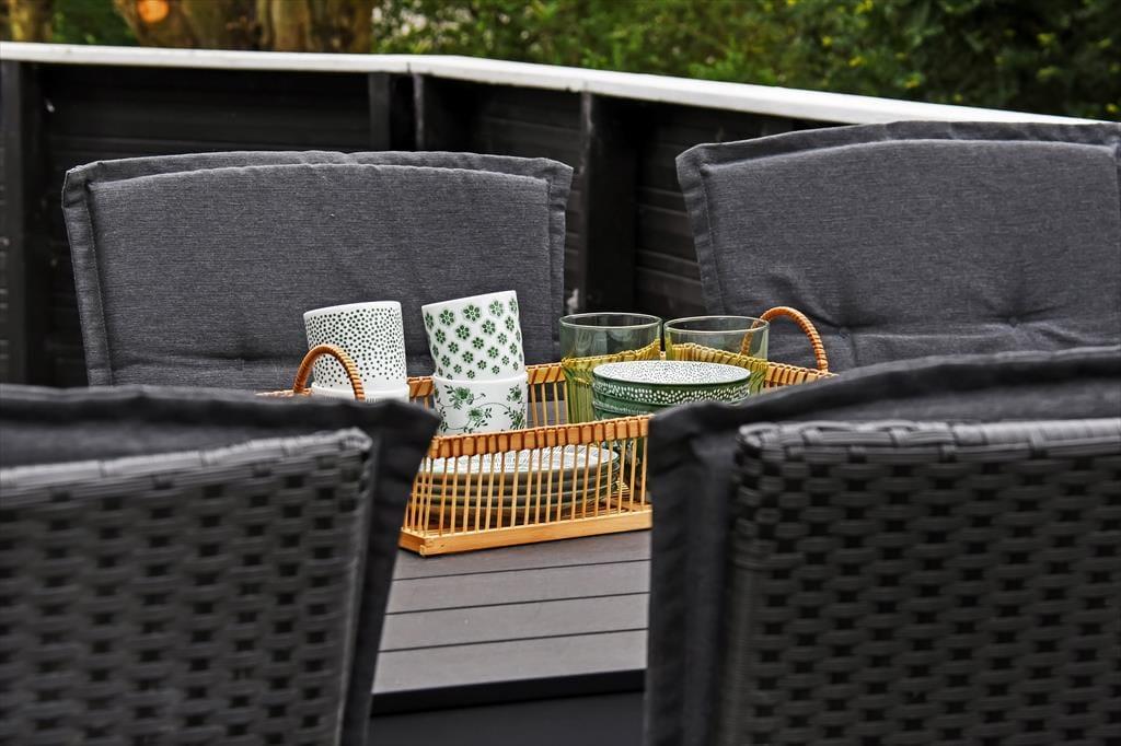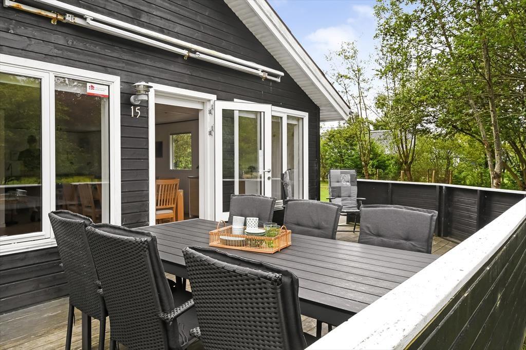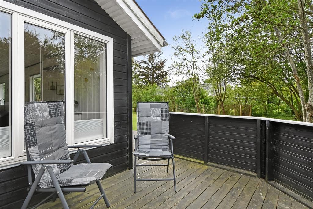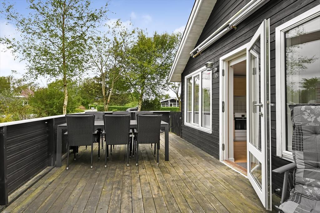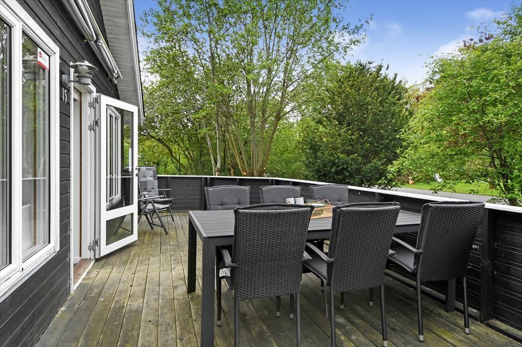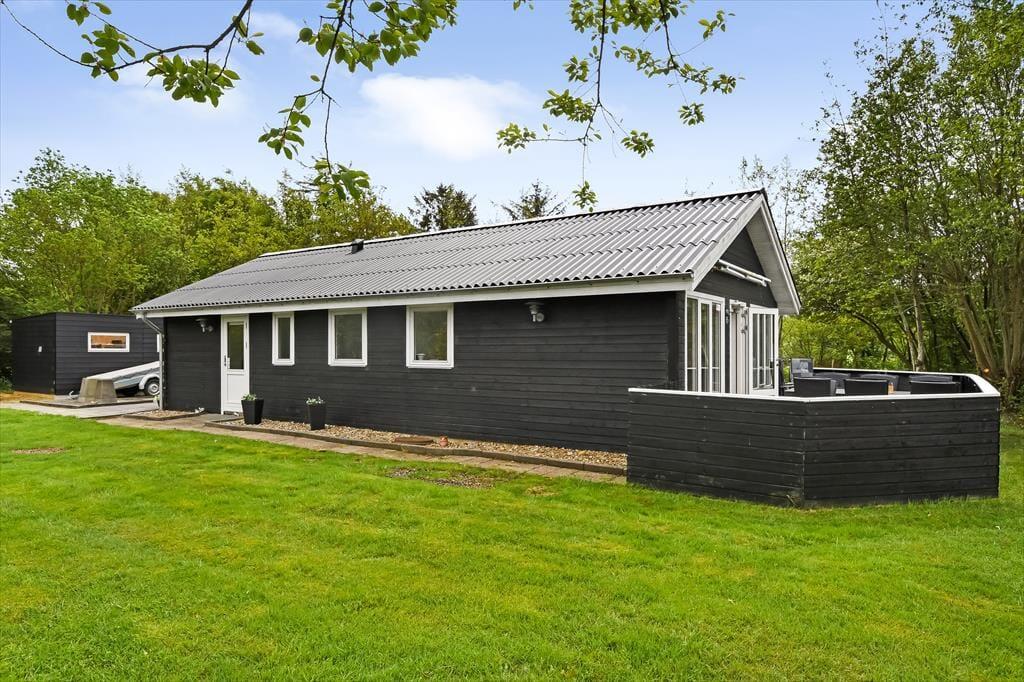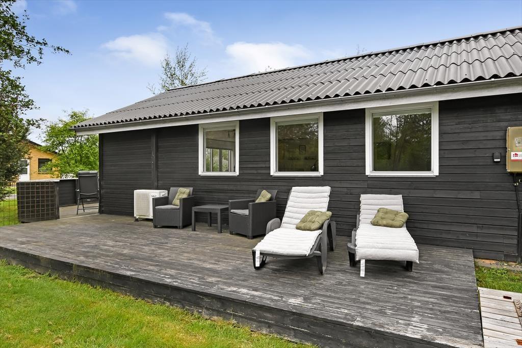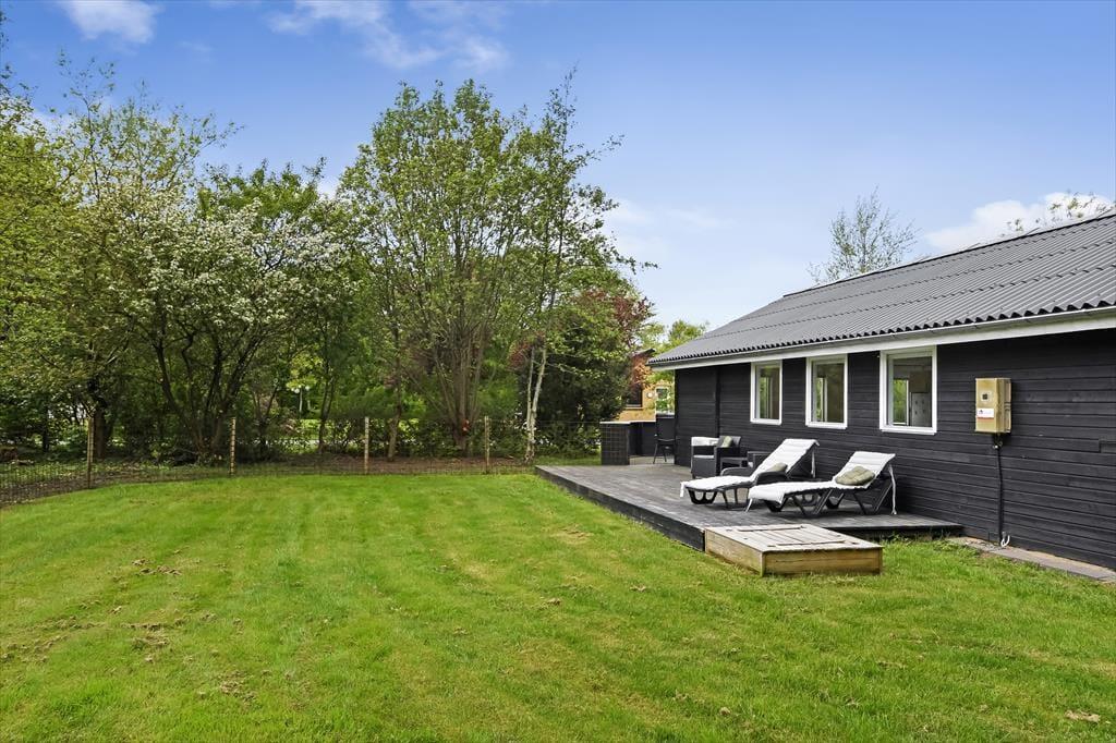 Når solen står højt på himlen, er det skønt at kunne læne sig tilbage i en liggestol på terrassen. På den 1.018 m2 store grund er der flere opholdspladser at vælge imellem, for en træterrasse breder sig både syd og vest for sommerhuset, og mod øst ligger et flisebelagt område, der også egner sig til afslapning, avislæsning, grill og meget mere. Vil I lege eller spille bold, er der god plads til at boltre sig på græsplænen. En del af den er indhegnet, hvilket kan være en rar detalje for familier med små børn.