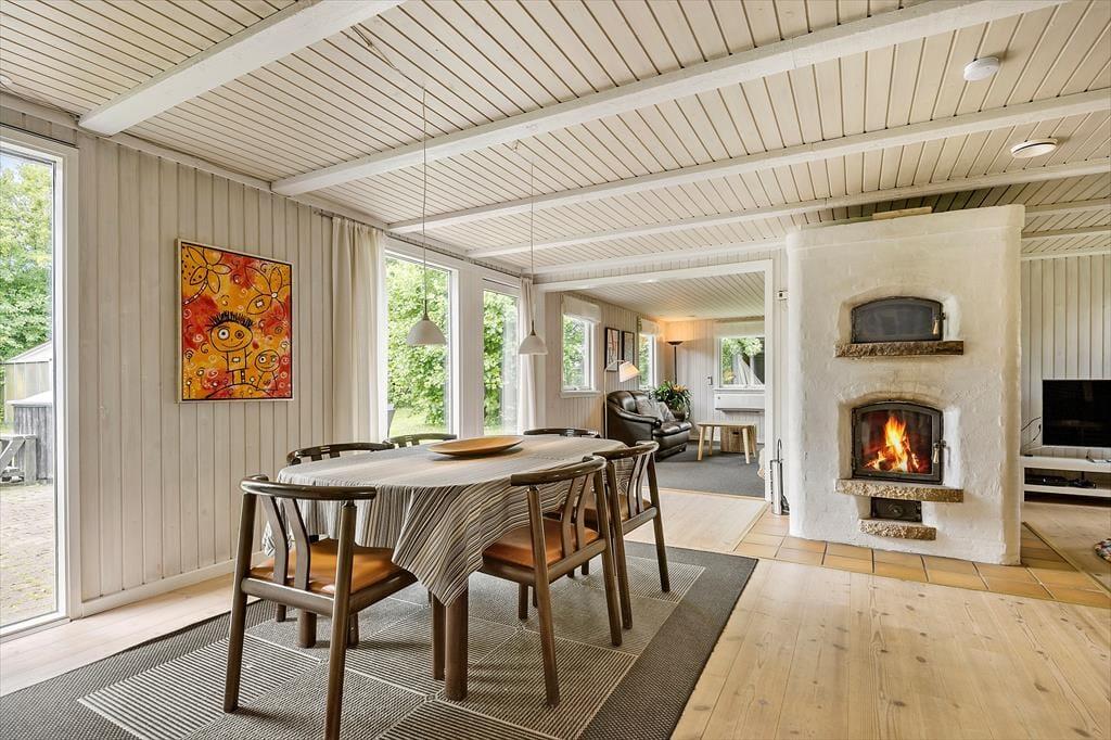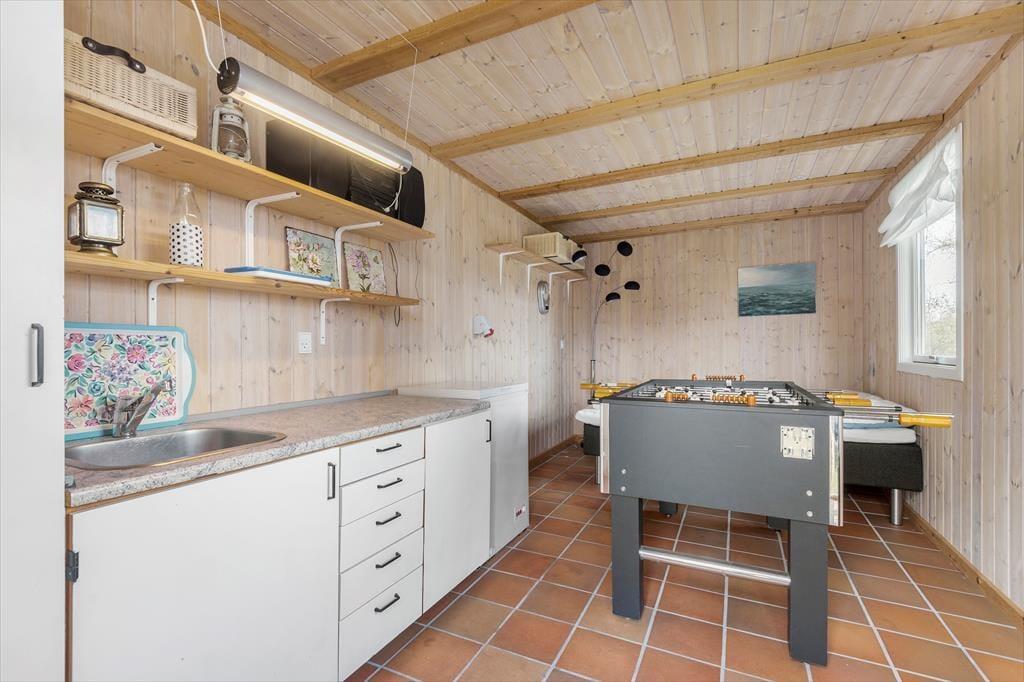 Dette store sommerhus byder på mange dejlige detaljer – inklusiv et bordfodboldbord, brændeovn i stuen og et vildmarksbad i den frodige have. Adressen er også værd at bemærke, for huset ligger på en rolig vej i Bork Havn i kort gåafstand fra bymidten, havnen og Ringkøbing Fjord.