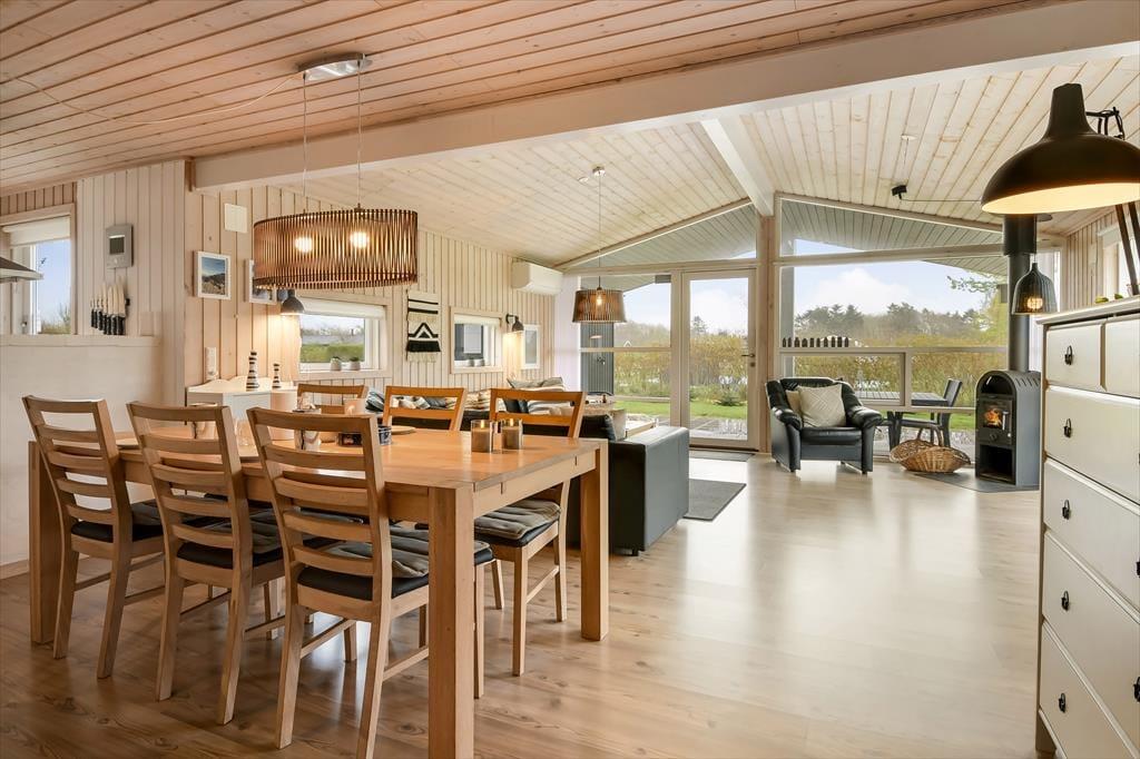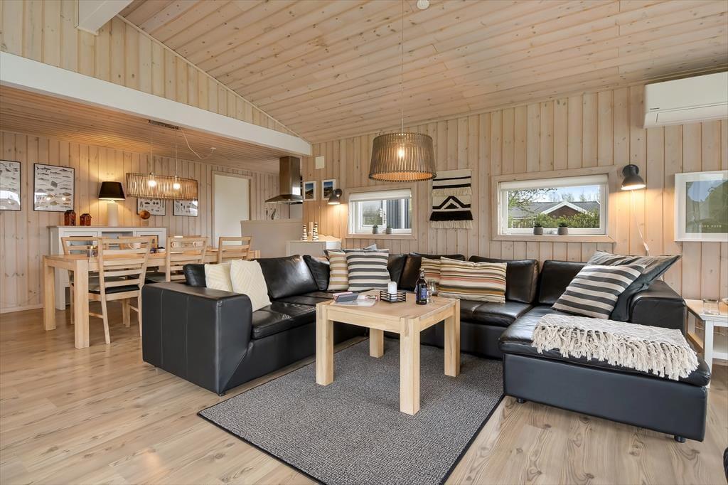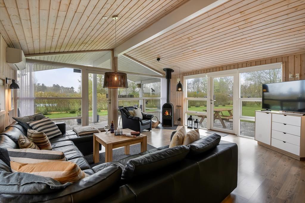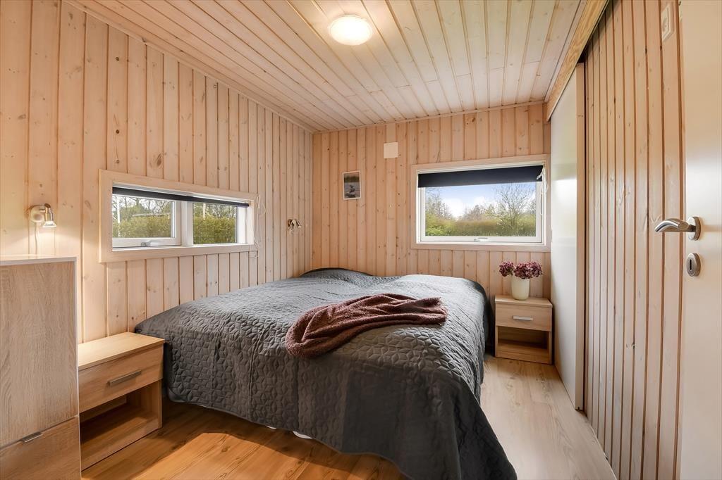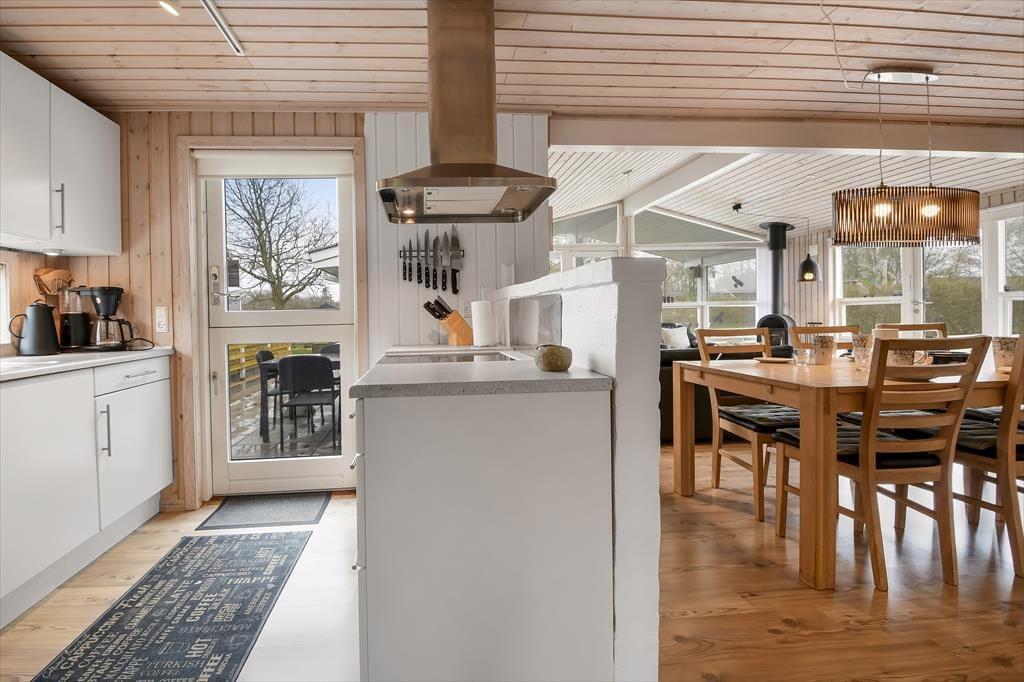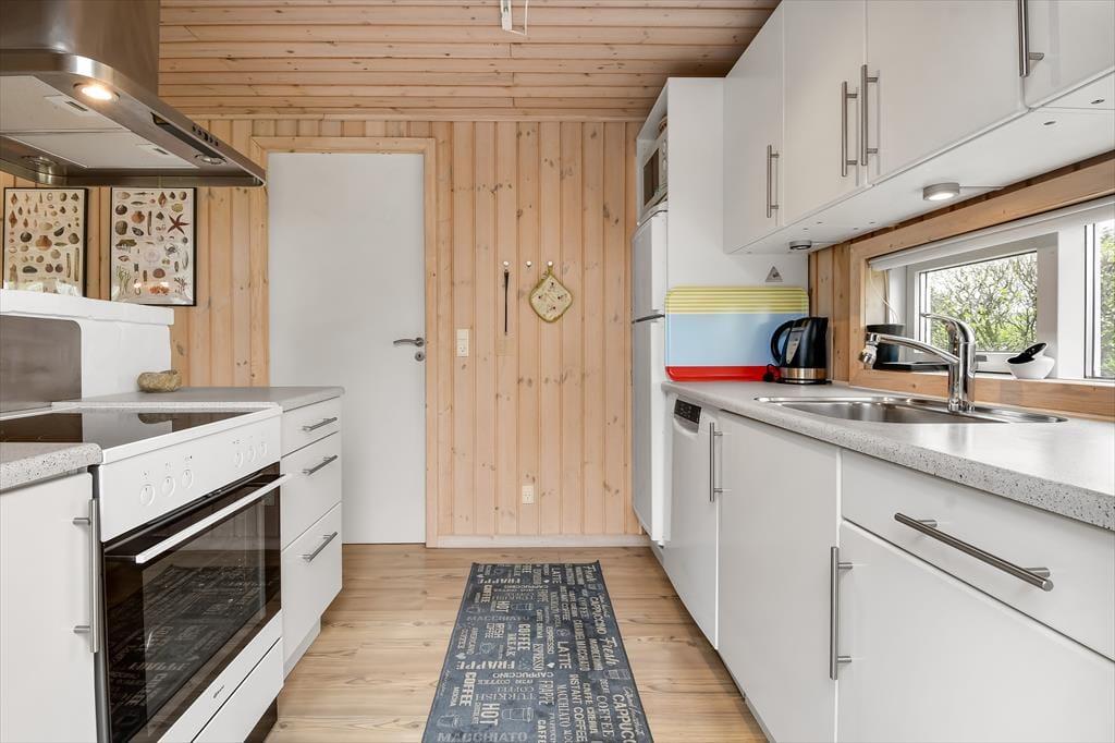Sommerhuset er et 86 m² stort eksemplar fra 2006, der fremstår pænt og velholdt. Planløsningen passer godt til seks personer, for der er to soveværelser med dobbeltseng og et tredje med køjeseng, så det er oplagt som børneværelse. Både store og små familiemedlemmer kan samles i stuen, der er et dejligt opholdsrum med loft til kip, et godt lysindfald og direkte udgang til terrassemiljøet. Derudover er der brændeovn, sofakrog og stort fladskærms-tv, så der er lagt op til mange gode og afslappende hyggestunder. Rummets spiseafsnit ligger lige ved køkkenet, som er udstyret med opvaskemaskine og andre gode hvidevarer. Brusebadeværelset fremstår pænt og rummeligt ligesom de øvrige rum, og så skal det for øvrigt nævnes, at huset er kørestolsvenligt med brede døre uden bundstykke.