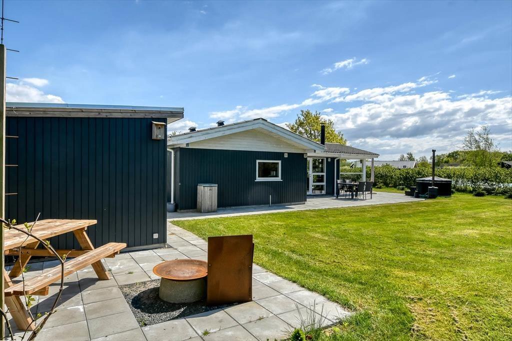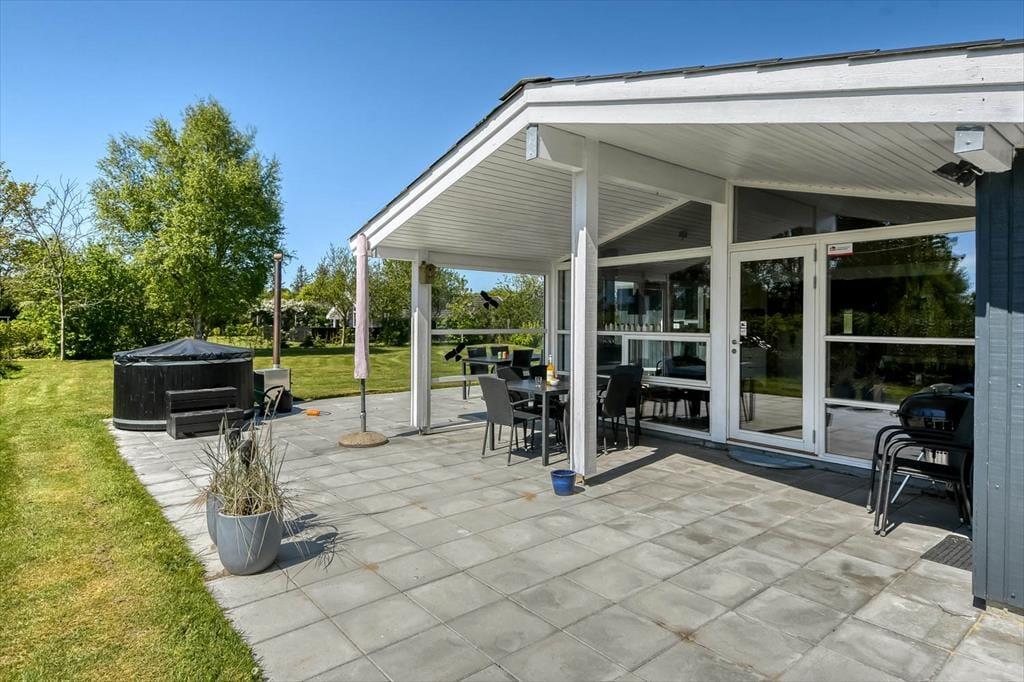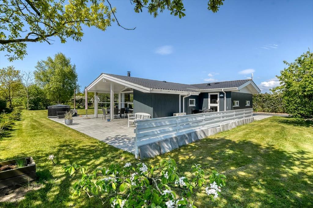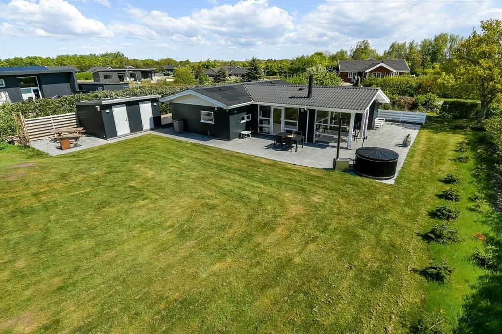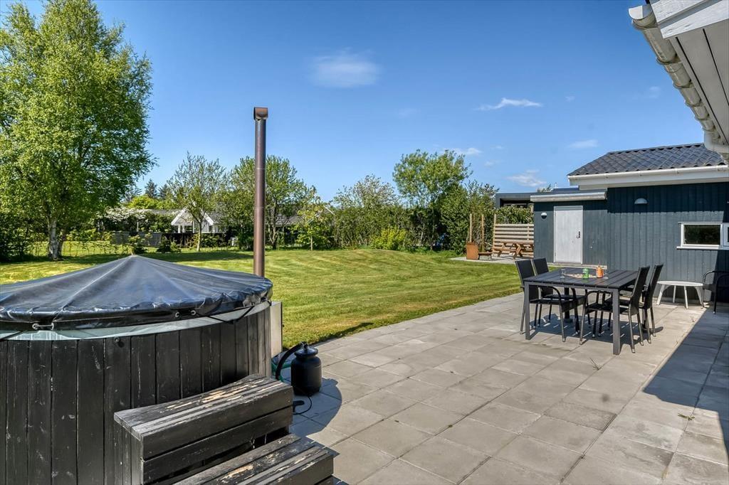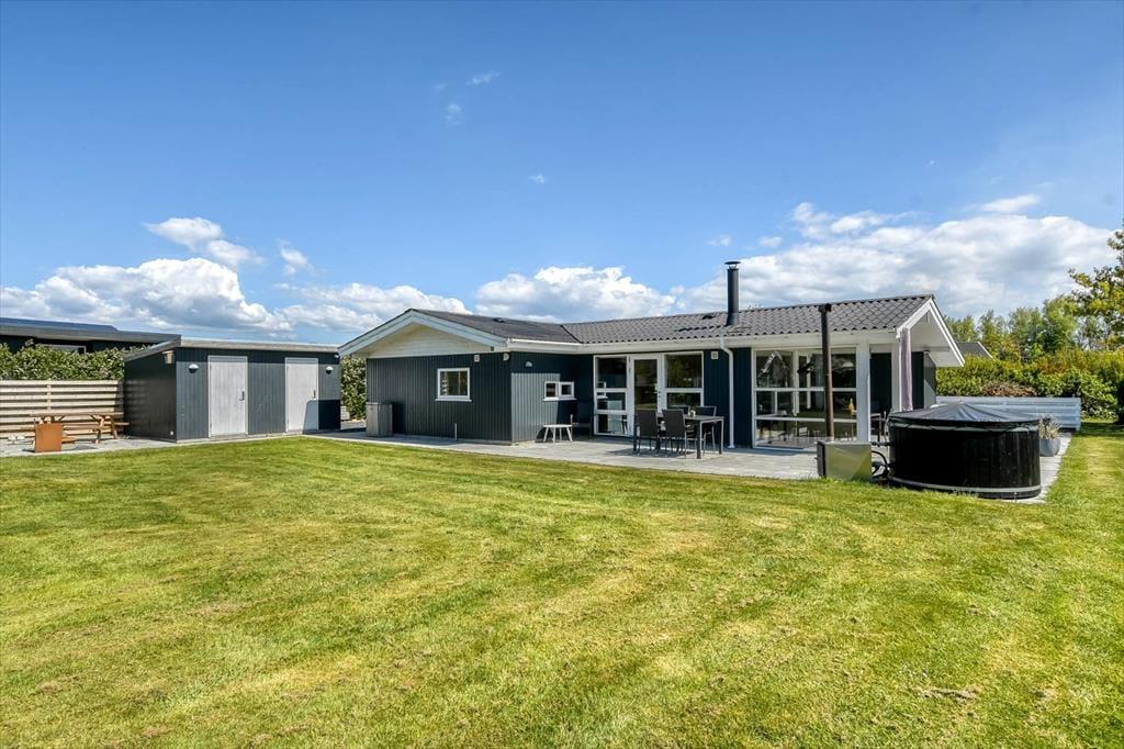 Ude i det fri har I god plads til at lege og slappe af på den 1213 m² store grund. Græsplænen omkranses af randbeplantning, og rundt om sommerhuset breder et stort og delvist overdækket terrasseområde sig, så I kan sætte jer lige der, hvor solforholdene er allerbedst.