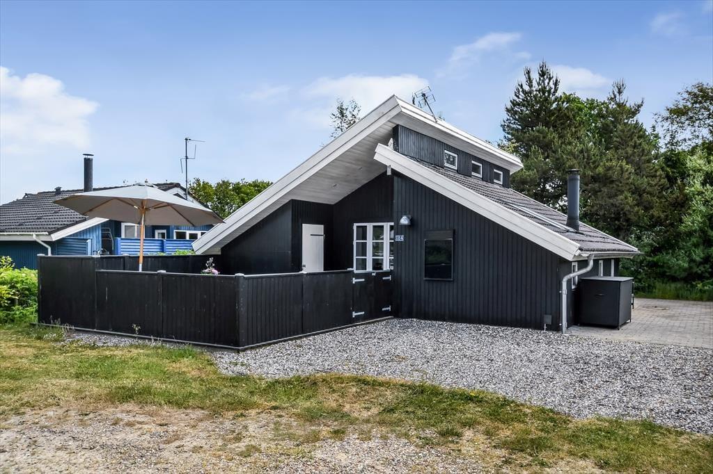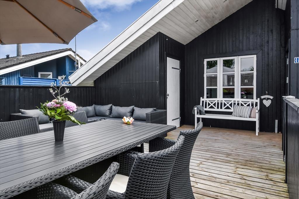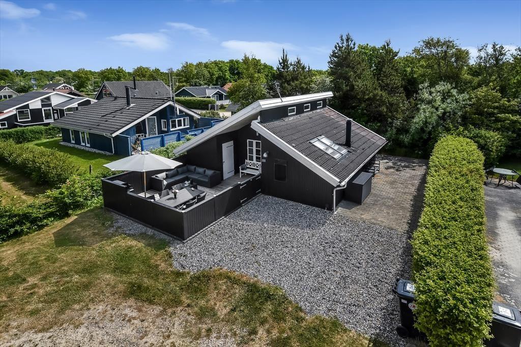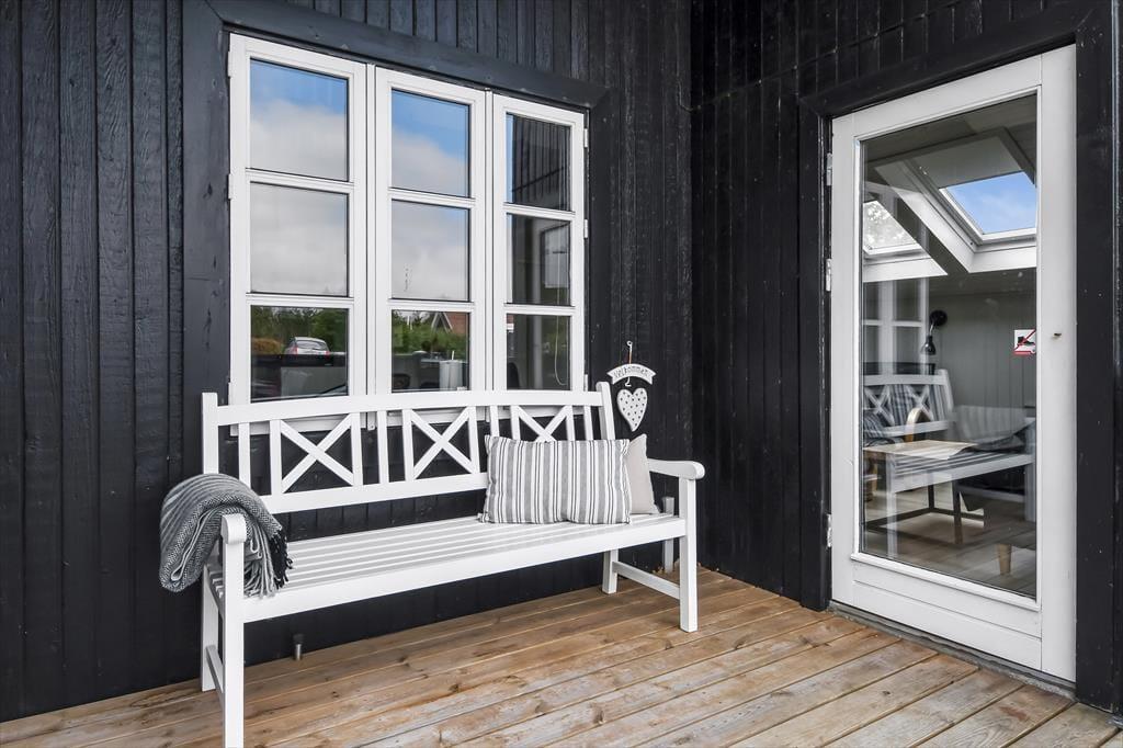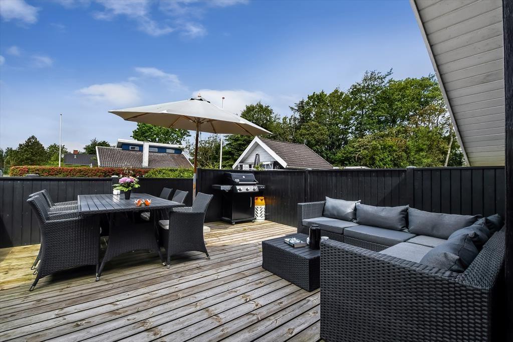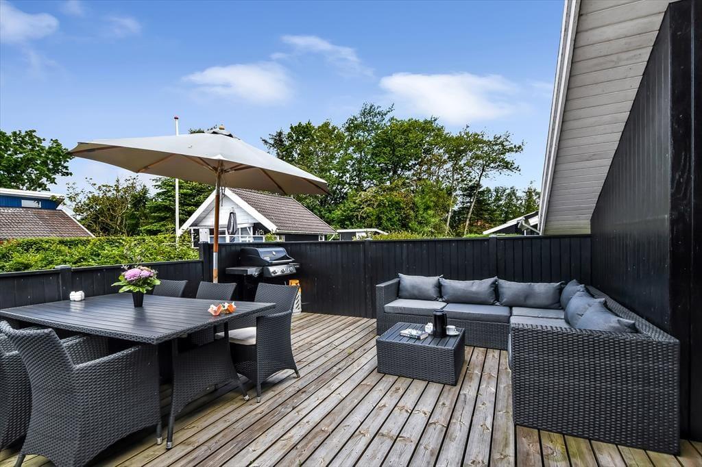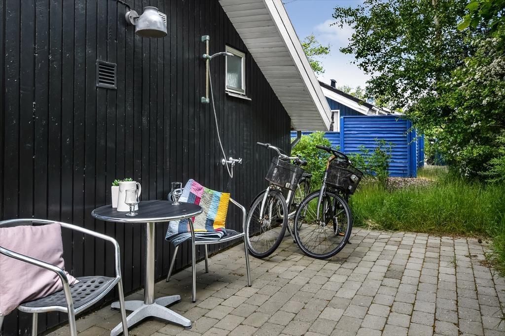 Sommerhusets delvist overdækkede træterrasse er afskærmet af hegn, og med en grill, en parasol og havemøbler af god kvalitet kan I se frem til mange rare stunder herude i solen. På den anden side af huset finder I en udebruser, så I kan tage morgenbad i det fri – eller skylle sand og fjordvand af, når I vender hjem fra en dukkert ved stranden i Bork Havn.