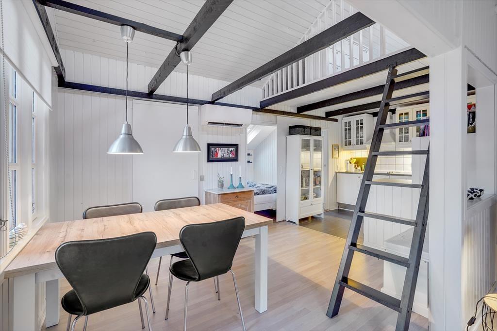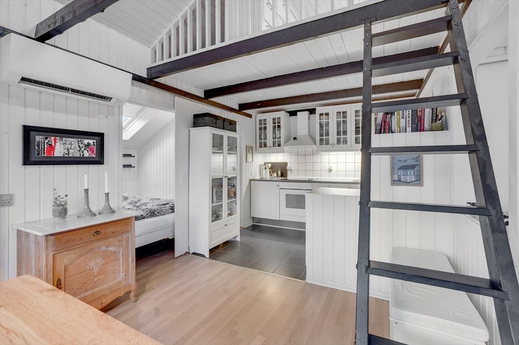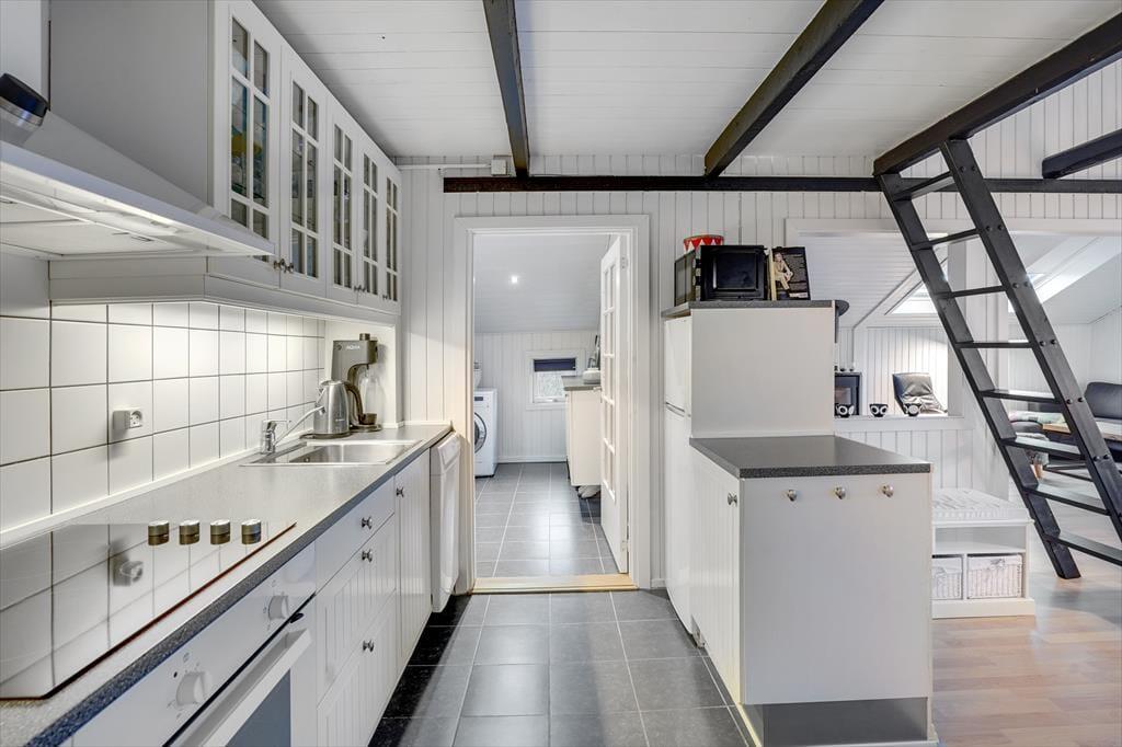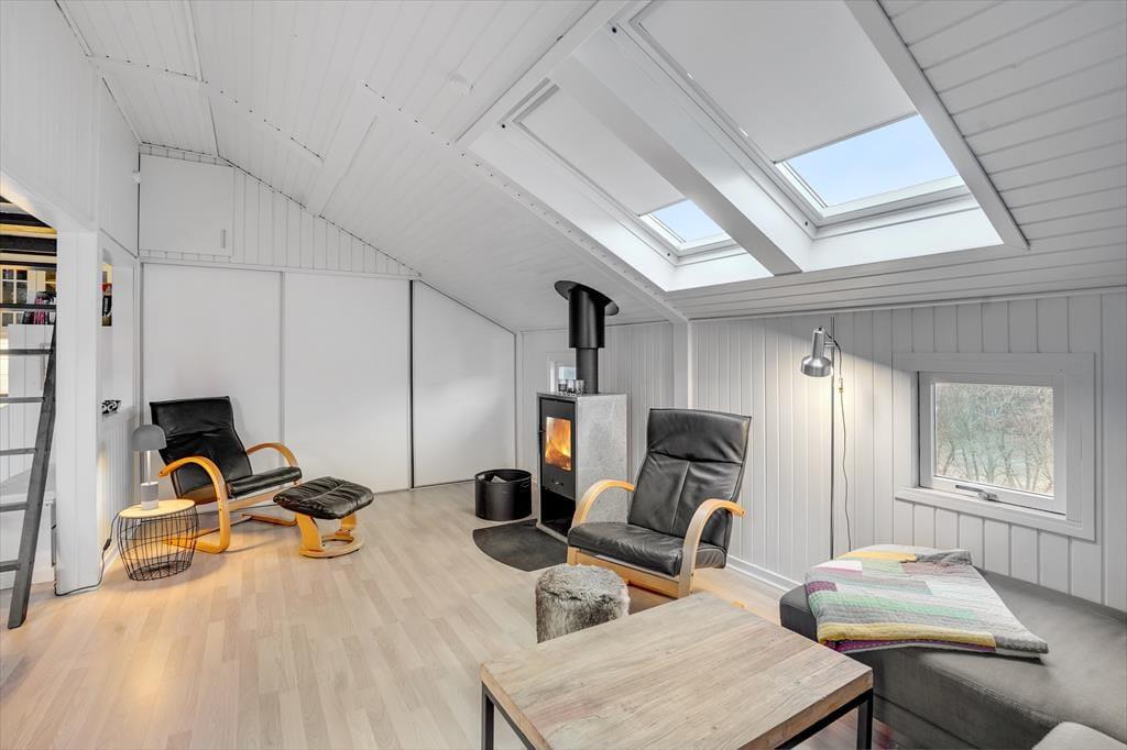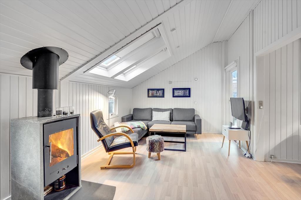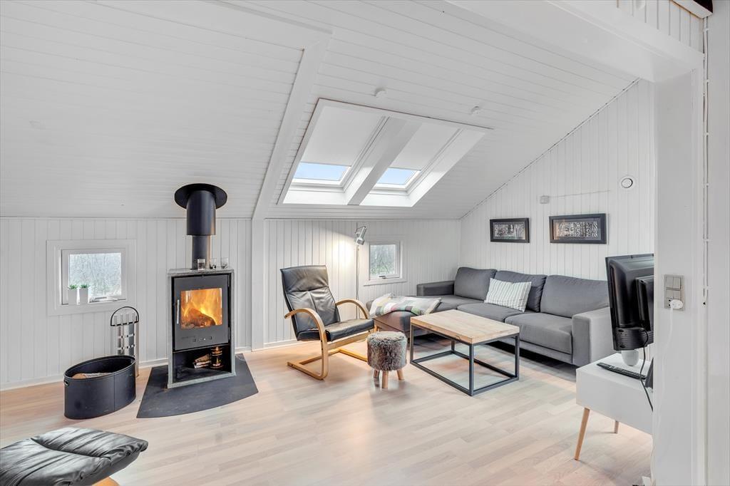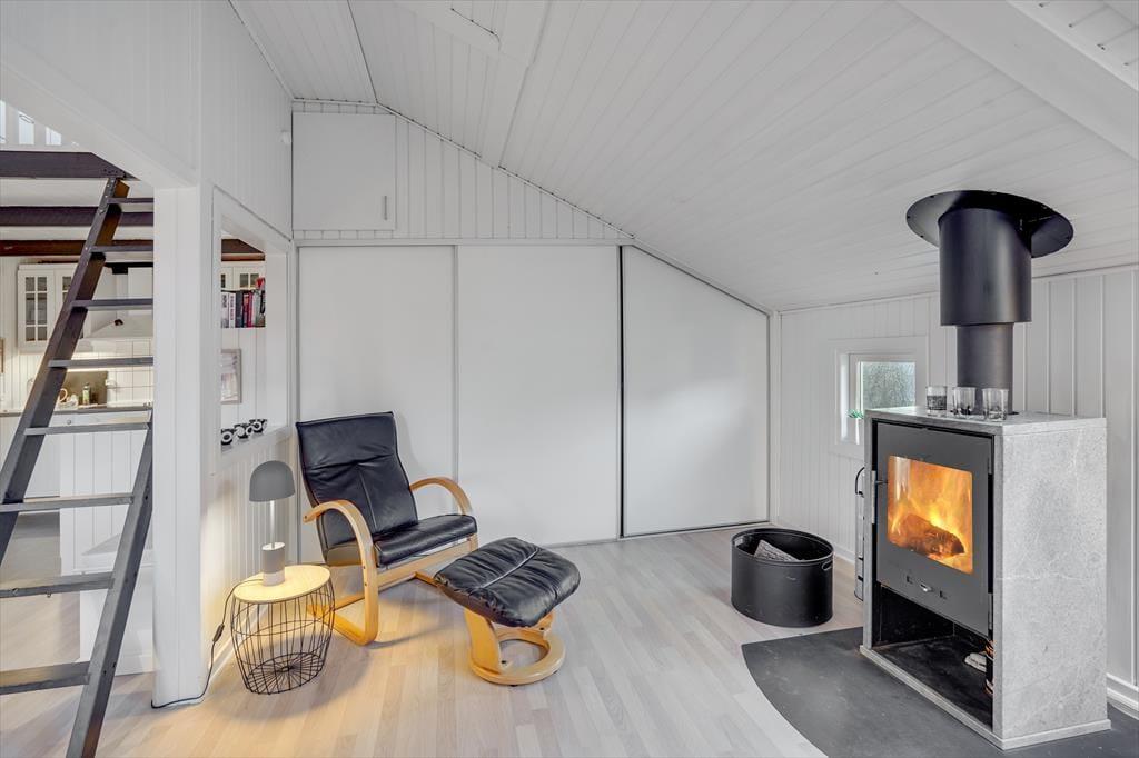 Atmosfæren er lys og indbydende inden døre i sommerhuset, og der er gjort god brug af hver eneste kvadratmeter. Fra husets bryggers træder I lige ind i et pænt og funktionelt køkken, der er udstyret med opvaskemaskine og andre gode hvidevarer. Den åbne forbindelse giver jer nem adgang til spisebordet, når maden skal serveres – og det betyder også, at I kan nyde varmen og flammernes skær fra brændeovnen, uanset om I deler et godt måltid mad eller slapper af i sofaafdelingen med strikketøjet eller en god film. Et brusebadeværelse og to soveværelser med dobbeltseng hører også med til planløsningen, og via en sti har I adgang til en god hems, der fint kan bruges til overnatning eller som hyggekrog i løbet af dagen.