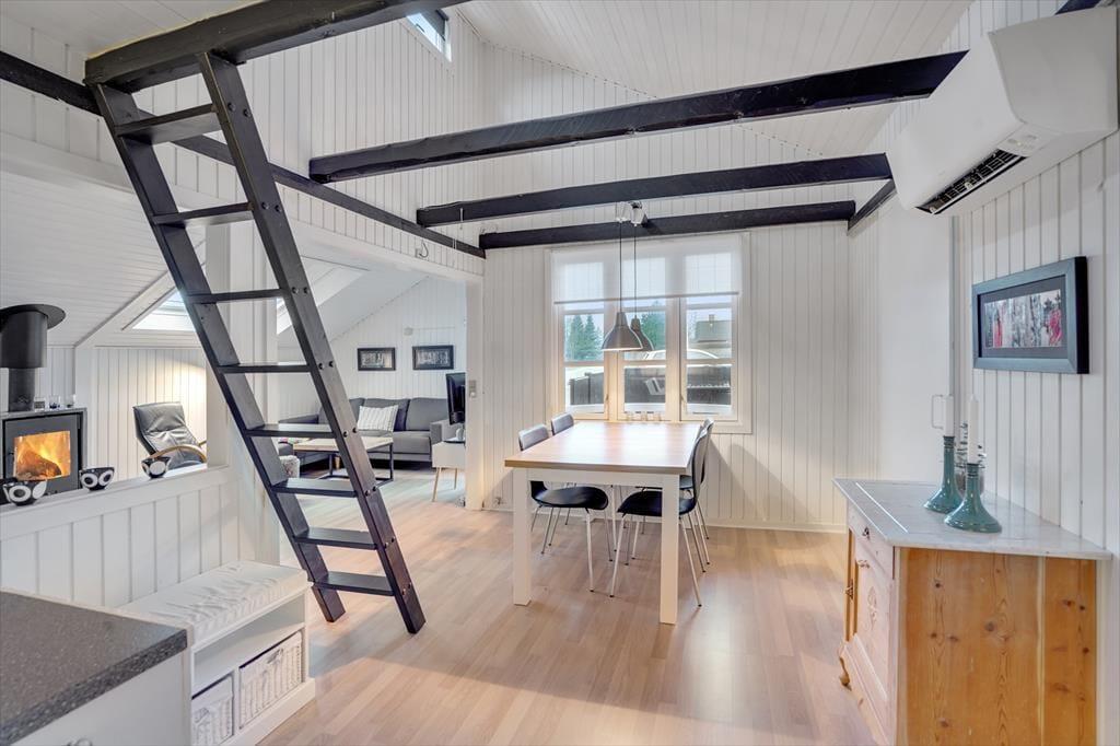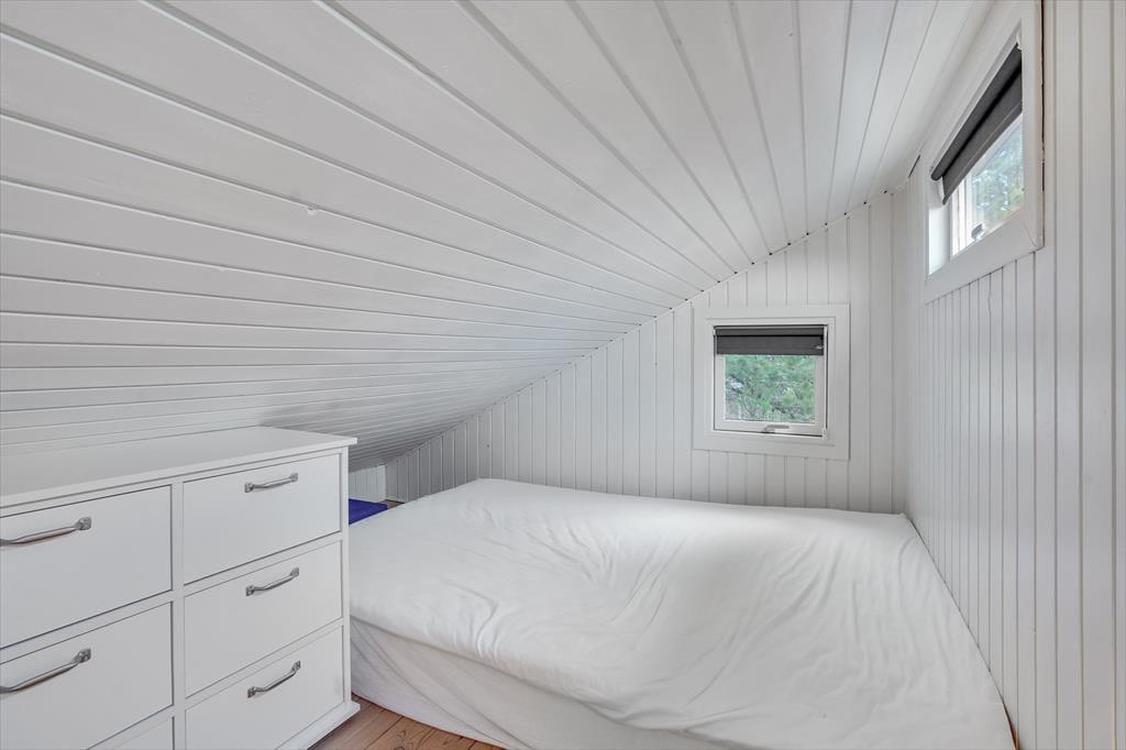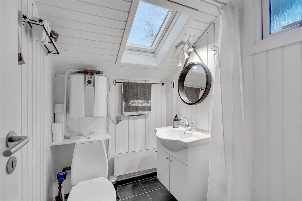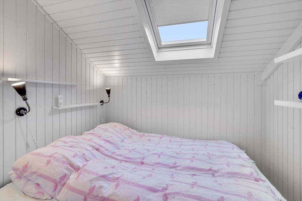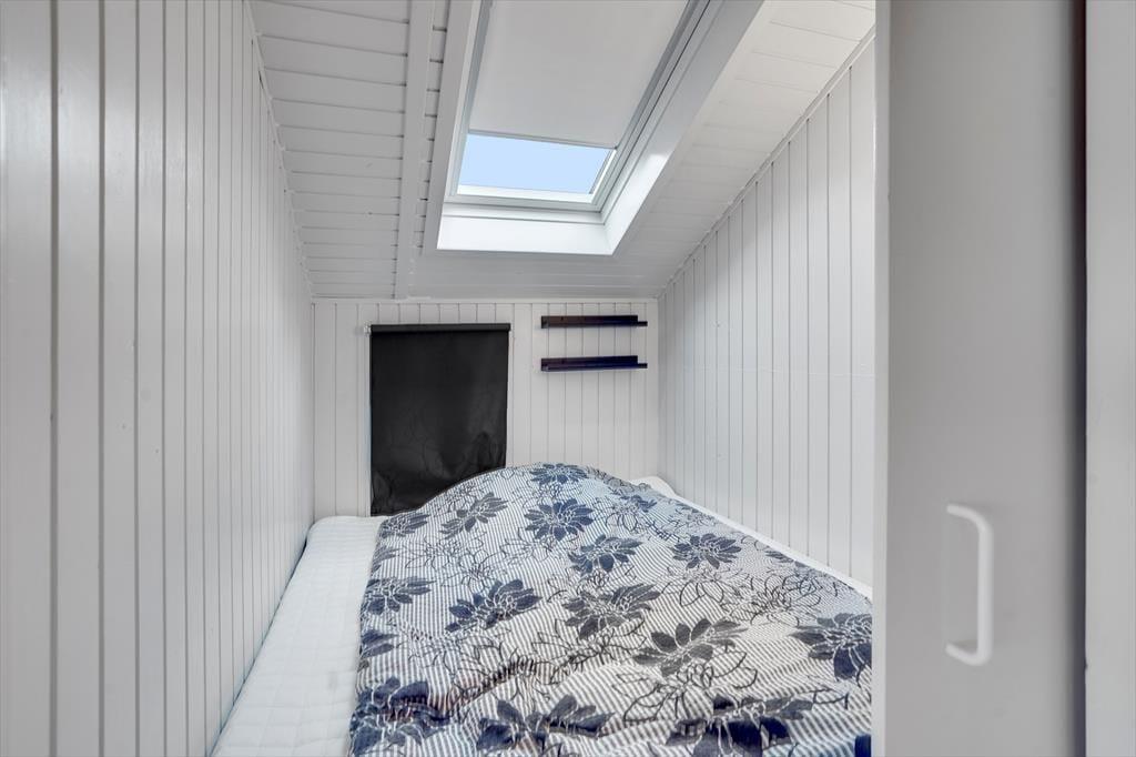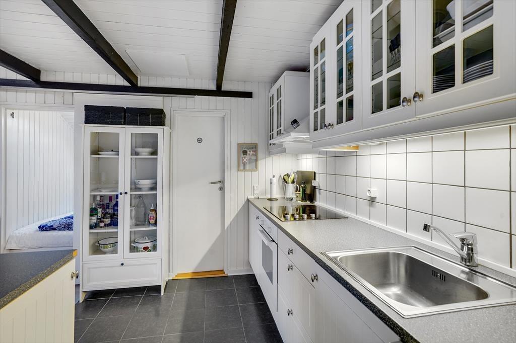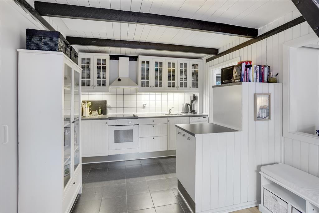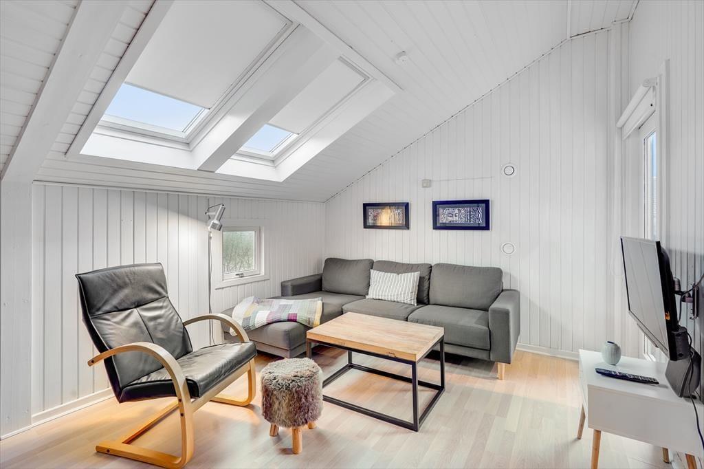 Atmosfæren er lys og indbydende inden døre i sommerhuset, og der er gjort god brug af hver eneste kvadratmeter. Fra husets bryggers træder I lige ind i et pænt og funktionelt køkken, der er udstyret med opvaskemaskine og andre gode hvidevarer. Den åbne forbindelse giver jer nem adgang til spisebordet, når maden skal serveres – og det betyder også, at I kan nyde varmen og flammernes skær fra brændeovnen, uanset om I deler et godt måltid mad eller slapper af i sofaafdelingen med strikketøjet eller en god film. Et brusebadeværelse og to soveværelser med dobbeltseng hører også med til planløsningen, og via en sti har I adgang til en god hems, der fint kan bruges til overnatning eller som hyggekrog i løbet af dagen.