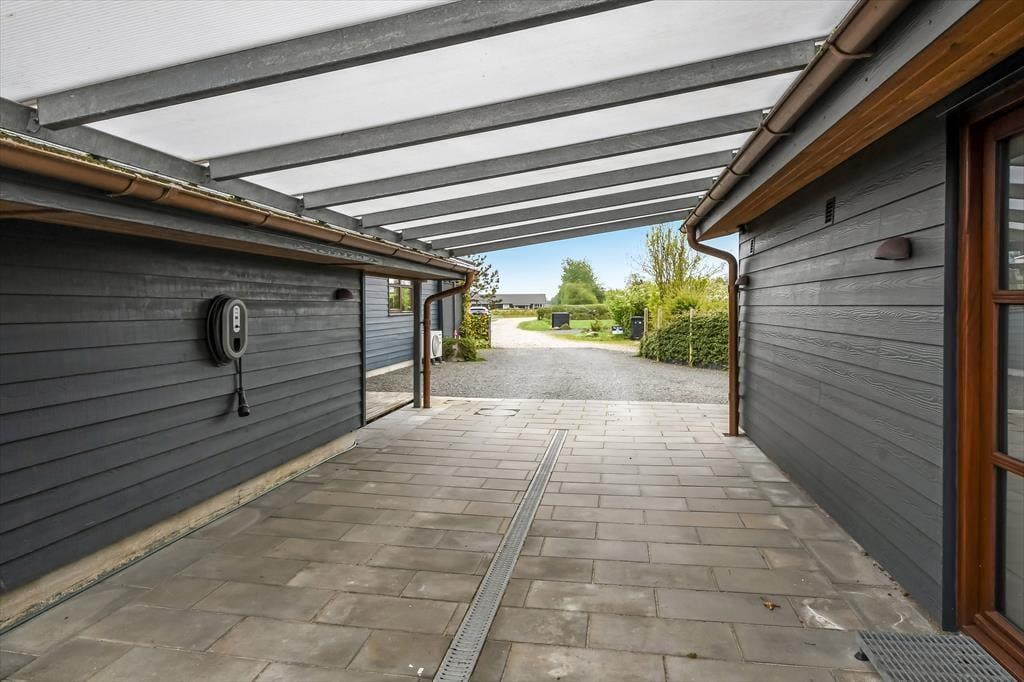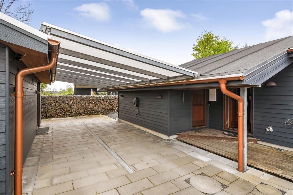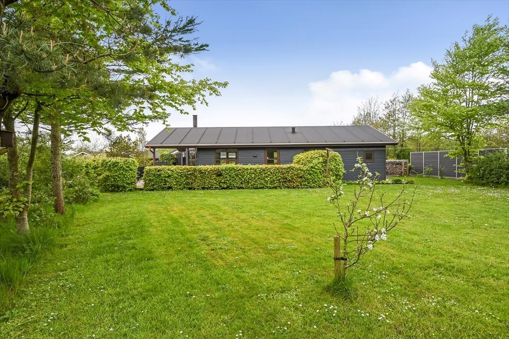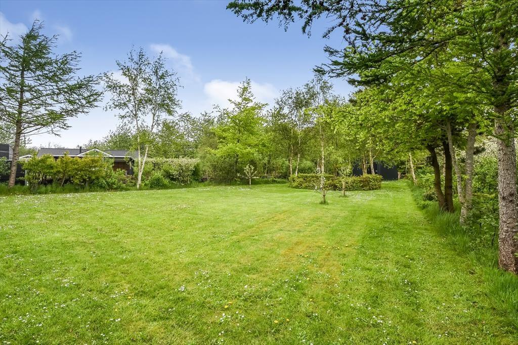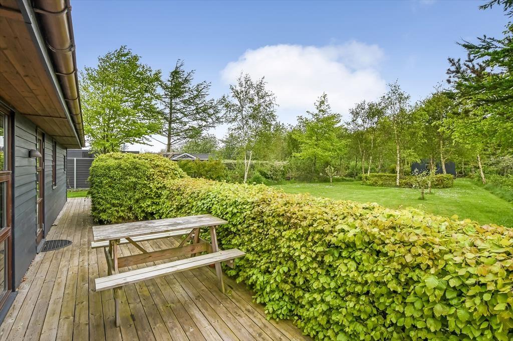 Sommerhusgrunden fremstår dejligt frodig, når bøgehækken er sprunget ud, og der er blade på birketræerne og den øvrige bevoksning. Det er herligt at kunne slappe af midt i alt det grønne, uanset om du soler dig på husets træterrasse eller leger med børnene på græsplænen. Terrassen er for øvrigt delvist overdækket, og i naturgrundens østlige ende er der etableret en hyggelig opholdsplads i træernes skygge, hvis du trænger til at flytte dig lidt rundt. I forlængelse af indkørslen er der en carport til bilen – og hvis det er en elbil, du ejer, er der for øvrigt en lader til den her ved huset.