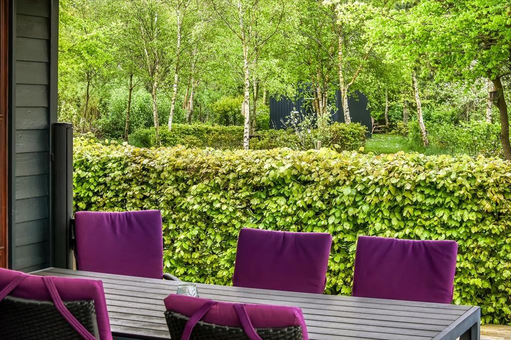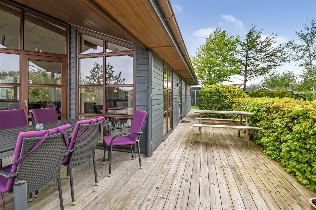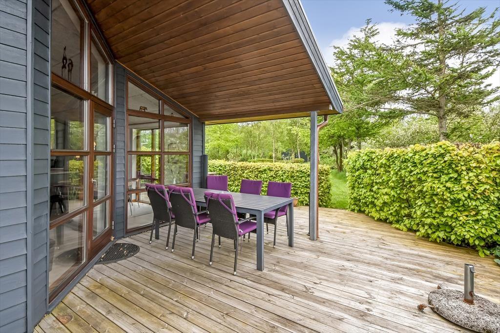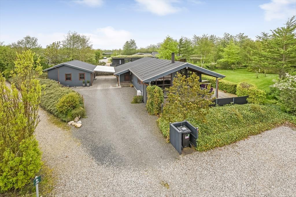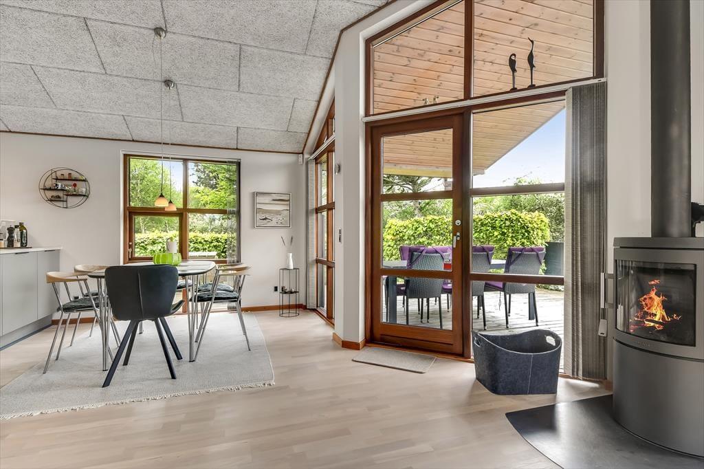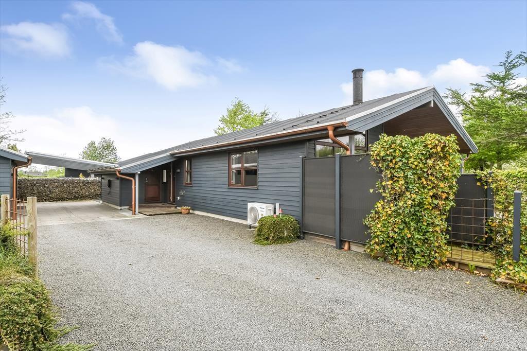 Sommerhusgrunden fremstår dejligt frodig, når bøgehækken er sprunget ud, og der er blade på birketræerne og den øvrige bevoksning. Det er herligt at kunne slappe af midt i alt det grønne, uanset om du soler dig på husets træterrasse eller leger med børnene på græsplænen. Terrassen er for øvrigt delvist overdækket, og i naturgrundens østlige ende er der etableret en hyggelig opholdsplads i træernes skygge, hvis du trænger til at flytte dig lidt rundt. I forlængelse af indkørslen er der en carport til bilen – og hvis det er en elbil, du ejer, er der for øvrigt en lader til den her ved huset.