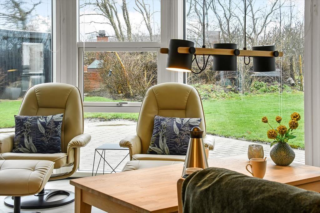 Også ude i det fri er der mange gode opholdspladser at vælge imellem, for rundt om huset venter der flere skønne terrasser. Det er dermed helt op til dig, om du vil sidde under overdækningen eller finde den bedste solplet – og der er selvfølgelig også rig mulighed for at lege og spille bold på græsplænen, hvis du hellere vil tumle med hunden eller hygge dig med børnene. Den lukkede grund er med sine 1533 m2 dejligt stor, og så ligger den ganske ugeneret for enden af en blind vej og som nabo til åbne marker.