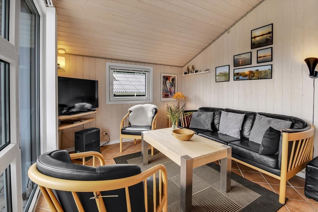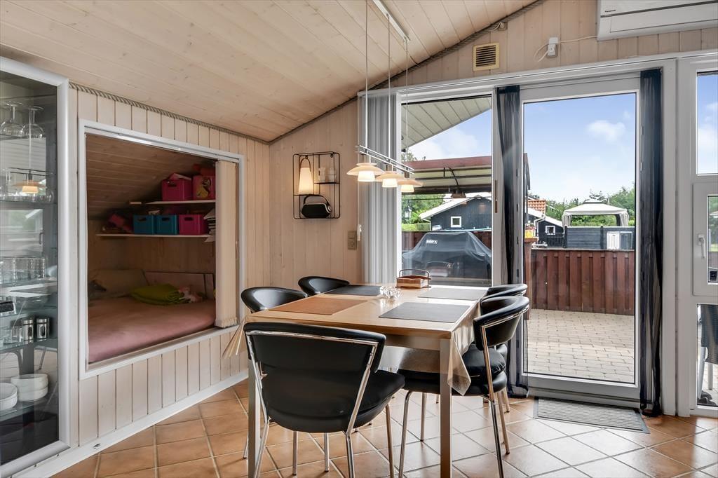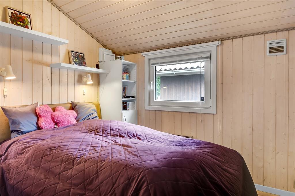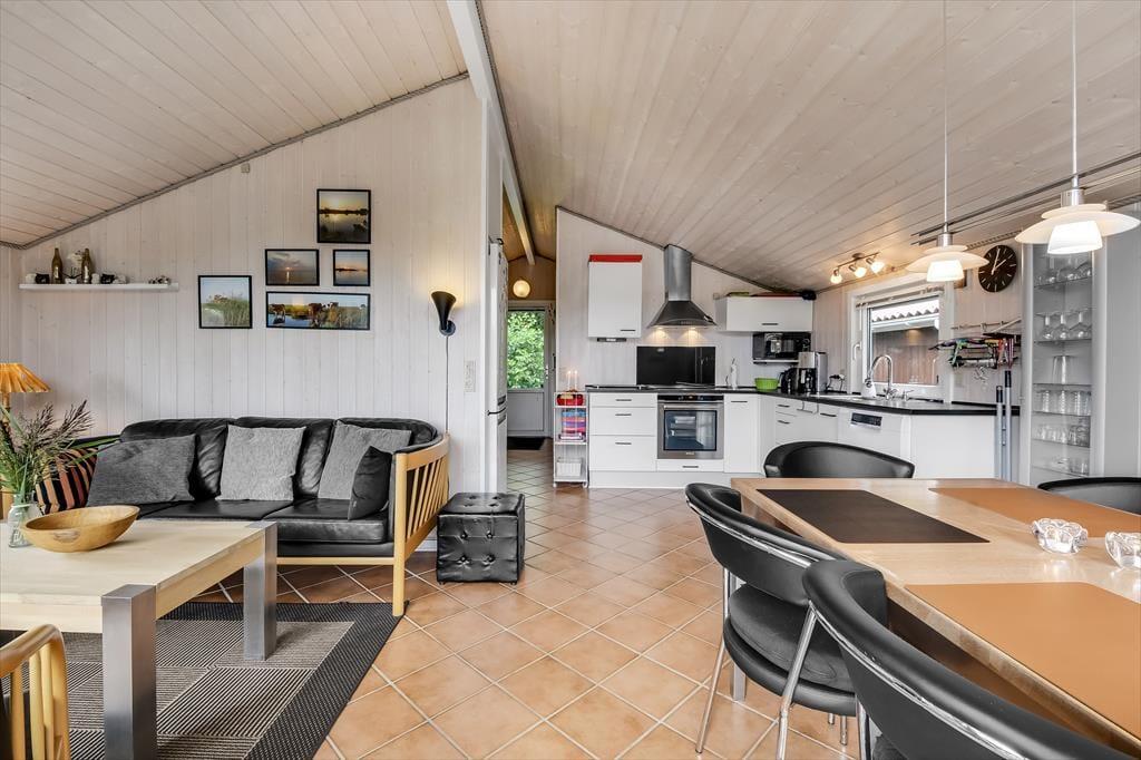 Indenfor bliver I mødt af en lys og åben gang, der leder direkte ind i det flotte køkken, der hænger sammen med stuen. Huset har plads til fire gæster, der uden problemer vil føle sig tilpas. På begge sider af gangen findes de to soveværelser, begge udstyret med TV og skabsplads til al bagagen, og ved siden af køkkenet har I et funktionelt badeværelse med bruseniche. Stuen med et stort vinduesparti mod syd gør den lys og indbydende – og samtidig er det nemt at styre madlavningen herfra. De små kan krybe ind i den fine alkove, der kan bruges til leg – eller til en middagslur. Alt i alt et super dejligt feriehus med højt til loftet og masser af sjæl.