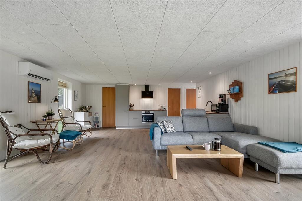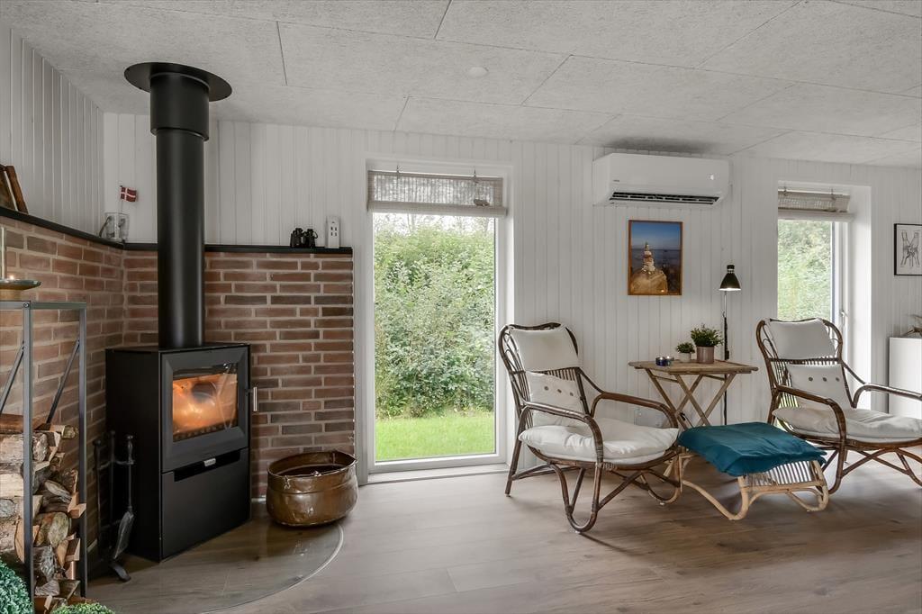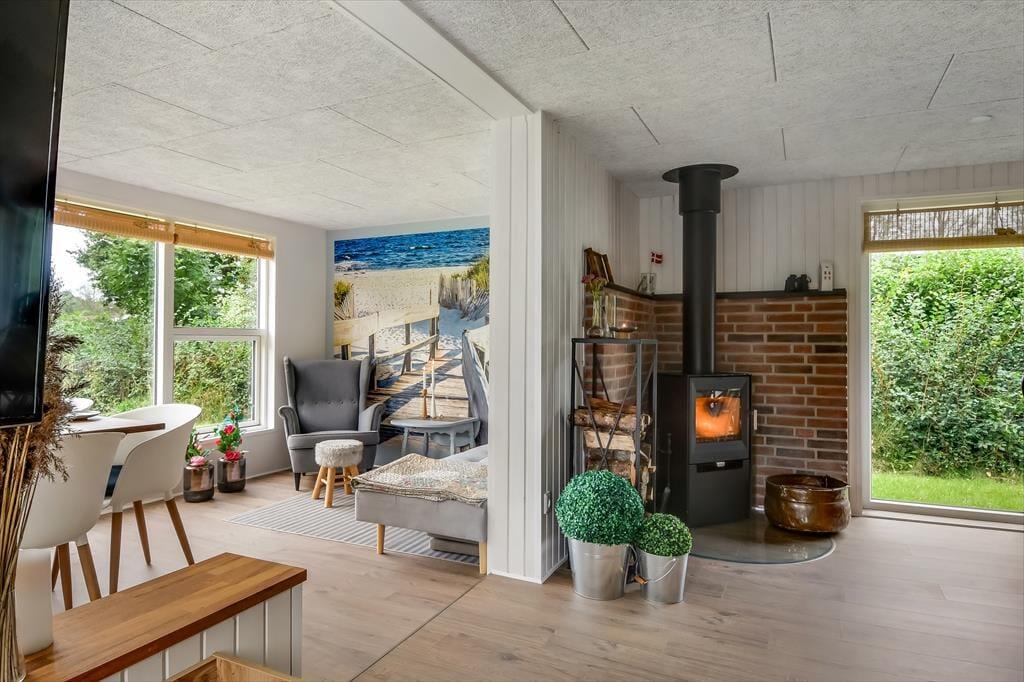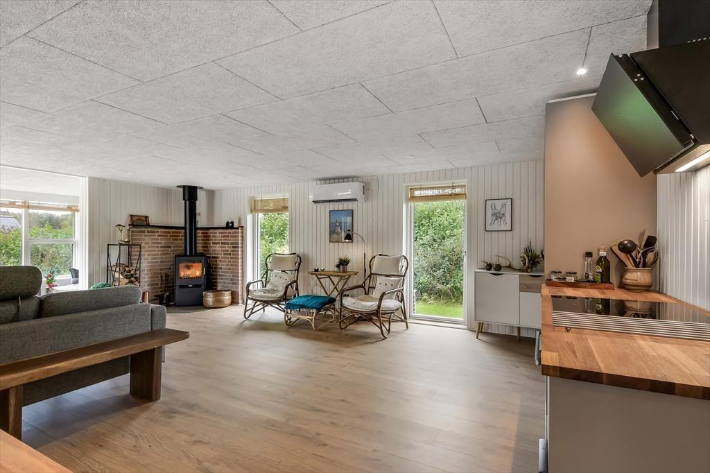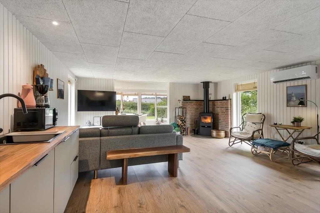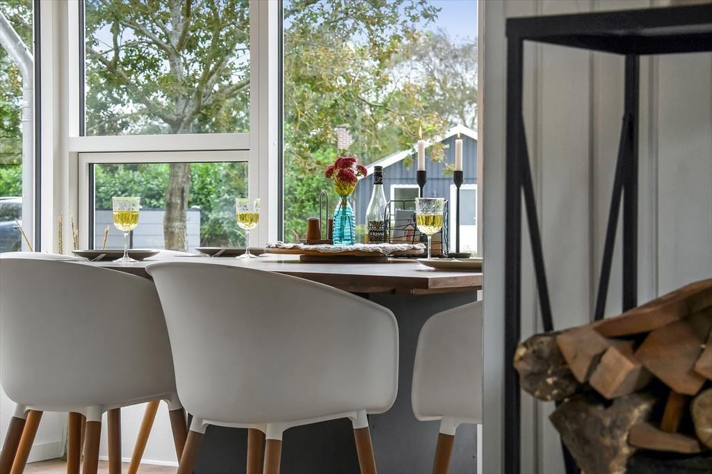Feriehuset blev gennemrenoveret i 2022, og der er ikke sparet på detaljerne, så huset er det perfekte sted at skabe gode sommerhusminder. I det store opholdsrum centralt i huset er der et lyst og åbent køkken, der er i åben forbindelse med opholdsafdelingen. Her er der både lænestole og en stor sofa, og brændeovnen er med til at skabe den perfekte stemning, når det bliver mørkt og koldt udenfor. Længere fremme finder I spiseafdelingen, hvor der også er gjort plads til en hyggekrog med en lækker lænestol og en day-bed, perfekt, hvis I er til en god bog eller en middagslur. Fra spiseafdelingen har I en skøn udsigt til forhaven, men I kan stadig nyde måltidet uforstyrret. Derudover har huset et rummeligt badeværelse med bruser og en kombineret vaskemaskine, samt tre soveværelser med plads til i alt 5 personer. Et funktionelt og herligt hus med masser af sjæl.