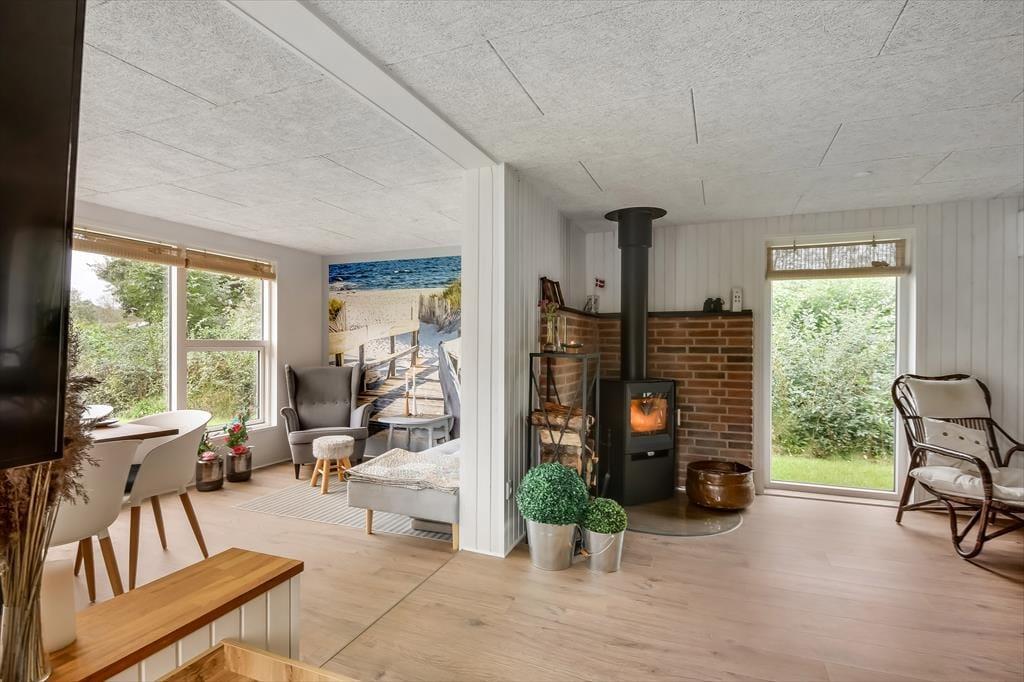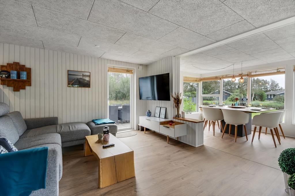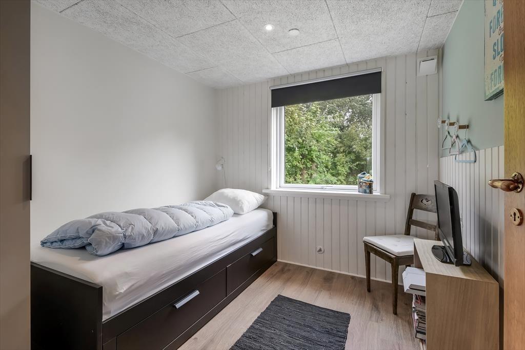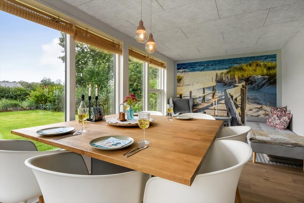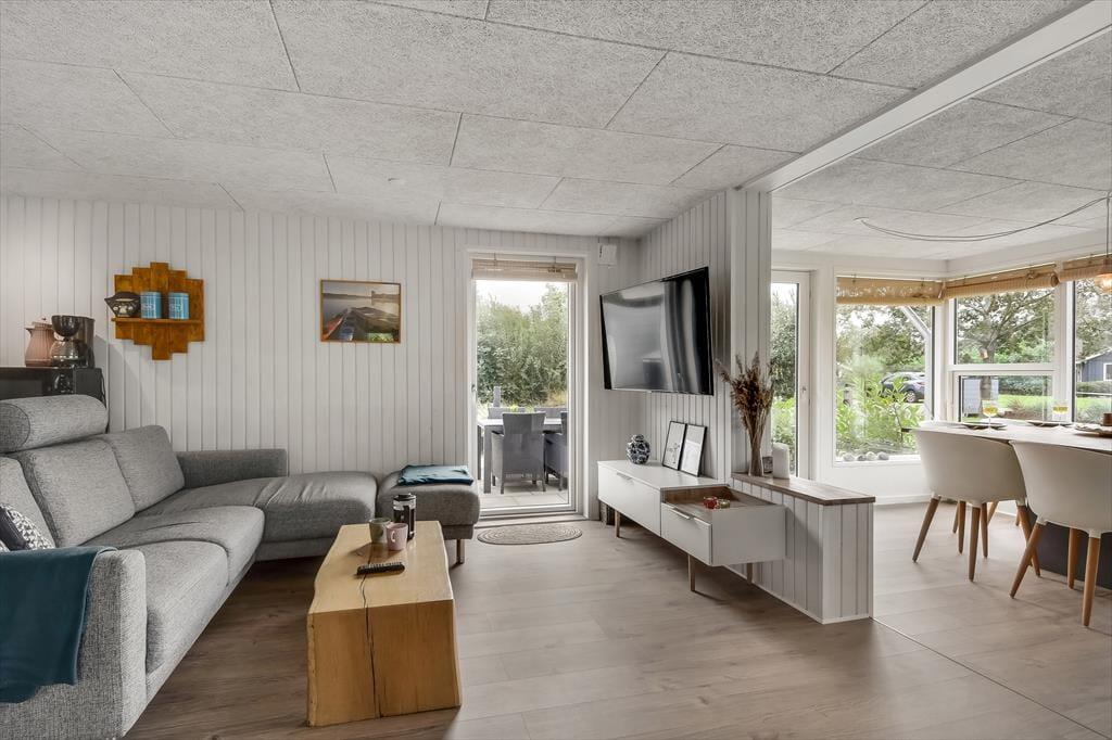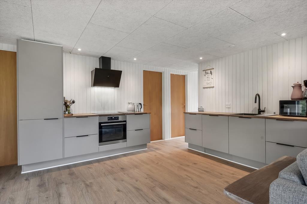 Feriehuset blev gennemrenoveret i 2022, og der er ikke sparet på detaljerne, så huset er det perfekte sted at skabe gode sommerhusminder. I det store opholdsrum centralt i huset er der et lyst og åbent køkken, der er i åben forbindelse med opholdsafdelingen. Her er der både lænestole og en stor sofa, og brændeovnen er med til at skabe den perfekte stemning, når det bliver mørkt og koldt udenfor. Længere fremme finder I spiseafdelingen, hvor der også er gjort plads til en hyggekrog med en lækker lænestol og en day-bed, perfekt, hvis I er til en god bog eller en middagslur. Fra spiseafdelingen har I en skøn udsigt til forhaven, men I kan stadig nyde måltidet uforstyrret. Derudover har huset et rummeligt badeværelse med bruser og en kombineret vaskemaskine, samt tre soveværelser med plads til i alt 5 personer. Et funktionelt og herligt hus med masser af sjæl.