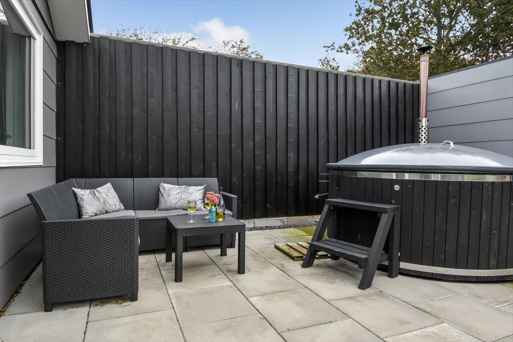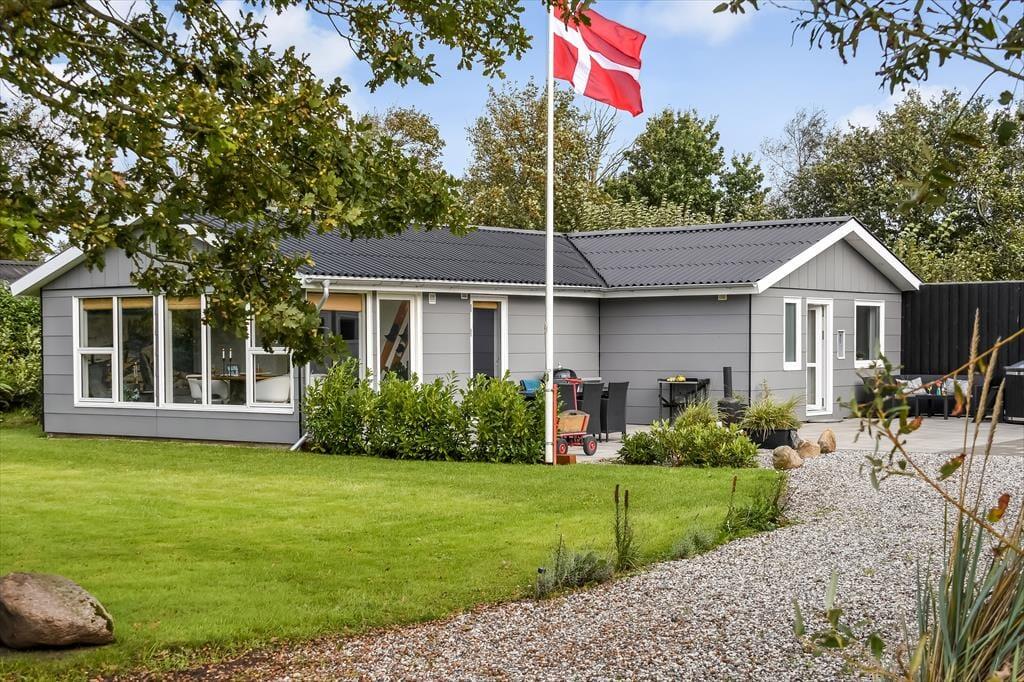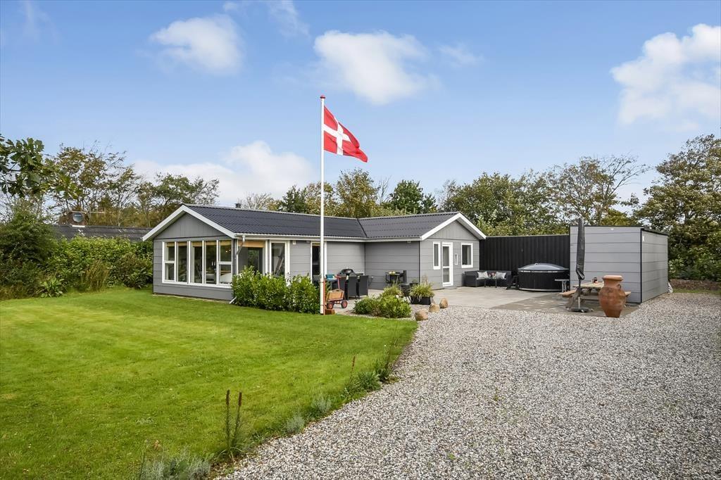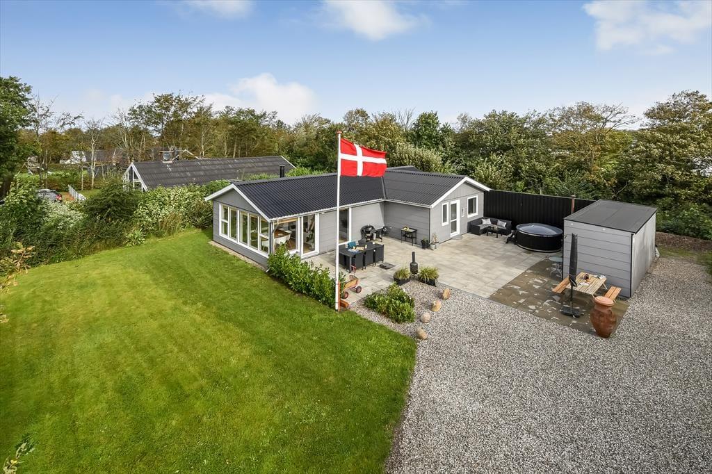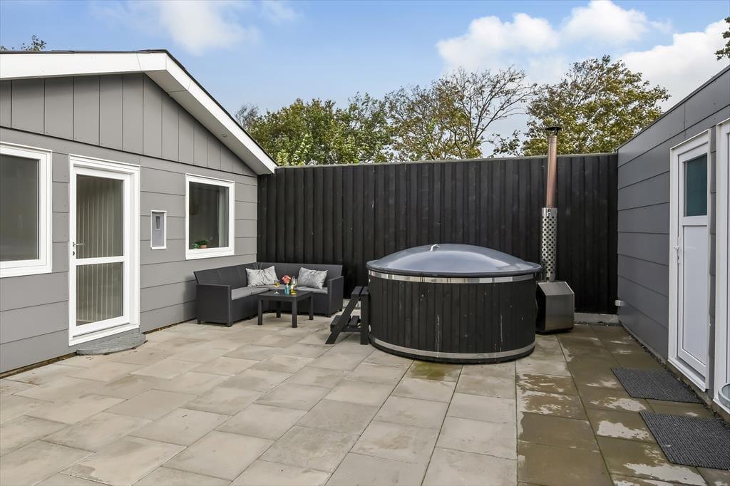 Huset ligger på vænget Vester Fælled i Bork Havn, som er dejligt uforstyrret, men stadig tæt på den livlige havnepromenade i Bork Havn. Husets terrasse er det første, I møder, når I parkeret bilen. Terrassen er sydvendt og åben, så her er der masser af sol. Udenfor er der både spisepladser og hyggekroge samt en grill, og hvis vejret tillader det, så har huset også et flot og indbydende vildmarksbad. Inde fra huset er der flere udgange til terrassen, og dette gør det nemt både at servere måltiderne udenfor, samt at holde styr på hele familien.