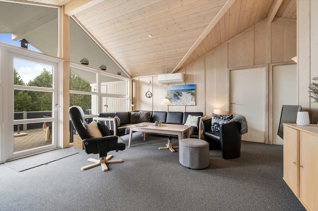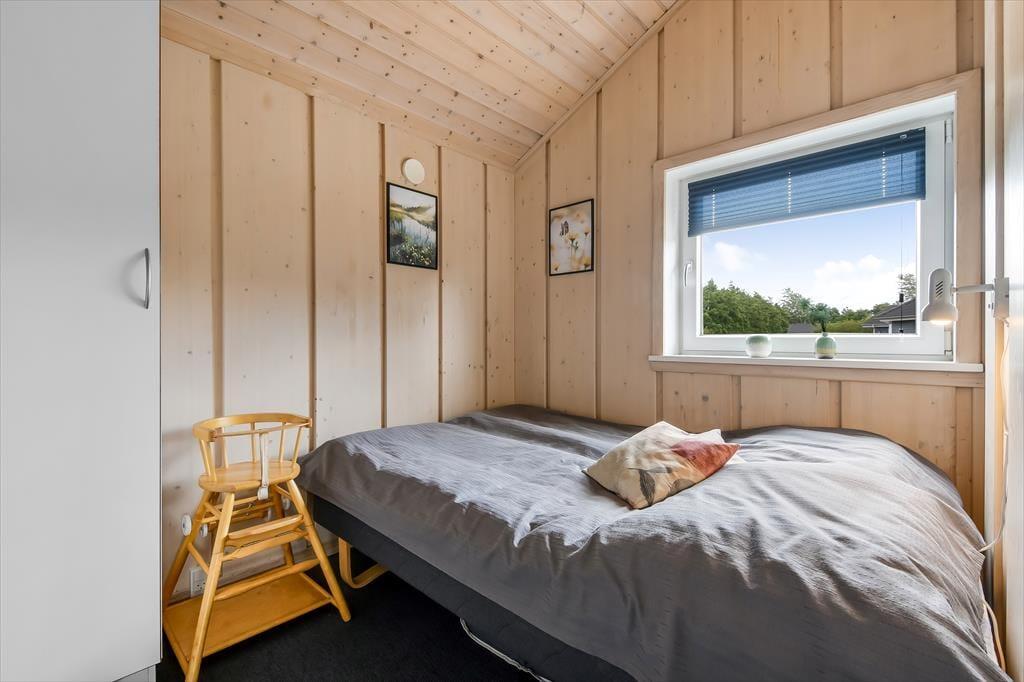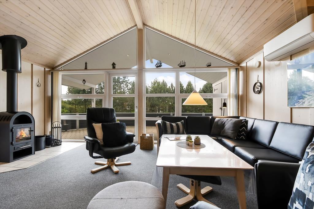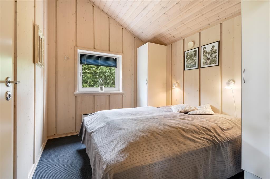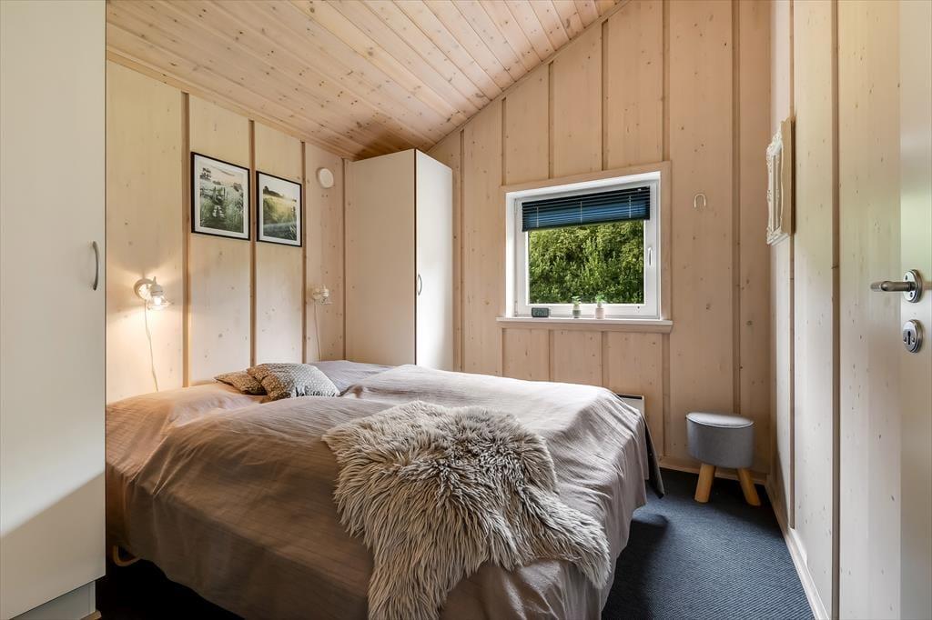 Sommerhuset er et kønt og velindrettet eksemplar, der har loft til kip og lys træbeklædning på væggene såvel som brændeovn og komfortabelt interiør. Hver eneste af husets 87 m2 er godt udnyttet, og der er sengepladser til seks personer fordelt på tre soveværelser, så hvis du gerne vil invitere bedsteforældrene eller børnenes yndlingsmoster med på ferie, kan det sagtens lade sig gøre. Et gæstetoilet ligger på praktisk vis lige ved entréen, mens det store badeværelse byder på både spabad og sauna. Det er sikkert lige noget for dig, når der rigtigt skal slappes af – med mindre du hellere vil koble af med at lave mad i det åbne køkken eller flade ud med en god film i stuens sofaafdeling.