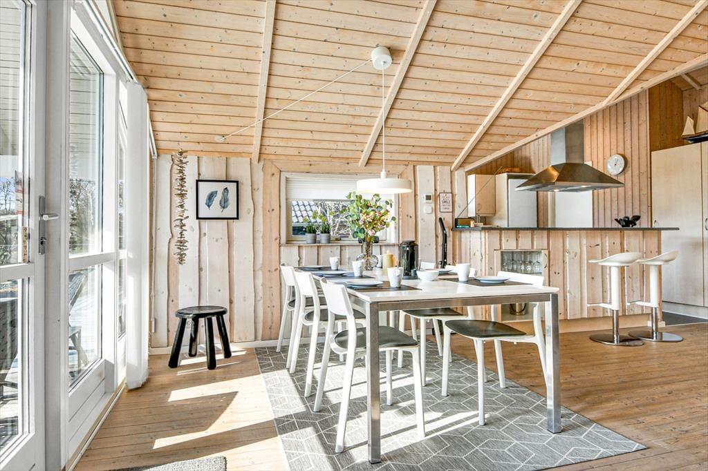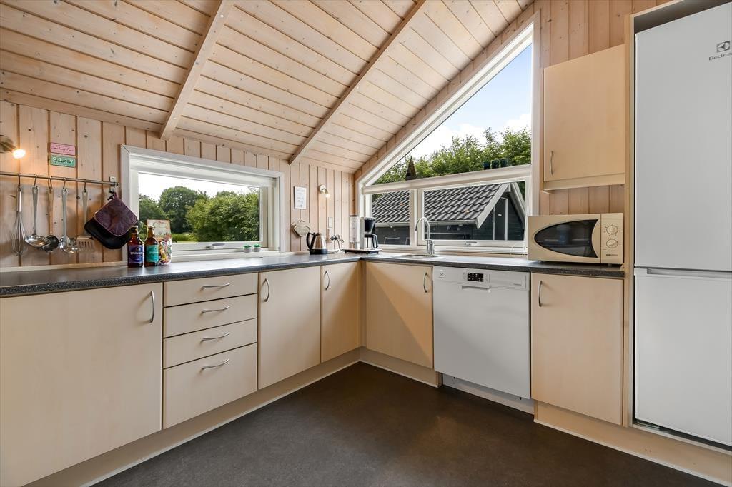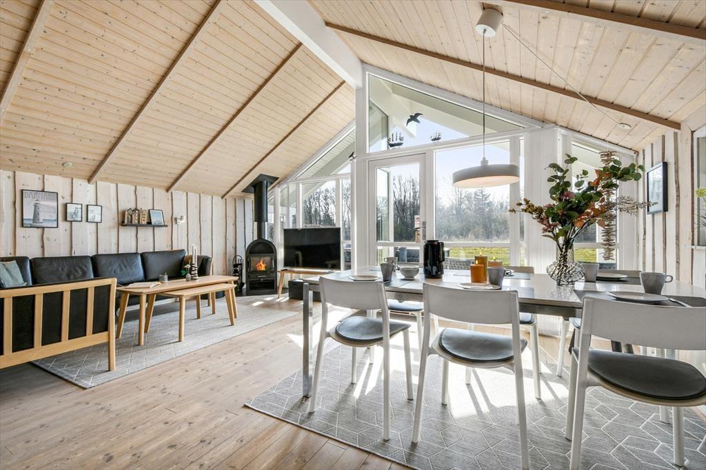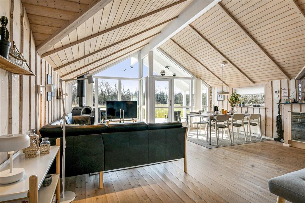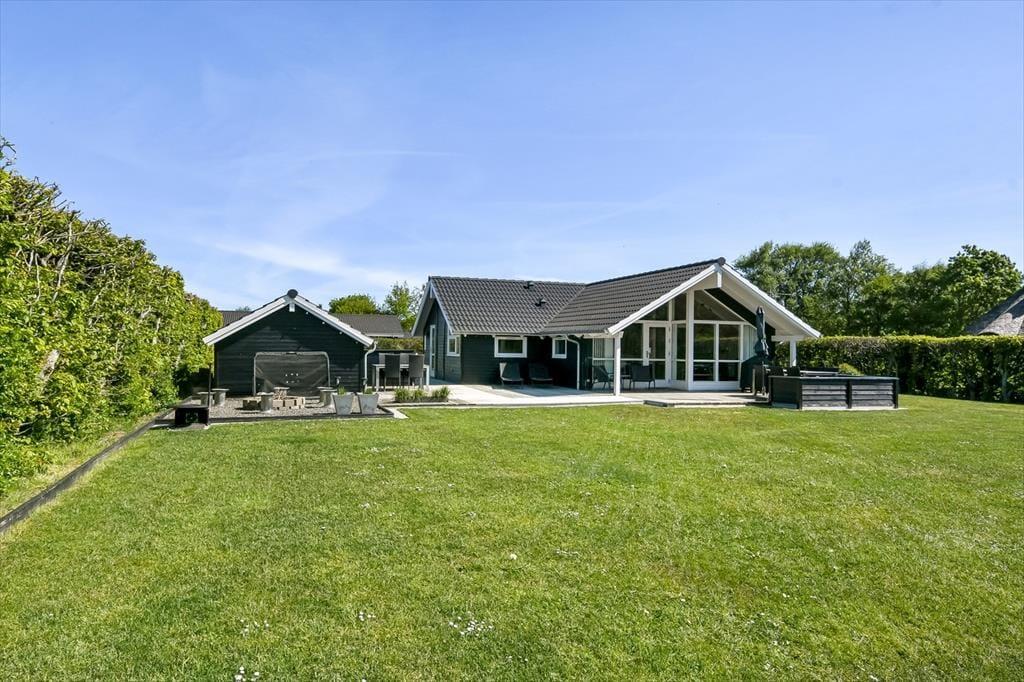 Midt på den grønne grund står sommerhuset og byder dig velkommen til en afslappende ferie. Huset har et pænt og velholdt ydre med sortmalet træfacade og hvide vinduesrammer, og inden døre er der loft til kip og lys træbeklædning på væggene, mens udsigten til haven bidrager til den rare sommerhusatmosfære. Stuen indbyder til tilbagelænede hyggestunder med varm kakao og kortspil nær brændeovnen såvel som fælles madlavning i det åbne køkken. Trænger du virkelig til at sænke skuldrene og koble helt af, kan du få en velfortjent pause i badeværelsets sauna og spabad – måske endda efterfulgt af en middagslur på et af sommerhusets tre gode soveværelser.