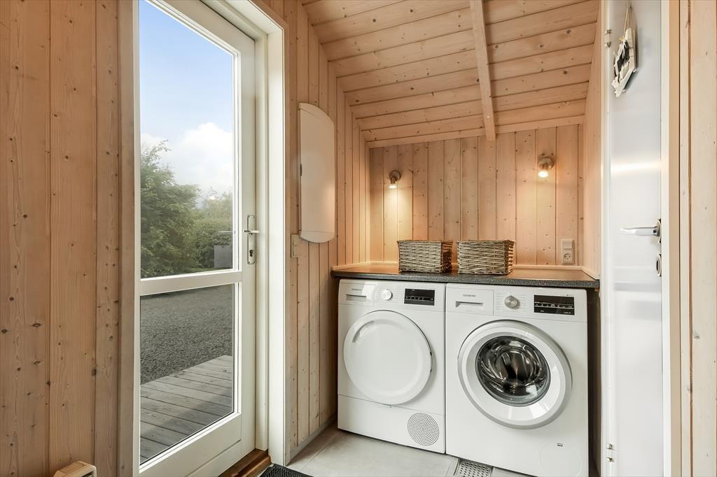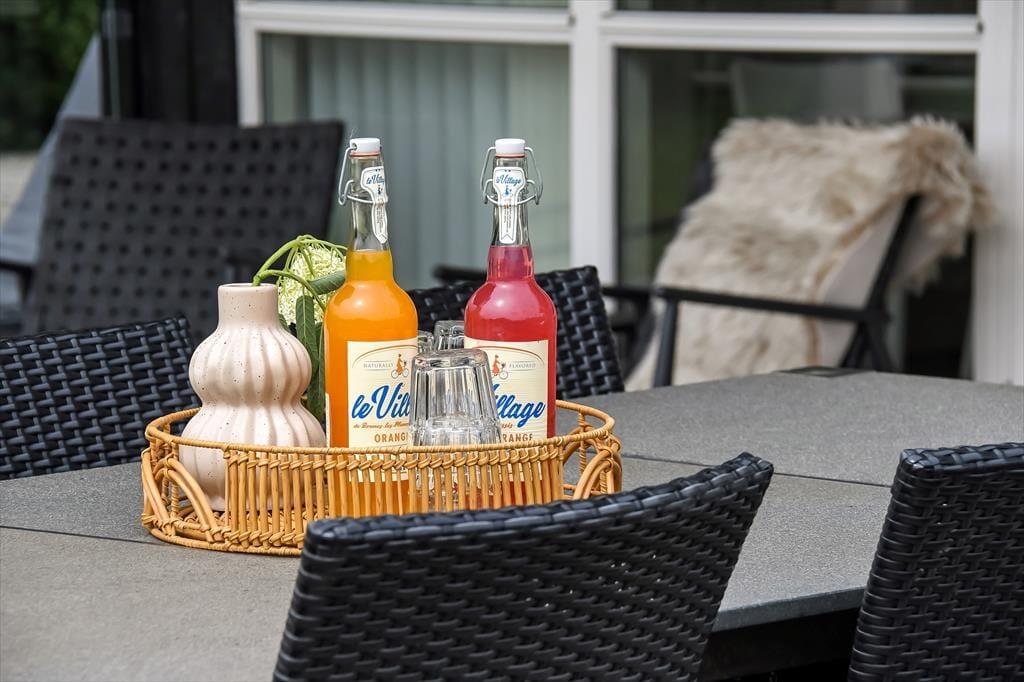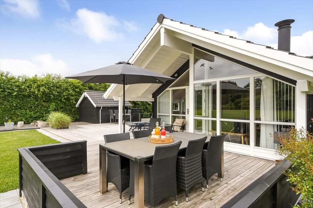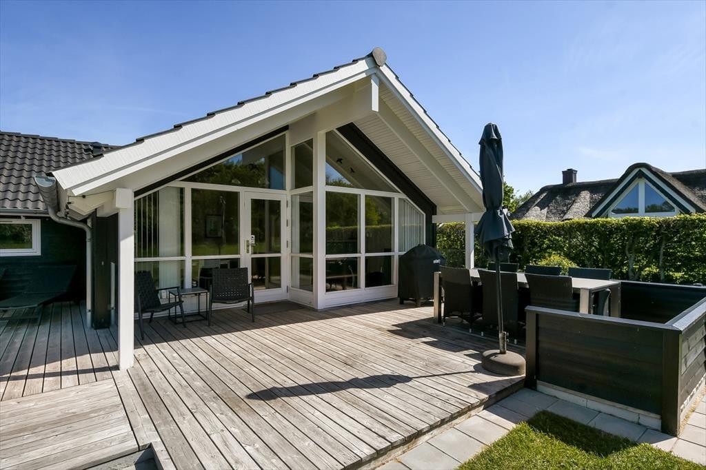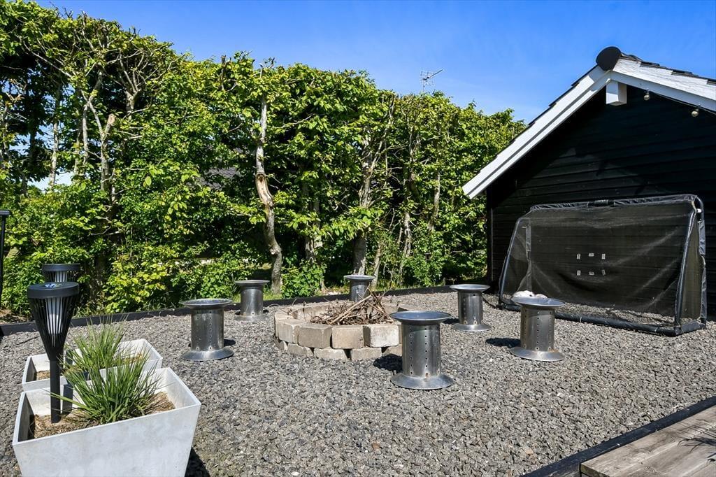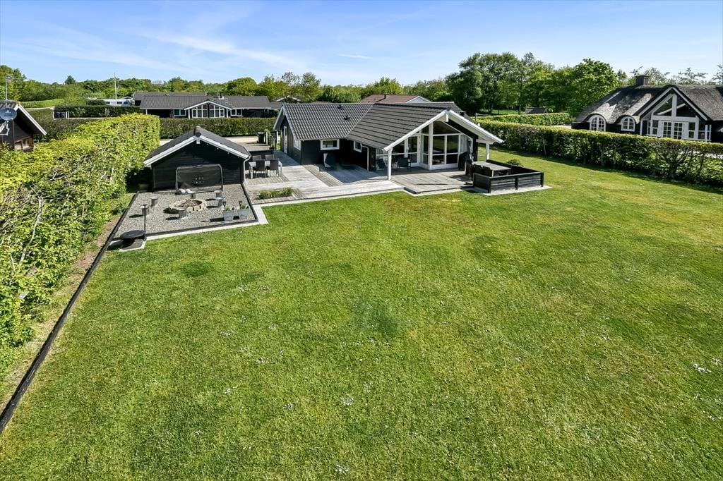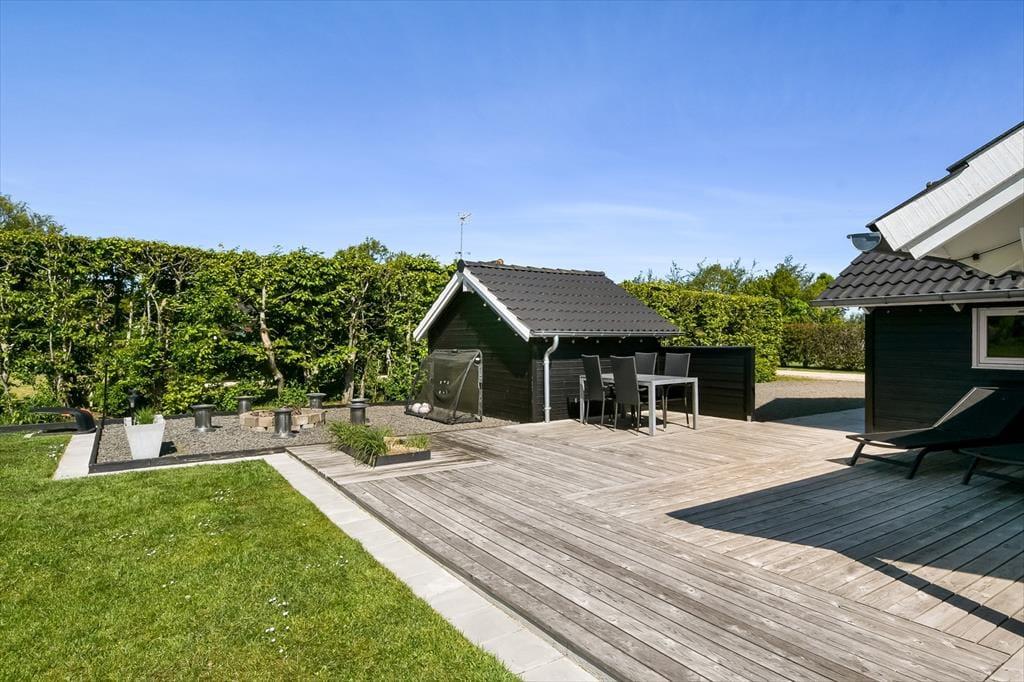 Sommerhuset ligger i bunden af et lukket vænge og med tæt beplantning ind mod de to naboer. Til gengæld er der åbent ud mod det grønne fællesareal, der breder sig mod syd, og det er skønt, hvis grundens græsplæne ikke rækker, når I vil spille fodbold eller kaste med frisbee. I læ bag udhuset ligger der et bålsted, hvor I kan bage bananer eller lave s’mores til dessert efter den friskgrillede aftensmad. Det er nu også fristende bare at blive siddende på det store og sydvedte terrassemiljø – enten under overdækningen eller helt ude med fri udsigt til den nedadgående sol og de første stjerner på aftenhimlen.