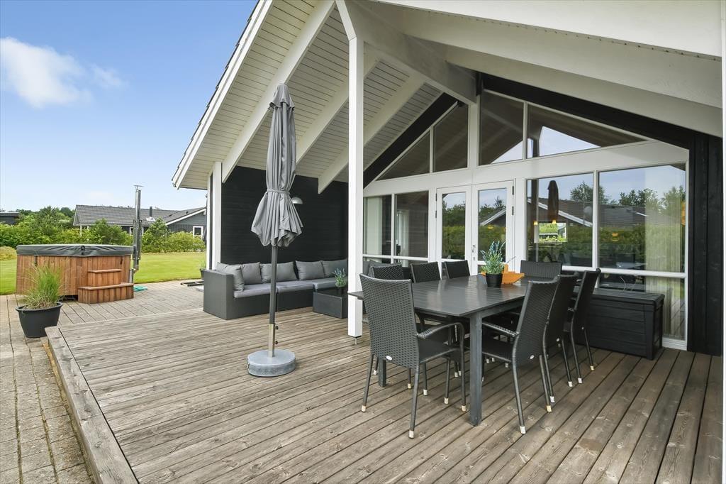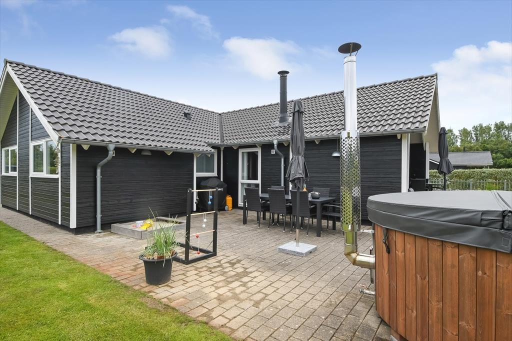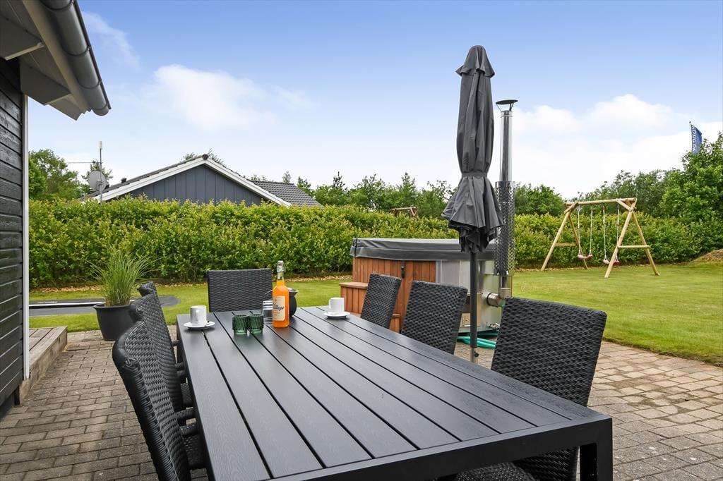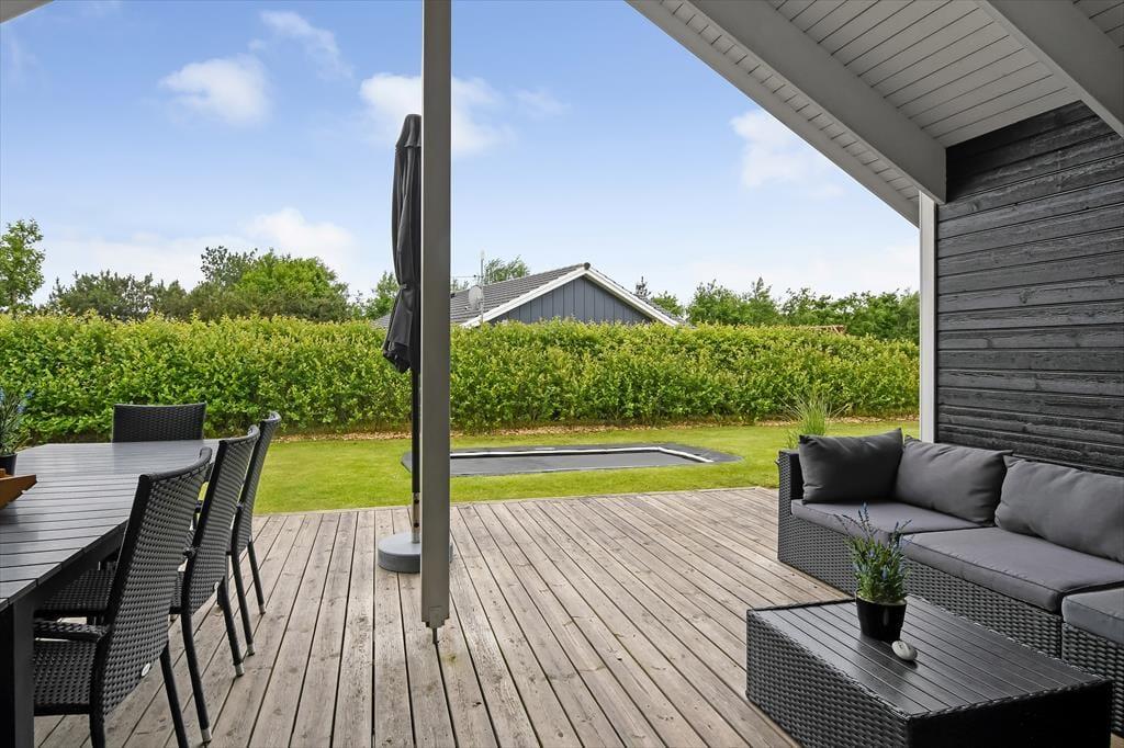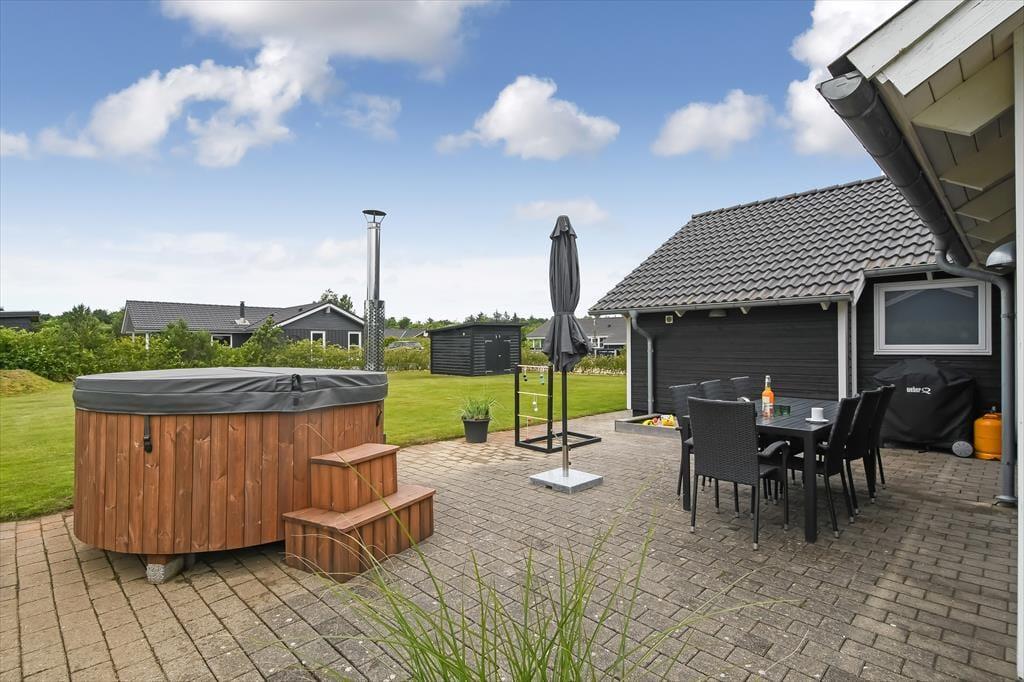 Som vi allerede har slået an i introen, fortsætter de fine ferieforhold ude i det fri. Foran huset er der et grusbelagt parkeringsareal og en lille græsplæne, mens der er meget mere plads at boltre sig på i den lukkede baghave. Vil du kaste med frisbee eller spille bold med børnene, gælder det bare om at komme op af havestolen – og hvis du trænger mere til at blive siddende, kan du læne dig tilbage og nyde driverlivet på husets skønne terrasse, mens de yngste familiemedlemmer giver den gas på trampolinen. Gasgrillen gør det nemt og bekvemt, når I vil tilberede aftensmaden ude i det fri, og hvis du vil have en aldeles afslappende afslutning på dagen, er det perfekt at have et lækkert vildmarksbad stående på terrassen.