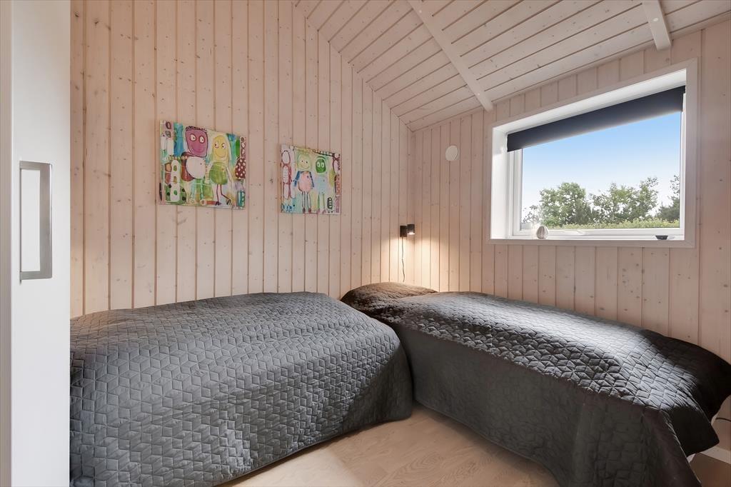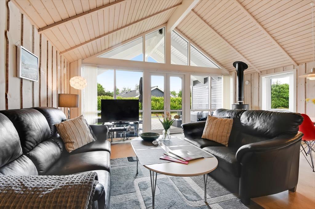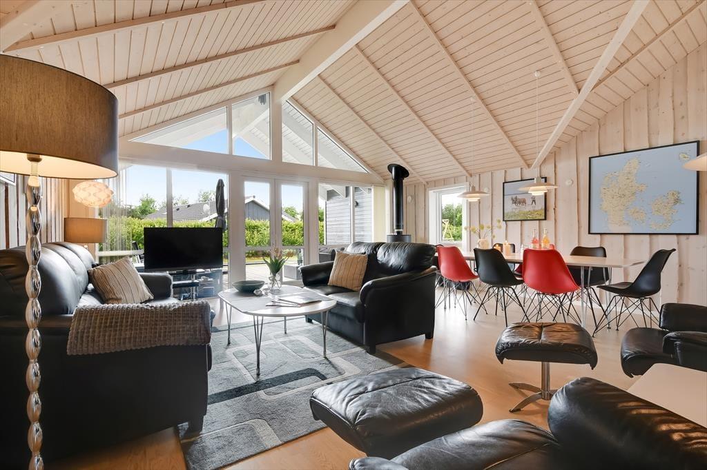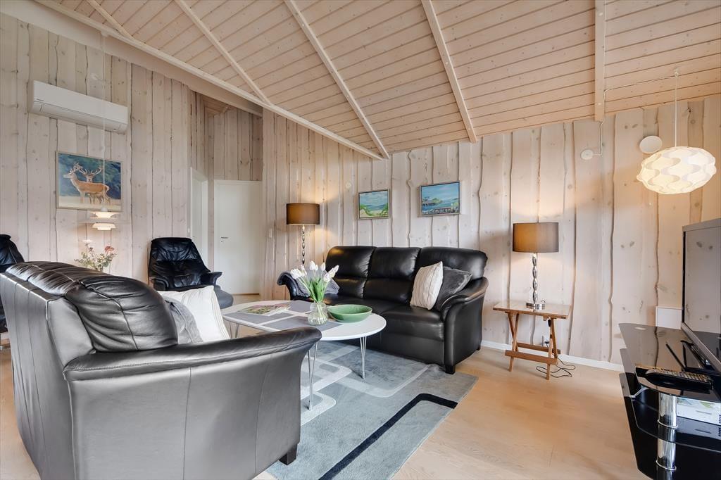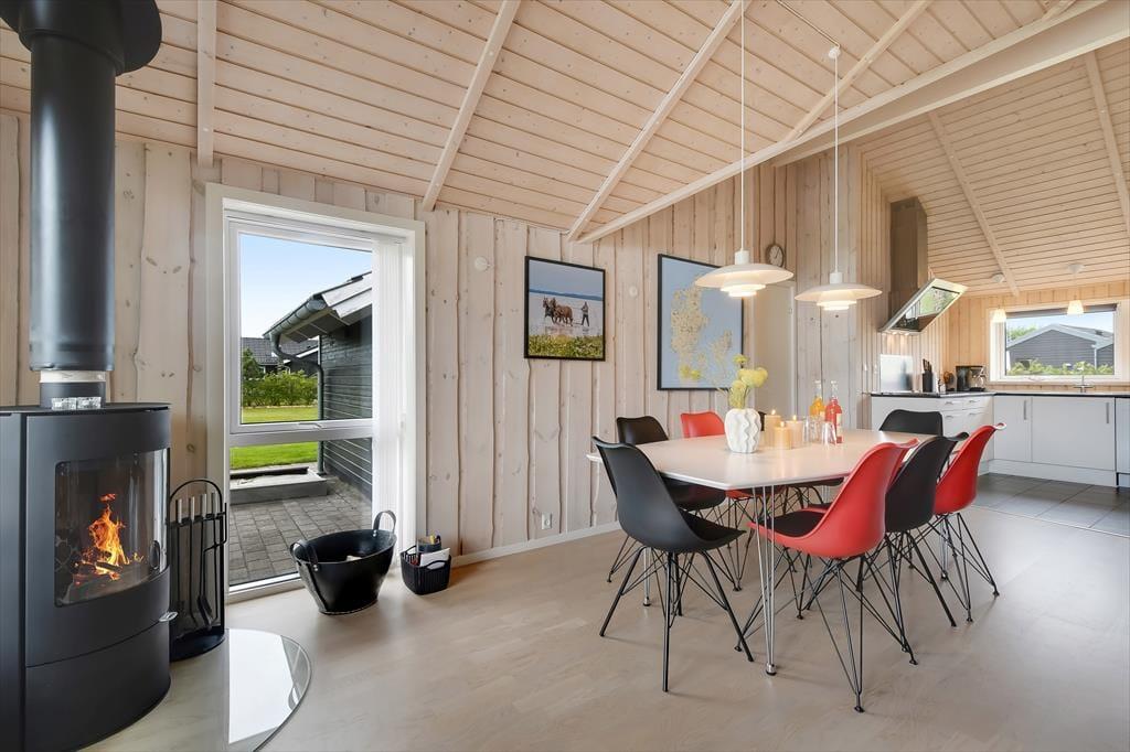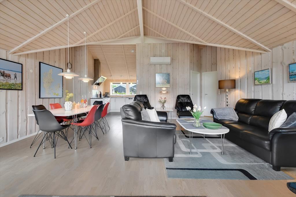 Sommerhuset er med sine 111 m2 dejligt rummeligt, og takket være den veludformede planløsning kan bedsteforældrene eller vennerne sagtens komme med familien på ferie. På de fire soveværelser er der sengepladser til otte personer, og værelserne er endda opdelt i to afsnit med hver sit badeværelse, så to børnefamilier kan ligeledes sagtens bo her sammen. Centralt i huset ligger køkken og stue forenet, og her er der skruet op for hyggestemningen, for der er brændeovn, fladskærms-tv, en komfortabel sofaafdeling og et langt spisebord, hvor I alle kan samles til en god frokost eller en overdådig middag med både forret og dessert.