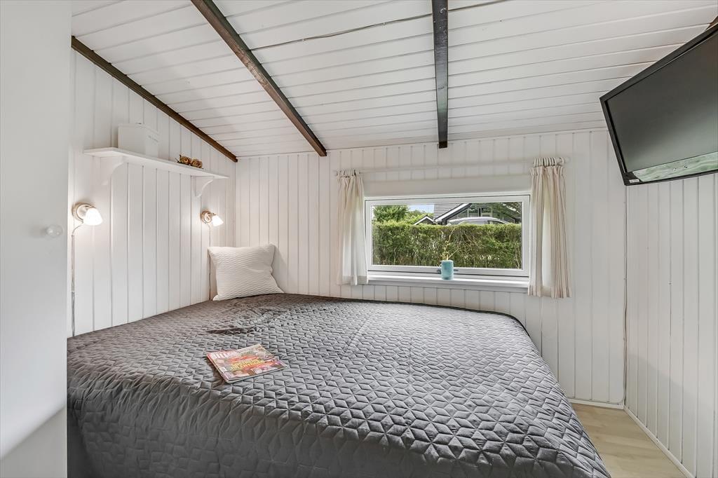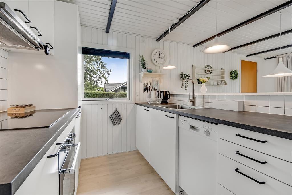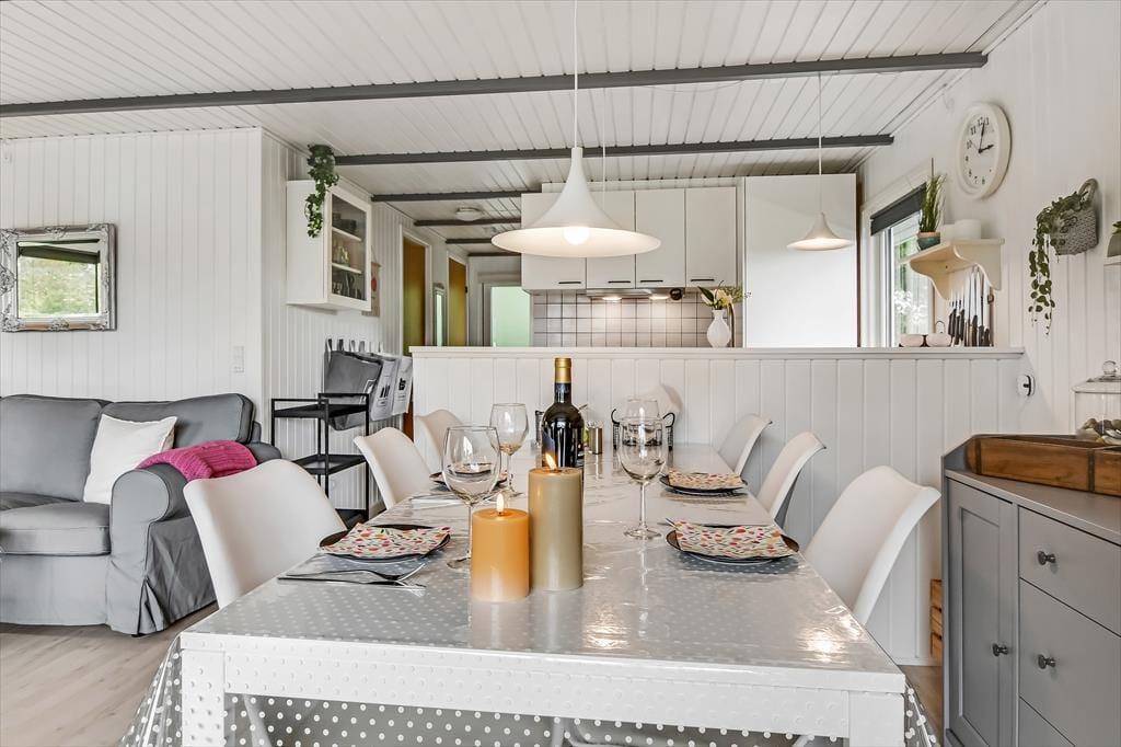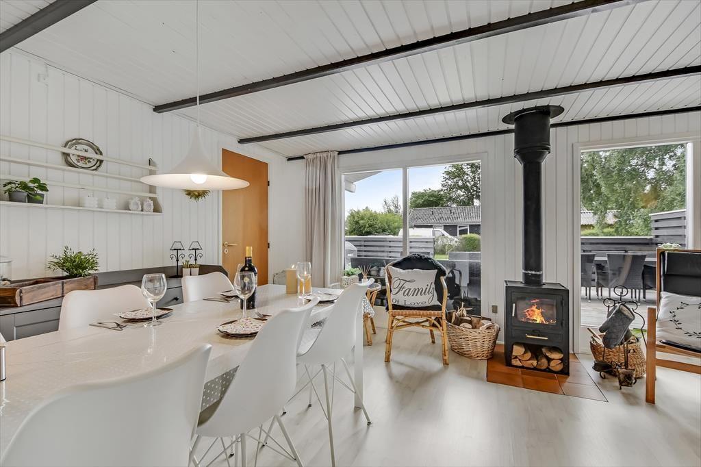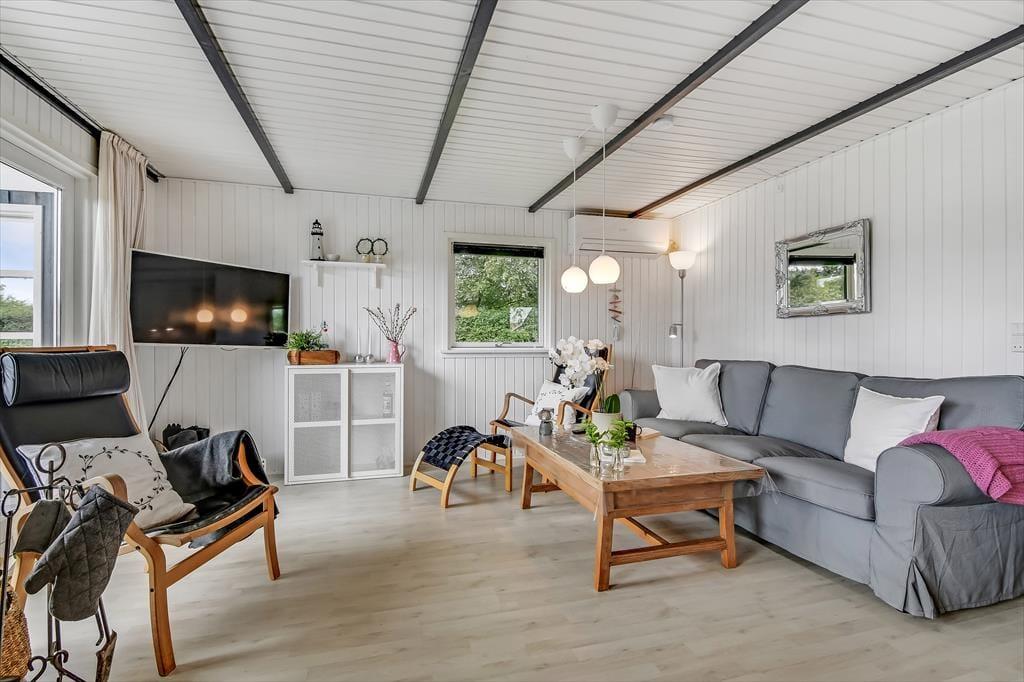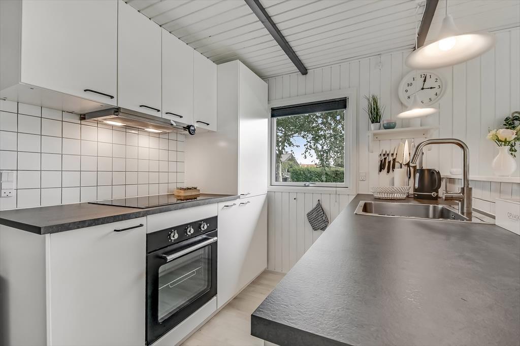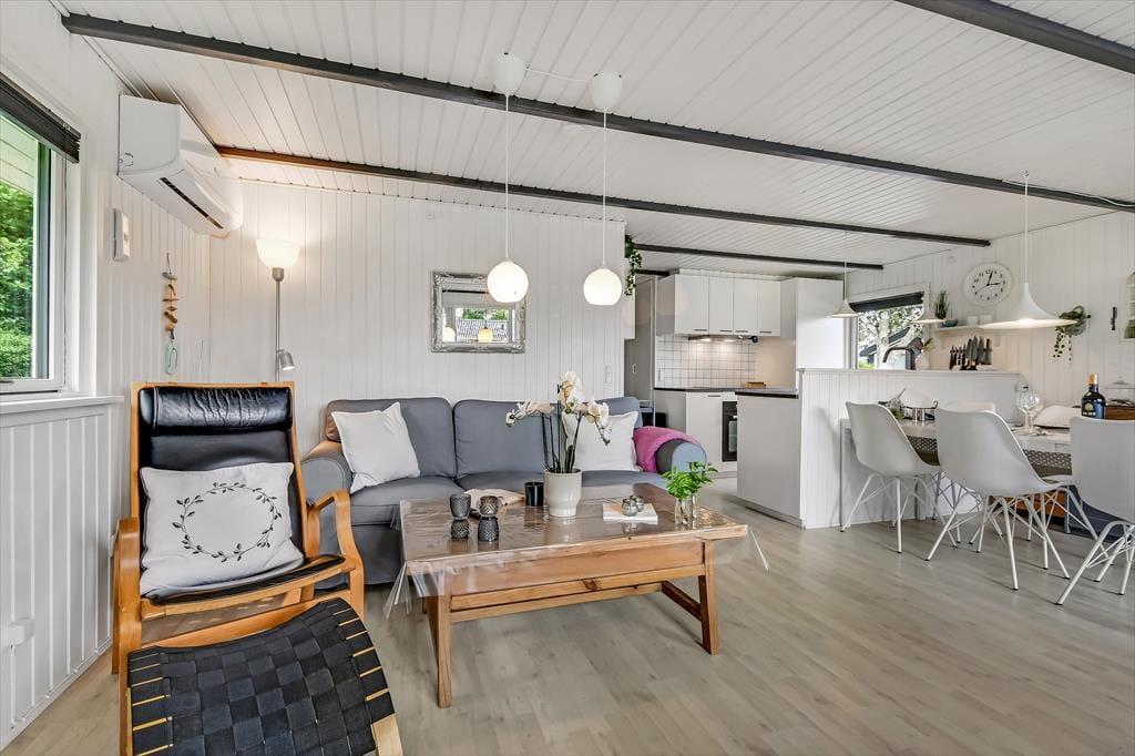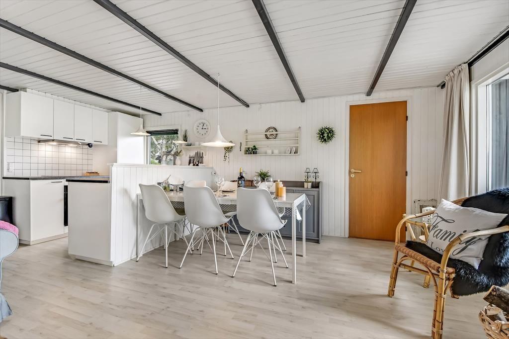 Inden døre i sommerhuset er atmosfæren lys og rar, for der er hvidmalede trælister på væggene, og møblementet er både pænt og komfortabelt. Soveværelser er der tre af, men planløsningen passer bedst til fire personer, så om natten er der altså flere fordelingsmuligheder, hvis teenageren eller andre familiemedlemmer gerne vil sove i fred. Uanset om du selv sover længe eller elsker at stå tidligt op, kan du starte dagen med et opkvikkende brusebad på badeværelset, inden du går i gang med at brygge kaffe og finde noget godt at spise frem i det veludstyrede køkken. Netop køkkenet ligger i åben forbindelse med stuen, og her får du en hyggelig ramme om boglæsning, brætspil og tv-kigning nær brændeovnen.